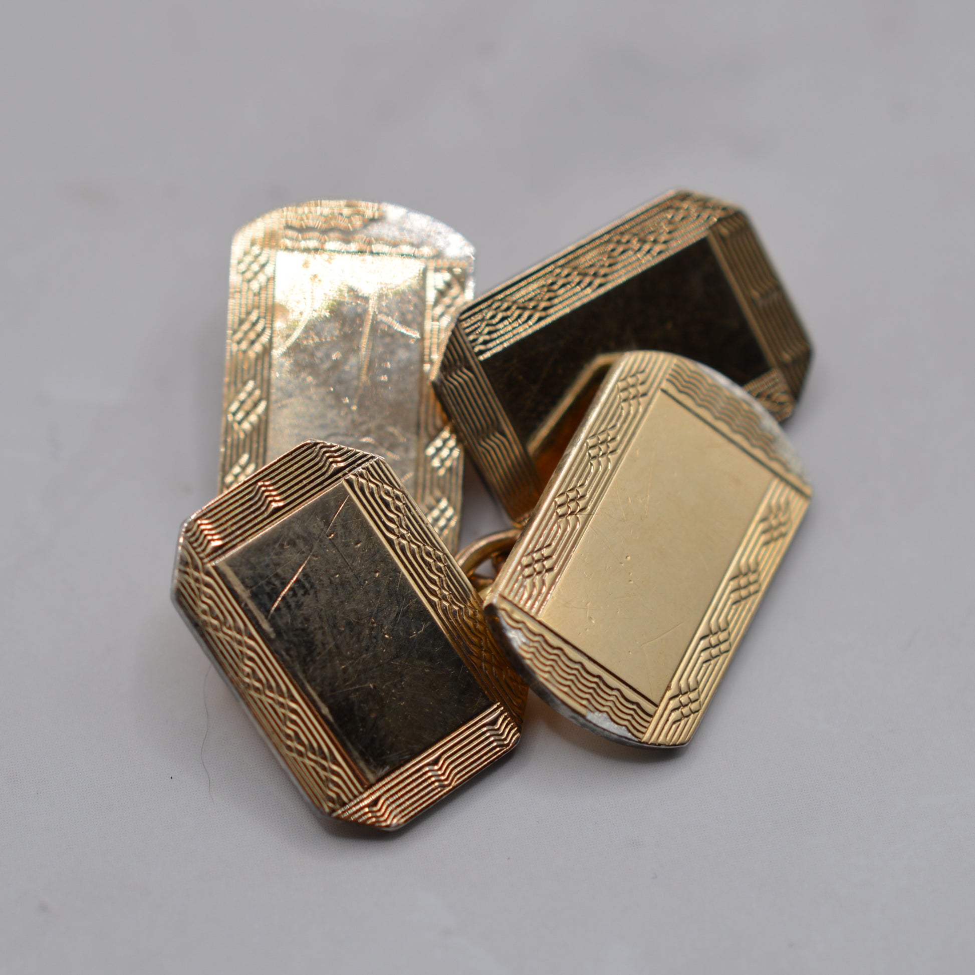 A handsome pair of antique Art Deco cufflinks in 9ct gold and silver. Each cufflink features a geometric panel design with diagonal engraved sections on two corners, horizontal stripes on the opposite corners, and a plain reflective centre -- classic Art Deco design and symmetry! The backs are stamped for 9ct Gold & Silver with maker’s mark 'HG&S '(Henry Griffith & Sons, a jeweller active late 19th–mid 20th century), along with the model name 'SPARTA'. A fantastic and collectable pair for lovers of Deco design.