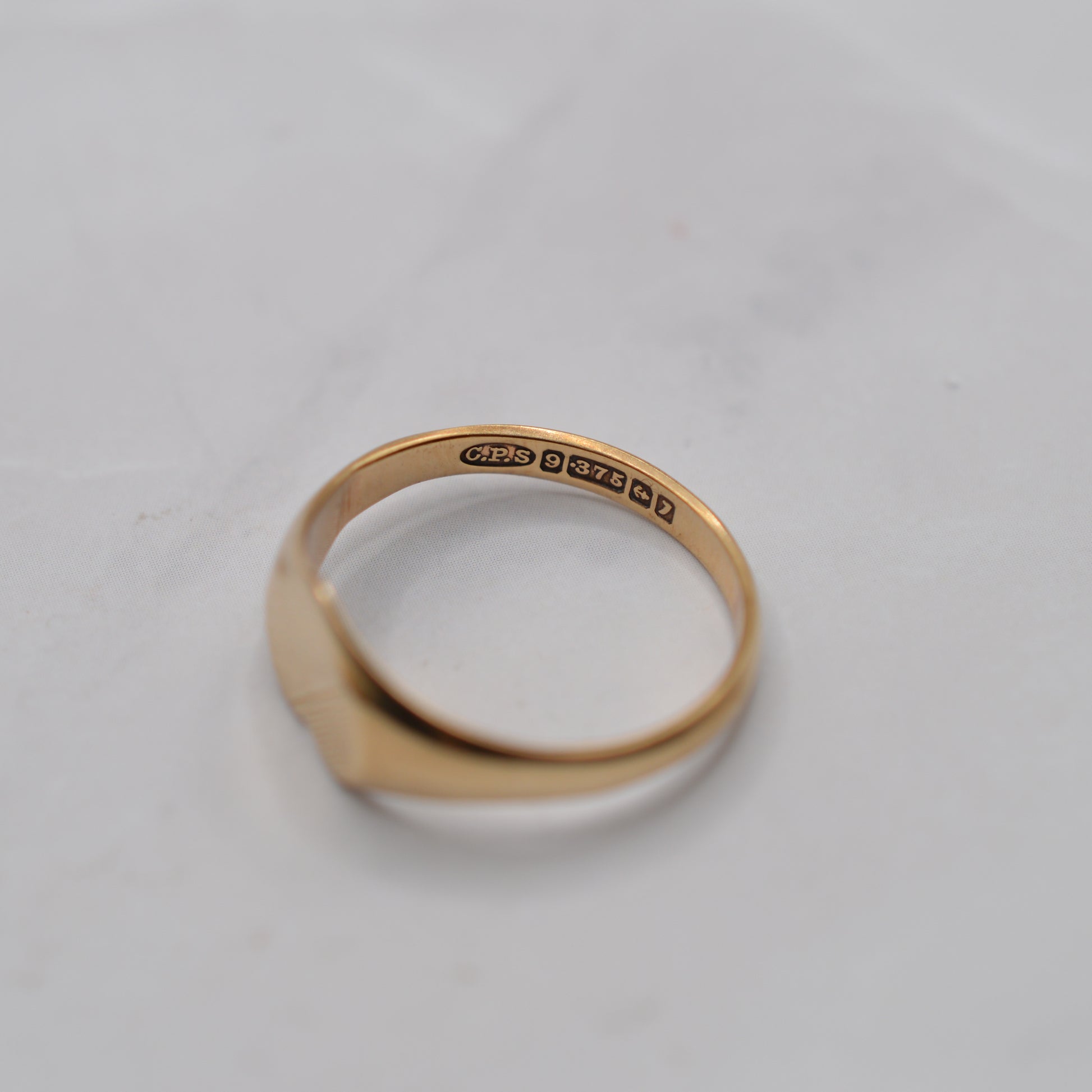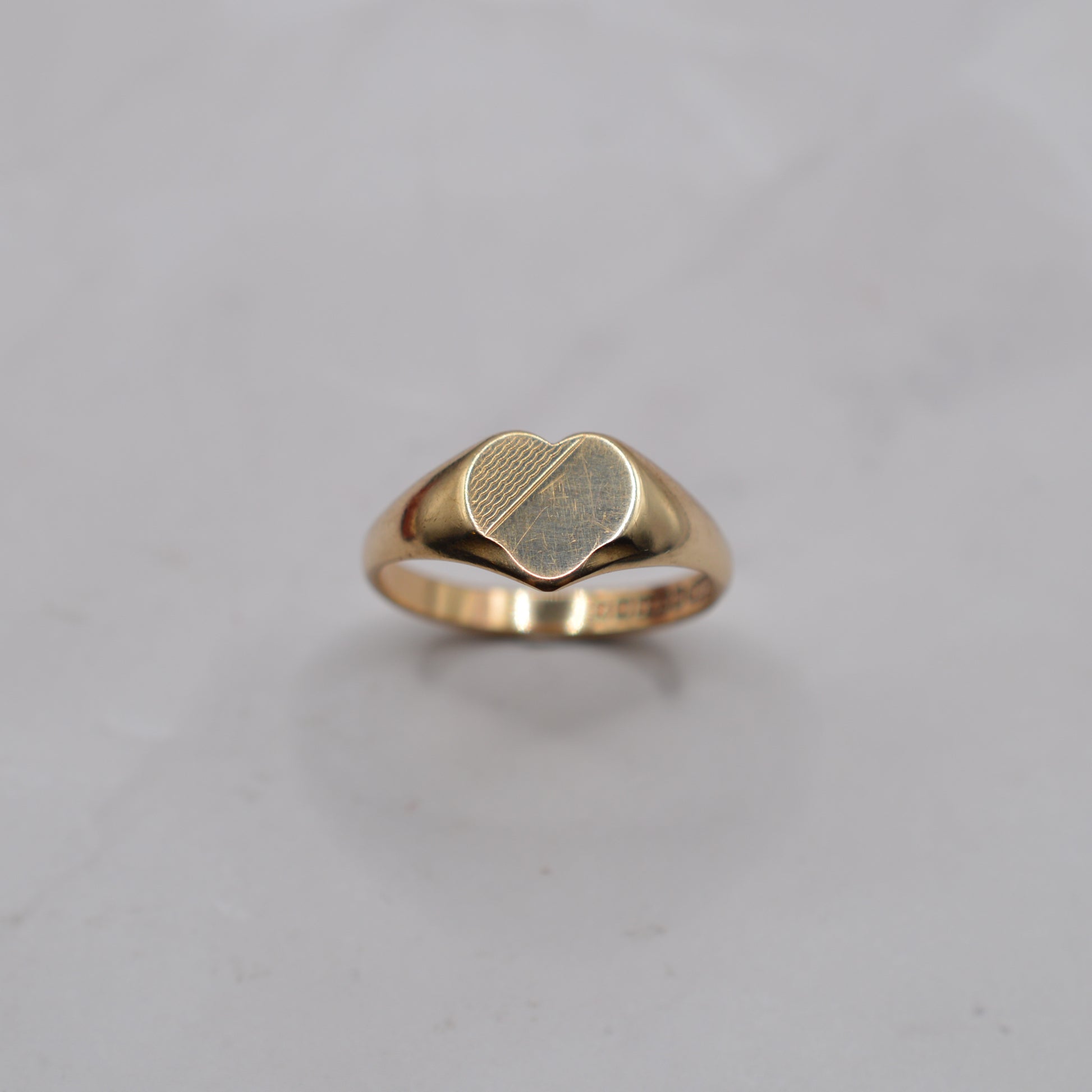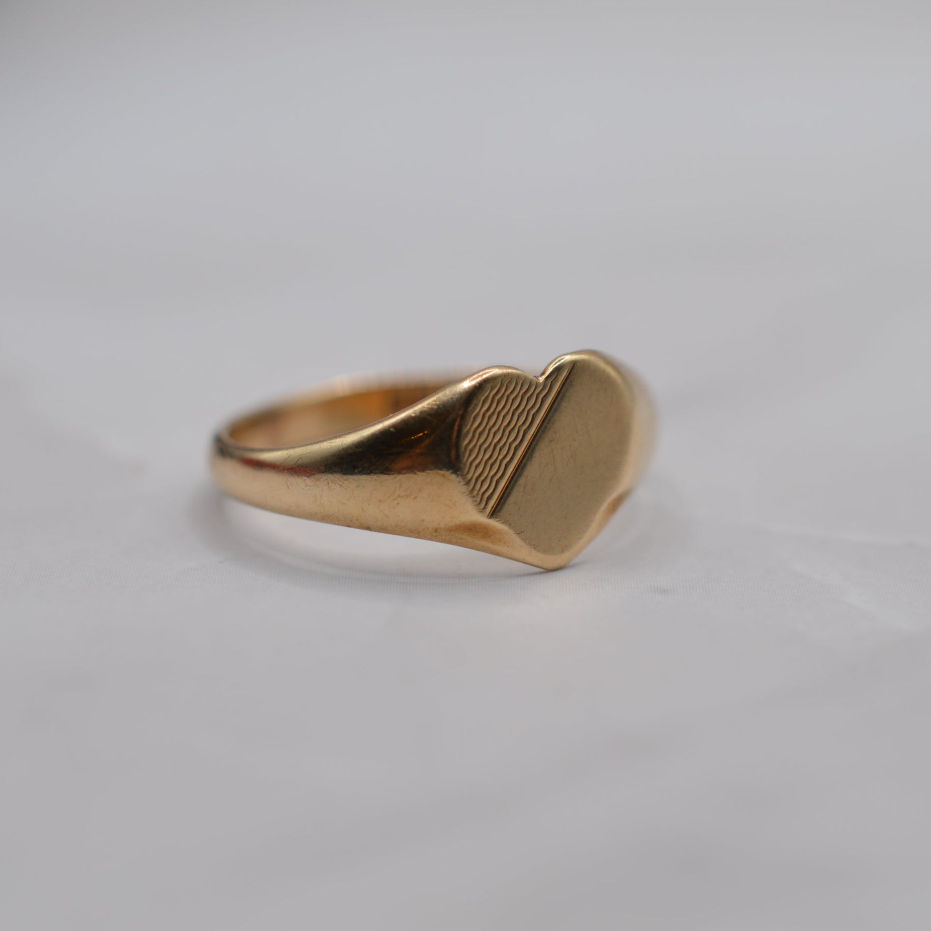 A very cute 1950s vintage 9ct gold heart signet ring, featuring a heart-shaped face with striped engine-turned detailing on one side, set in shiny yellow gold. The heart also has charming pinched detailing at the base on both sides, giving it a proper retro vibe. Heart-shaped signets are always popular -- and this one is a rare mid-century beauty <3