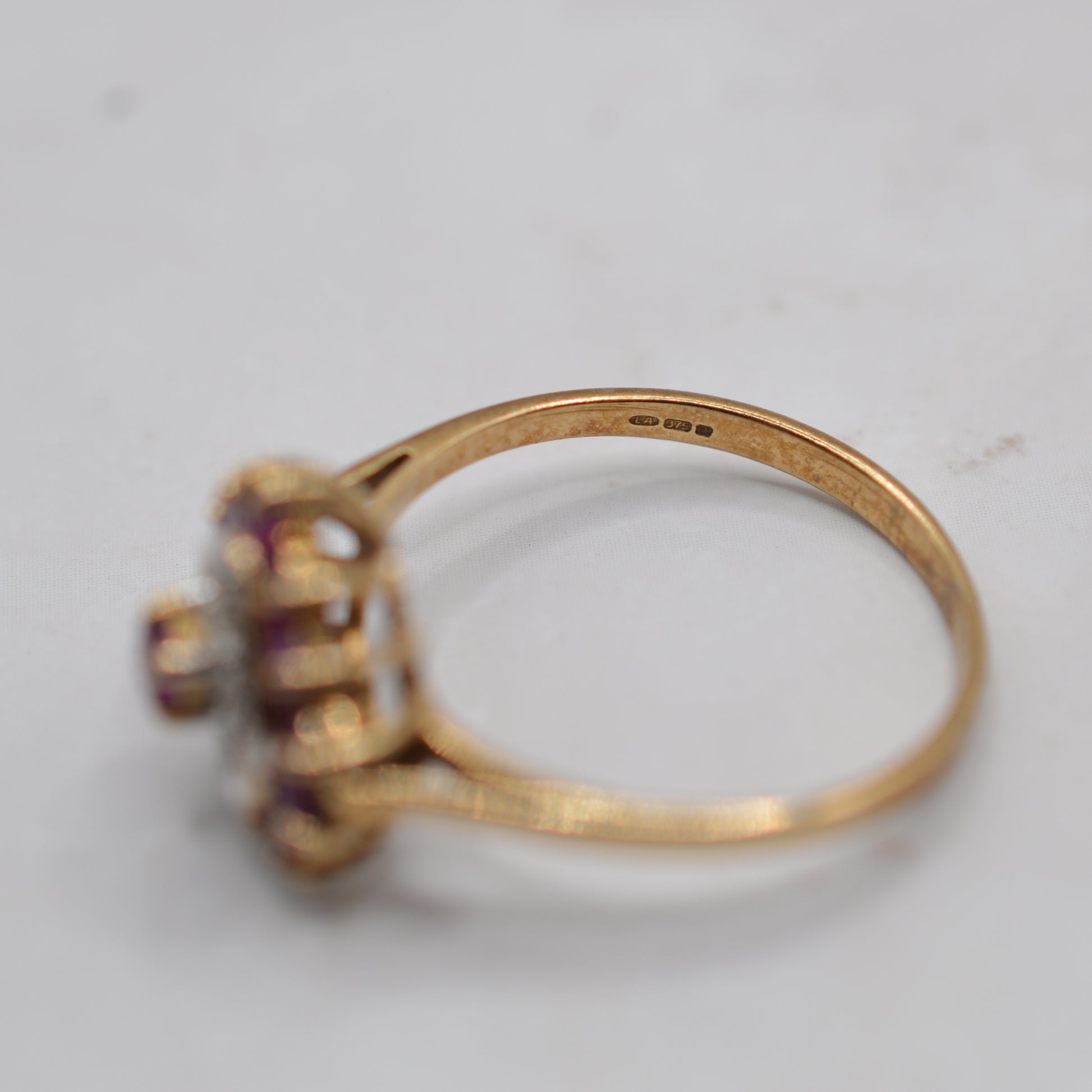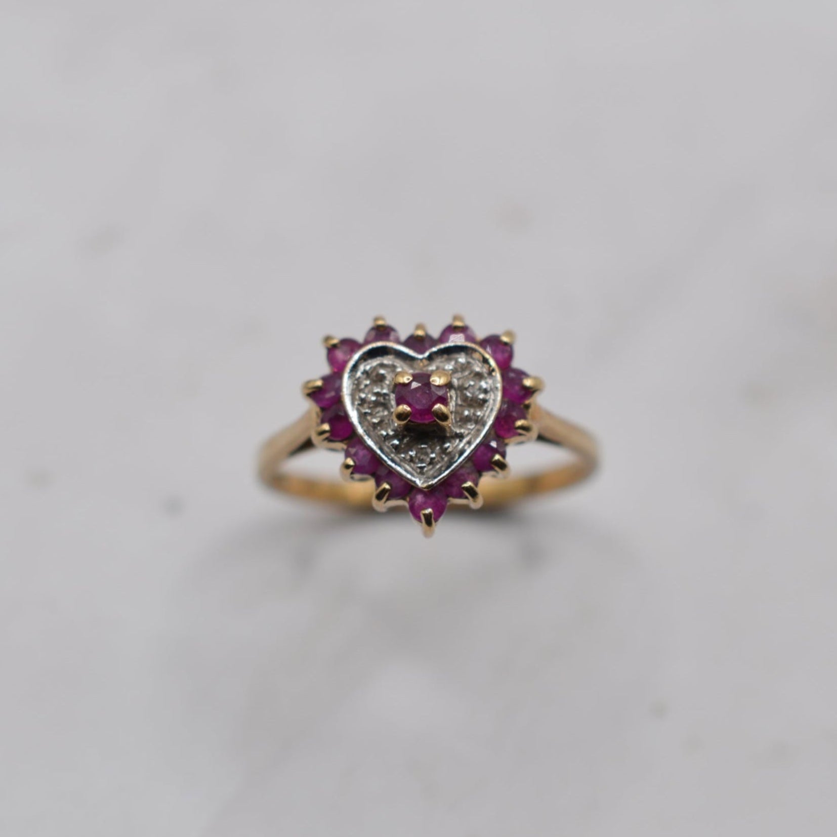 A super sweet 9ct gold ruby and diamond heart ring! 💕 This charming preloved piece features a round ruby at the centre, set within a white gold heart-shaped border dotted with little diamond chips for a subtle sparkle. The outer halo is formed of pretty pink rubies, creating a delightful cluster in a heart arrangement. Feminine, fun and with a dash of pink, it’s a gorgeous design for everyday wear or as a special romantic gift.