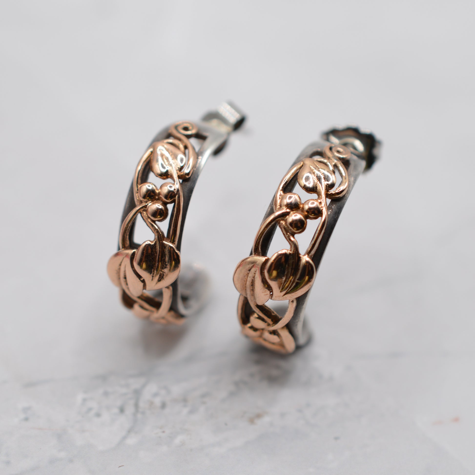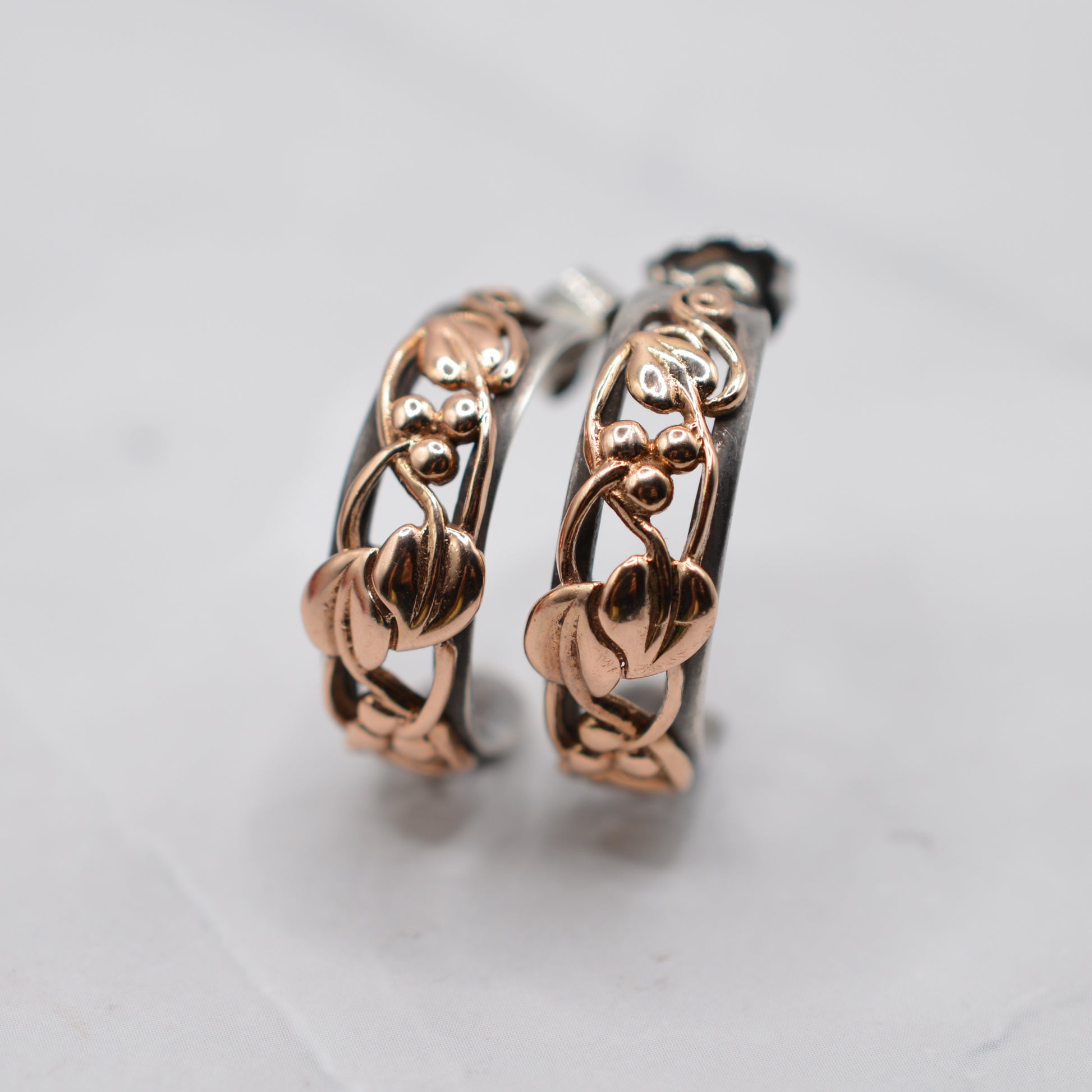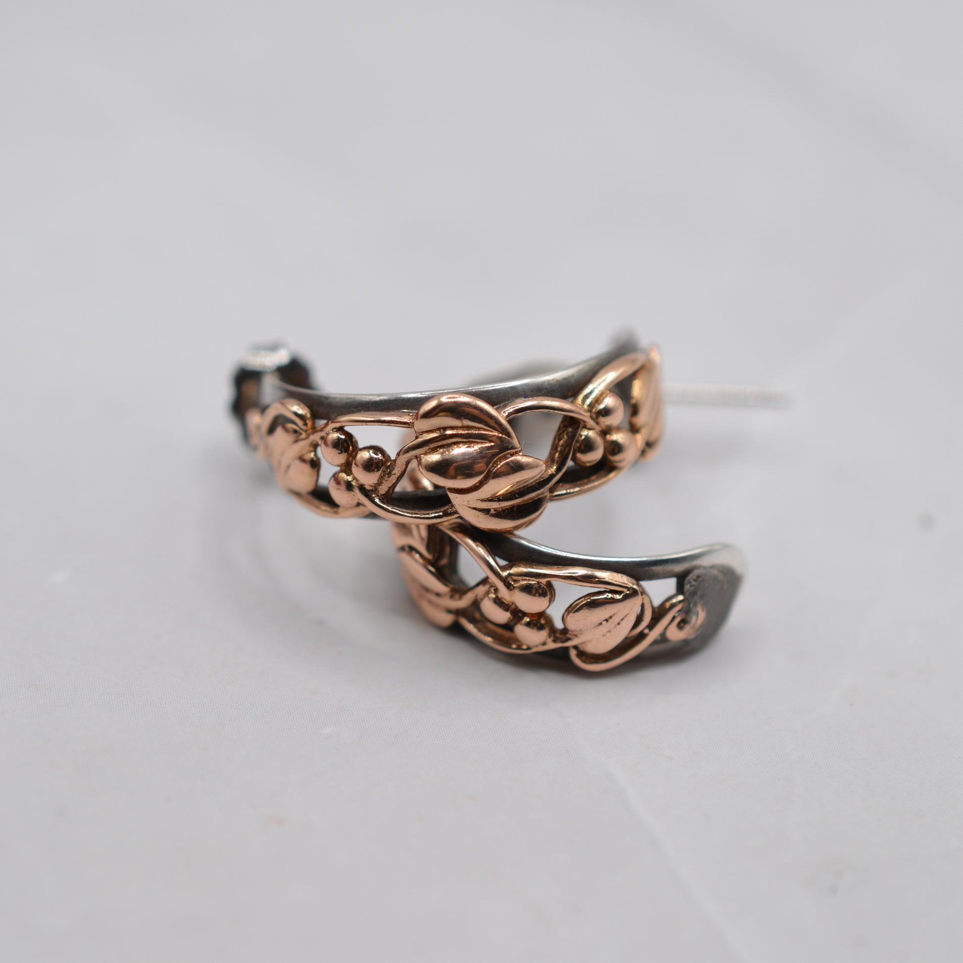 A truly fantastic pair of Clogau half-hoop earrings that feature a beautiful naturalistic foliage design (the 'Tree of Life' motif). Dating to 1997, these gorgeous pieces are of wonderful quality, offering a gorgeous blend of warm 9ct rose gold against a classic silver frame, with foliage-style details twisting up each hoop. Clogau is a renowned Welsh jewellery brand, known for its high quality craftsmanship and use of rare Welsh gold alongside organic, nature-inspired pieces -- always beautiful and always desirable!