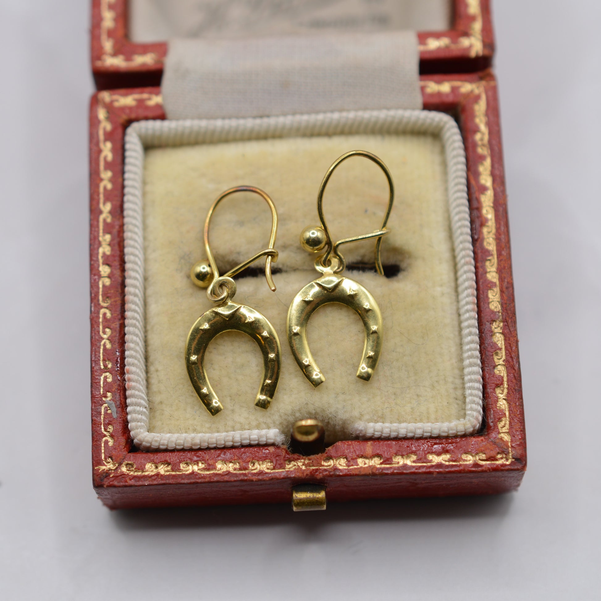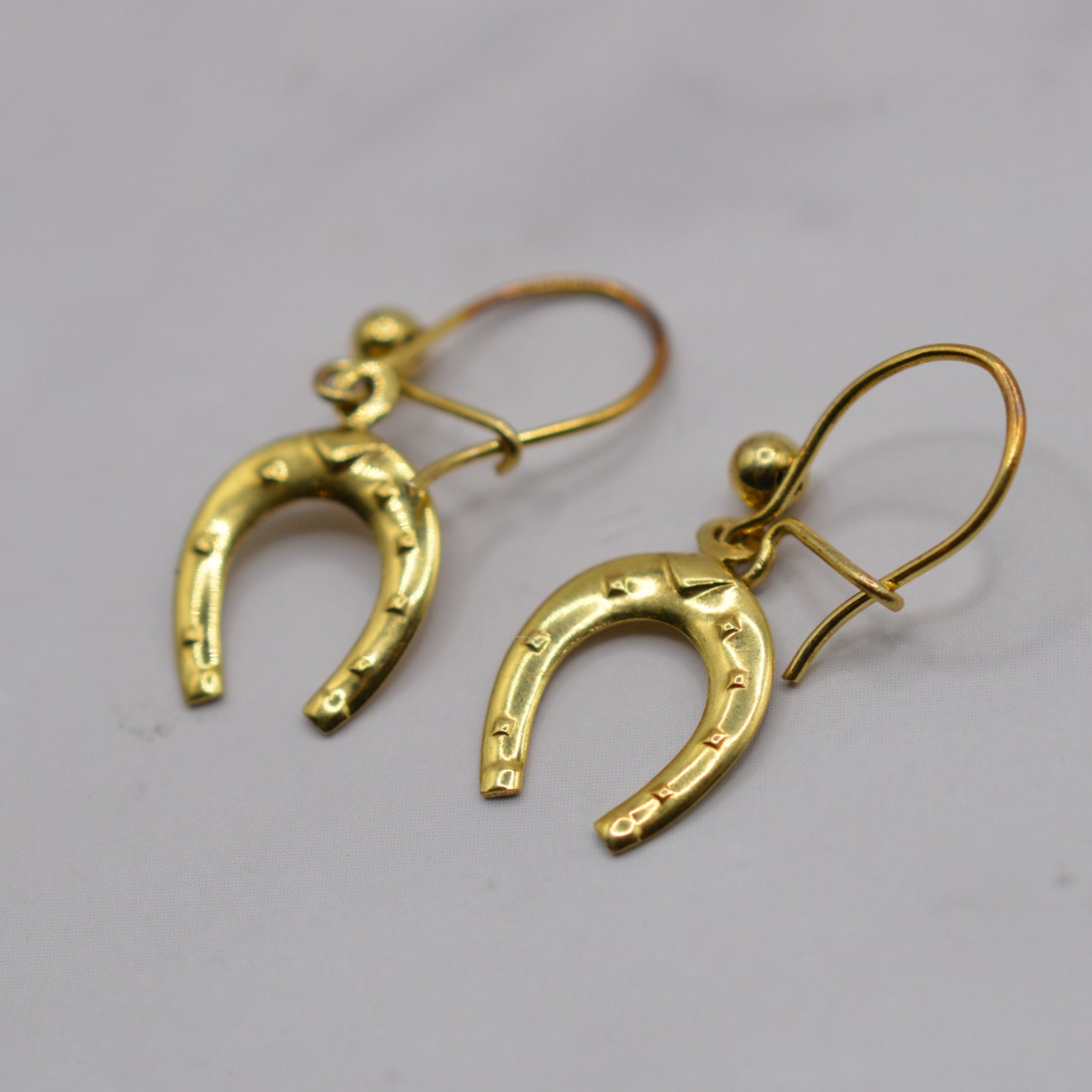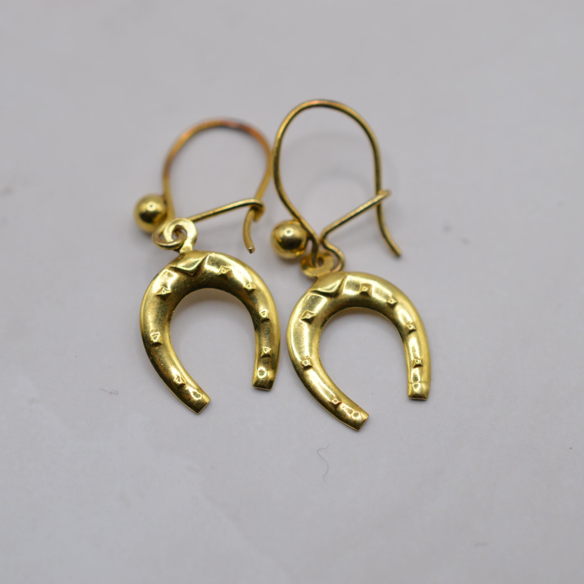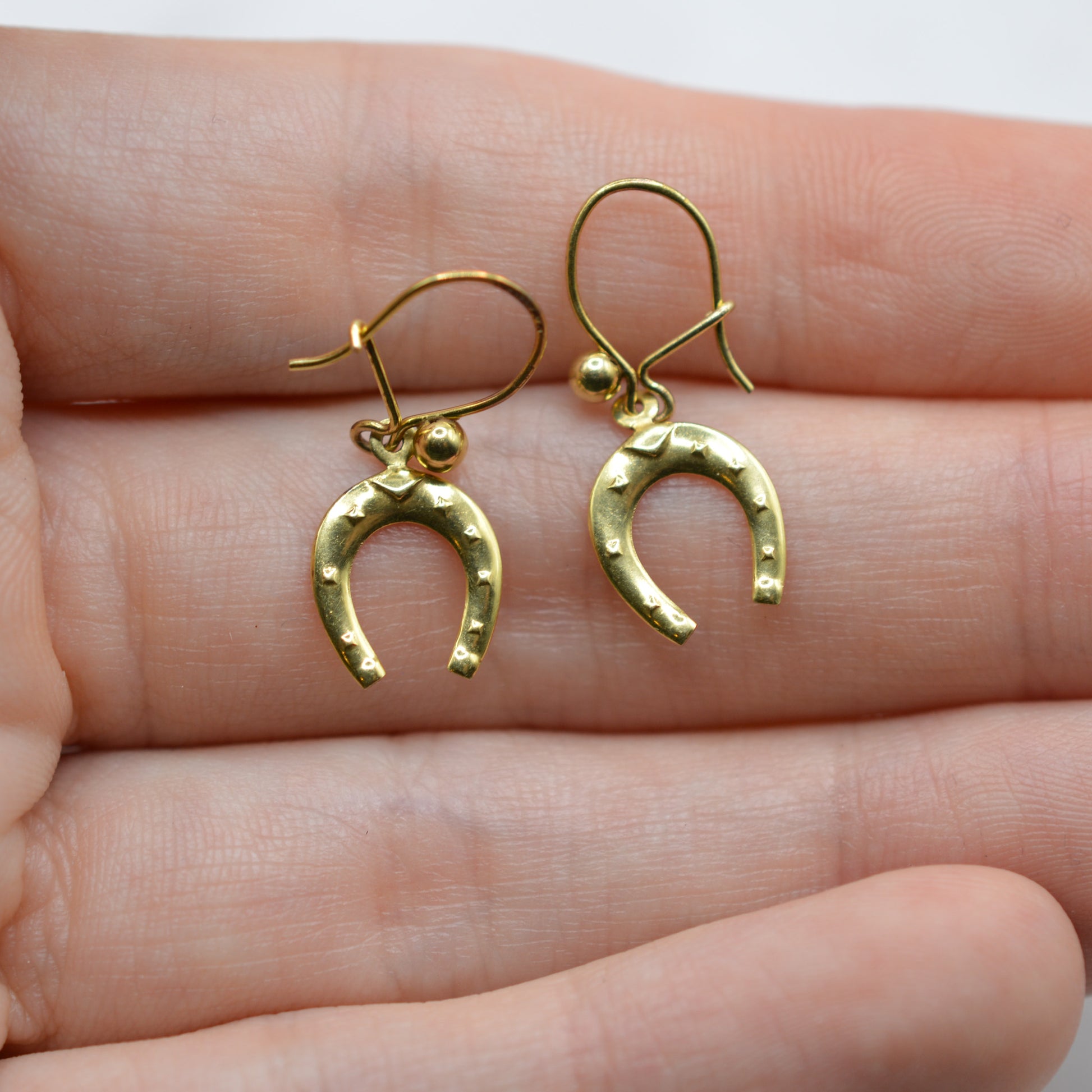 A truly adorable pair of 1970s 9ct gold horseshoe drop earrings. These charming vintage earrings feature dainty gold horseshoes suspended from curved hook fittings, with the shoes featuring little stud detailing. Perfect for fans of western, country or equestrian style -- or just anyone who loves a little vintage luck! Lightweight and easy to wear, they’re the kind of sweet, characterful piece you’ll reach for again and again.