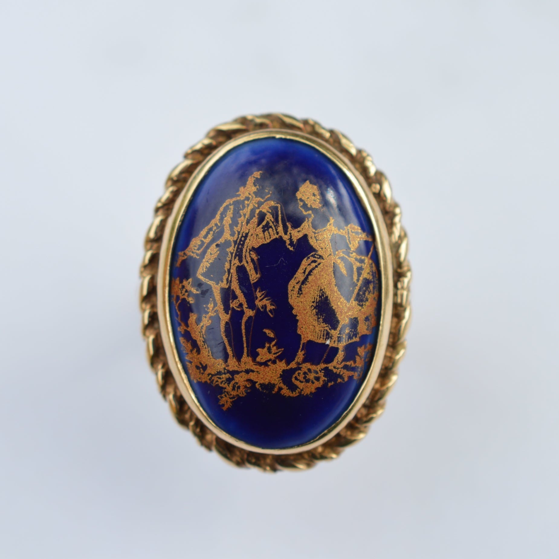 An absolutely goooorgeous and rare 1970s 9ct gold Limoges porcelain portrait ring! This captivating statement piece features an impressively large porcelain panel with a deep cobalt blue background, beautifully hand-decorated with two figures in baroque dress in a charming courtship scene. The portrait is accented with delicate gold detailing and framed by a luxurious rope-twist gold border. Eye-catching, elegant, and truly special, this is a fabulous collector’s piece.