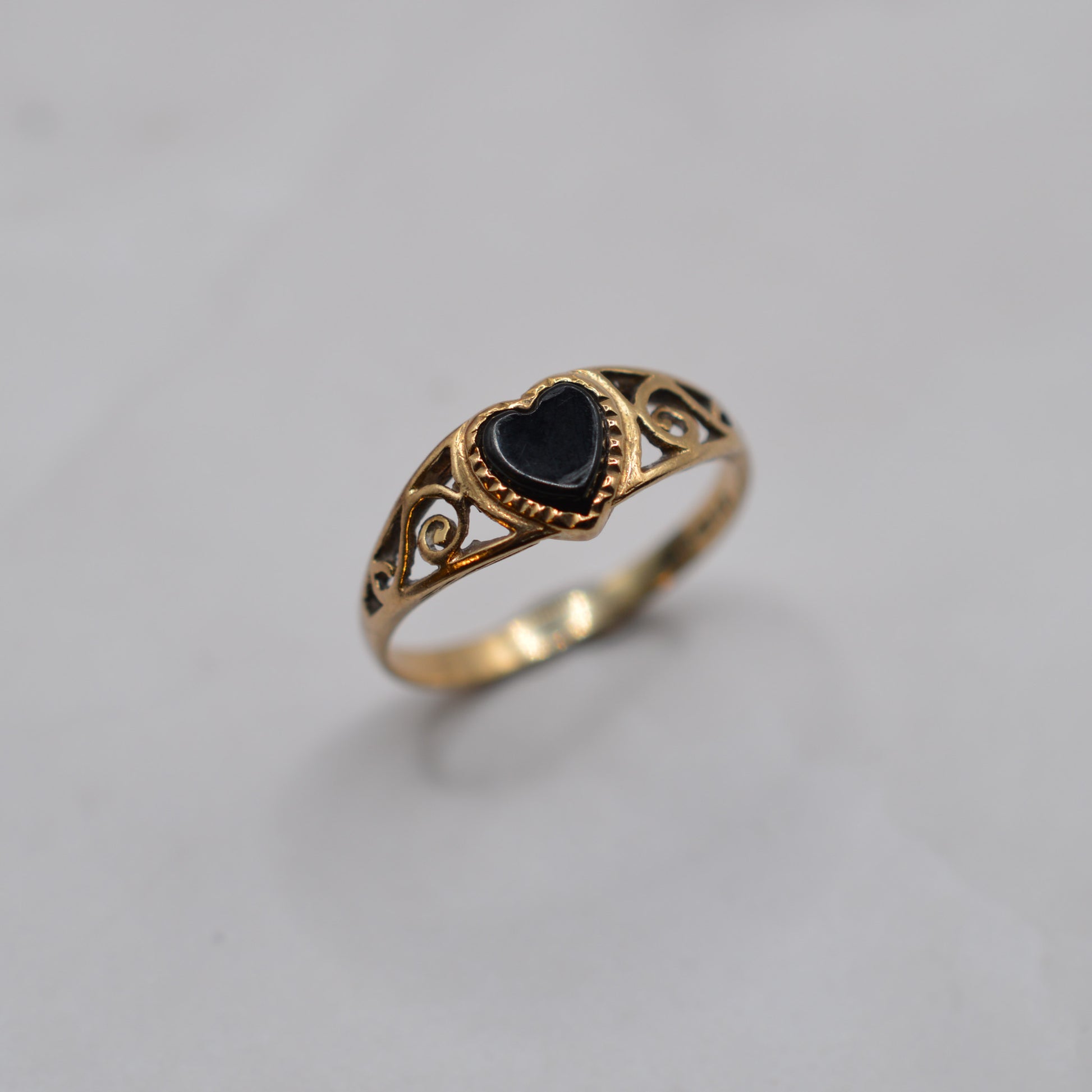 Such a perfectly romantic vintage 9ct gold onyx heart signet ring! This gorgeous 1980s piece features a black heart-shaped onyx set at the centre, framed by such cute swirl-pierced detailing along the shoulders for whimsical, gothic charm. A beautiful and alternative piece, perfect for lovers of dark academia, cottagecore or romantic vintage styles. These onyx heart signet rings are always sought after - don't miss it! <3