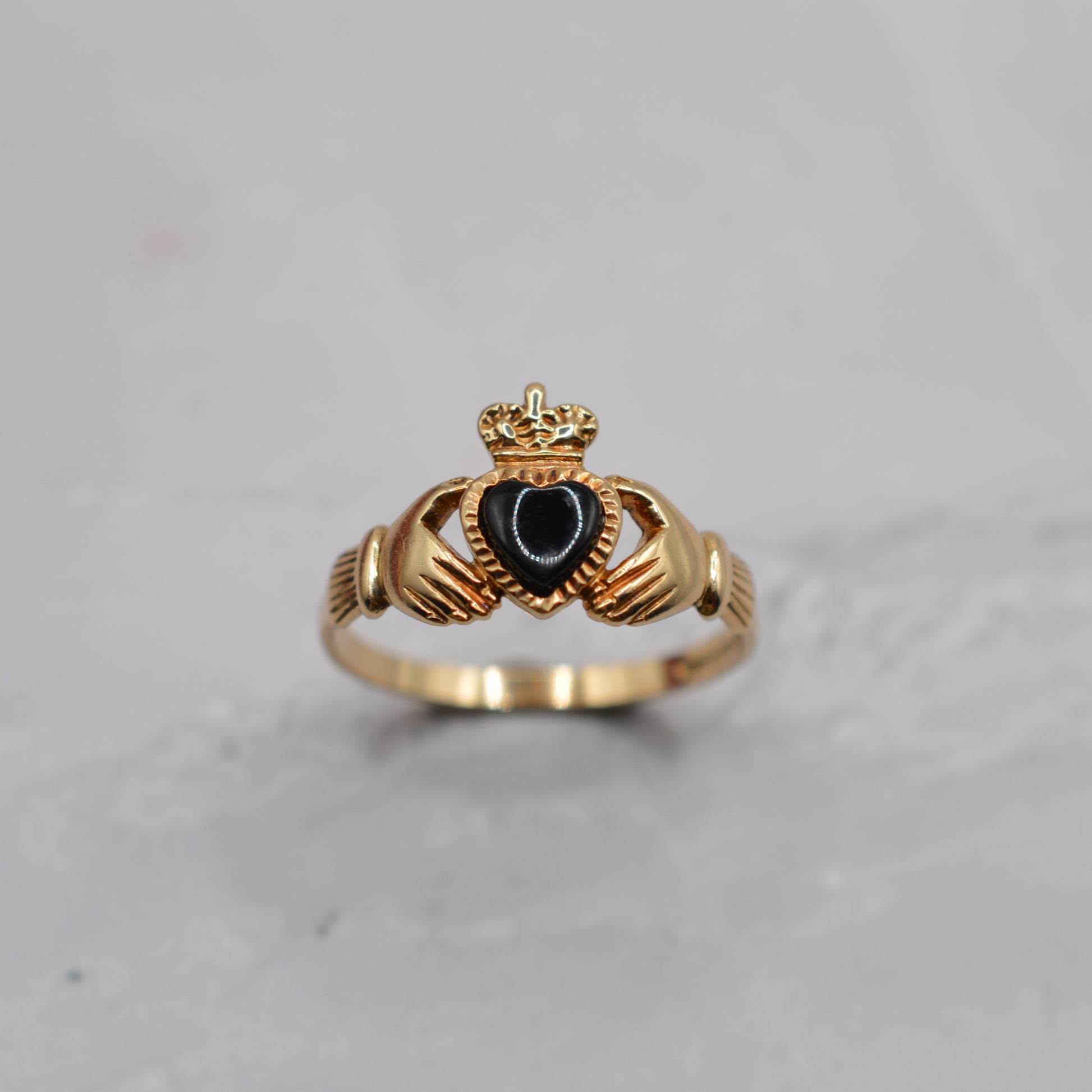 1990s Vintage 9ct Gold Onyx Heart Claddagh Ring