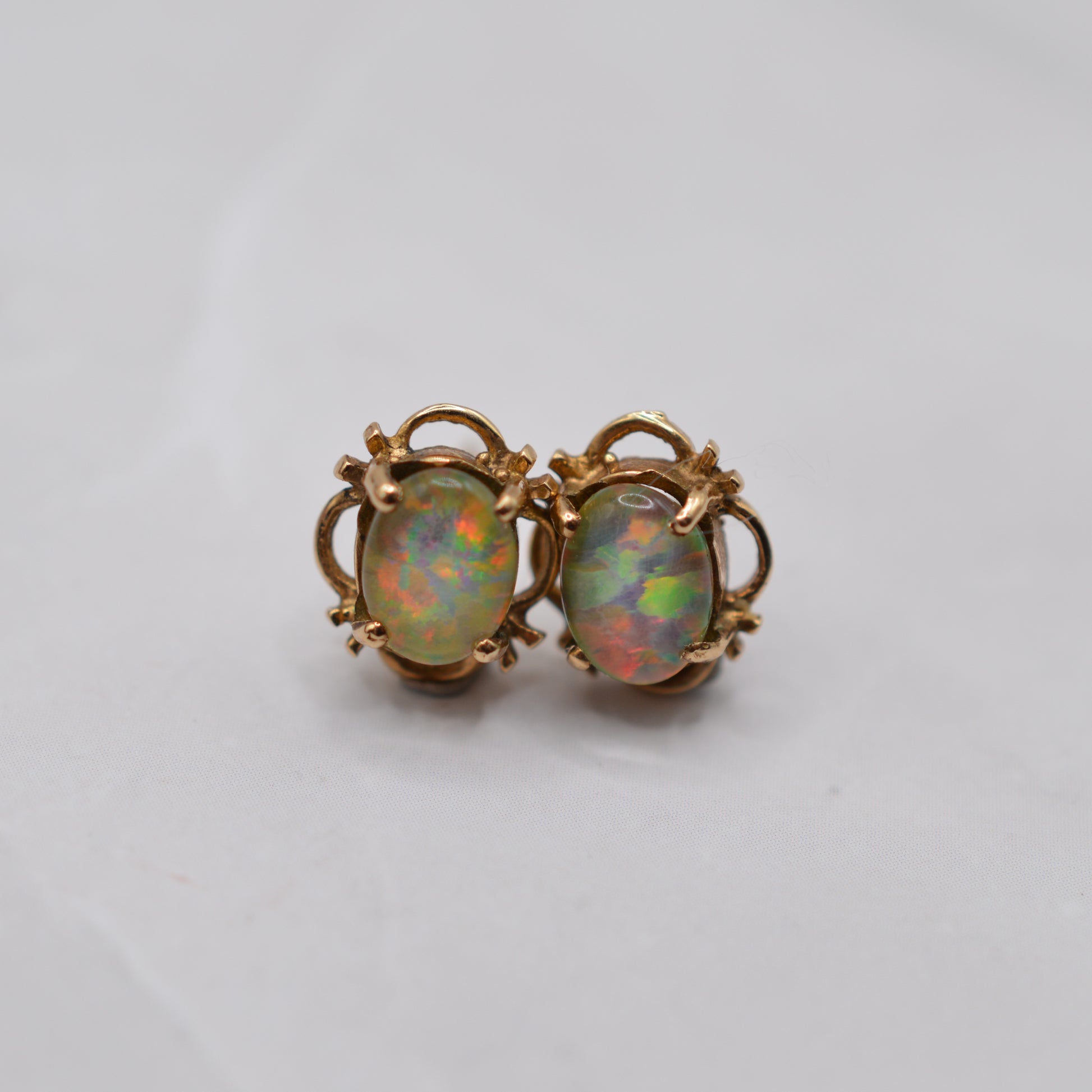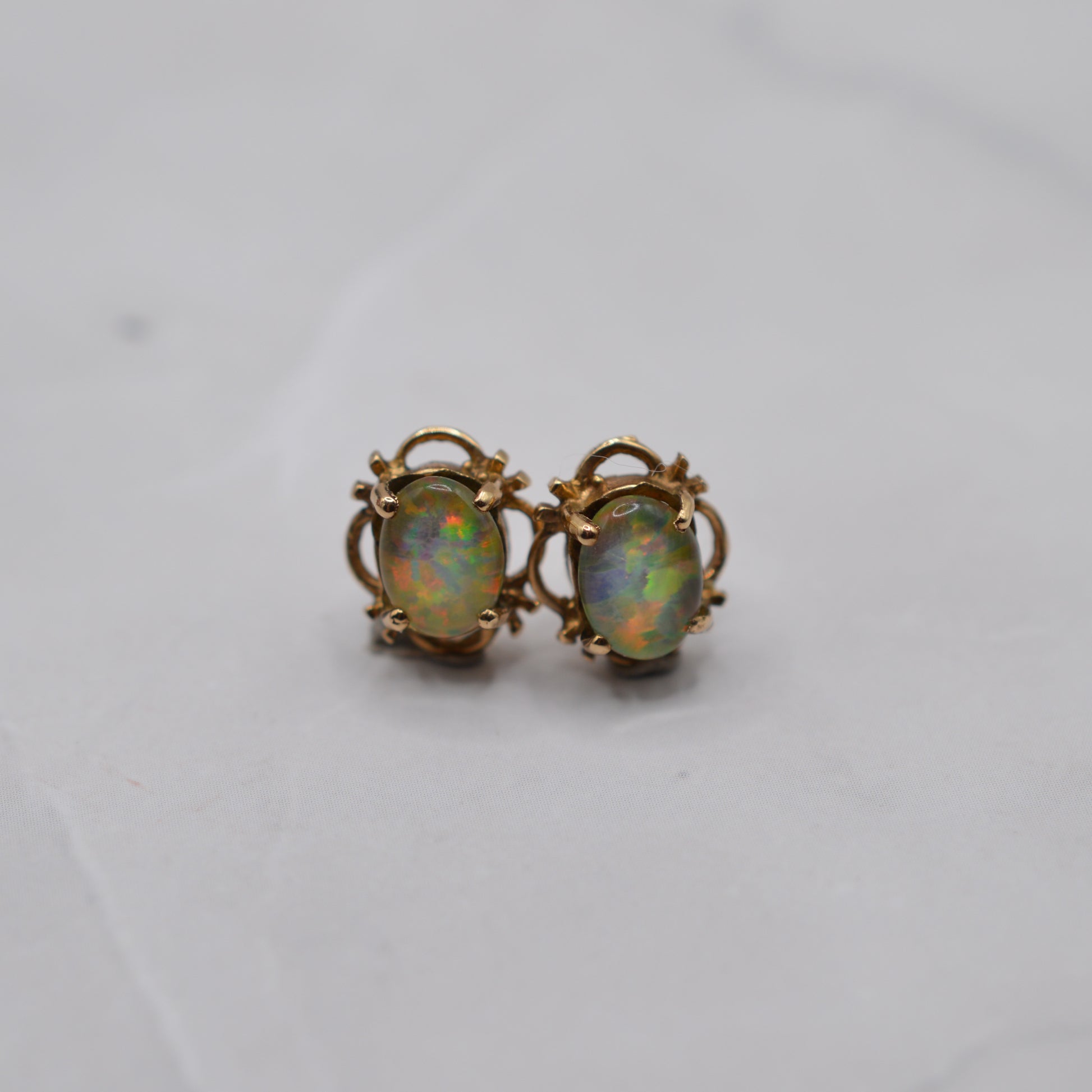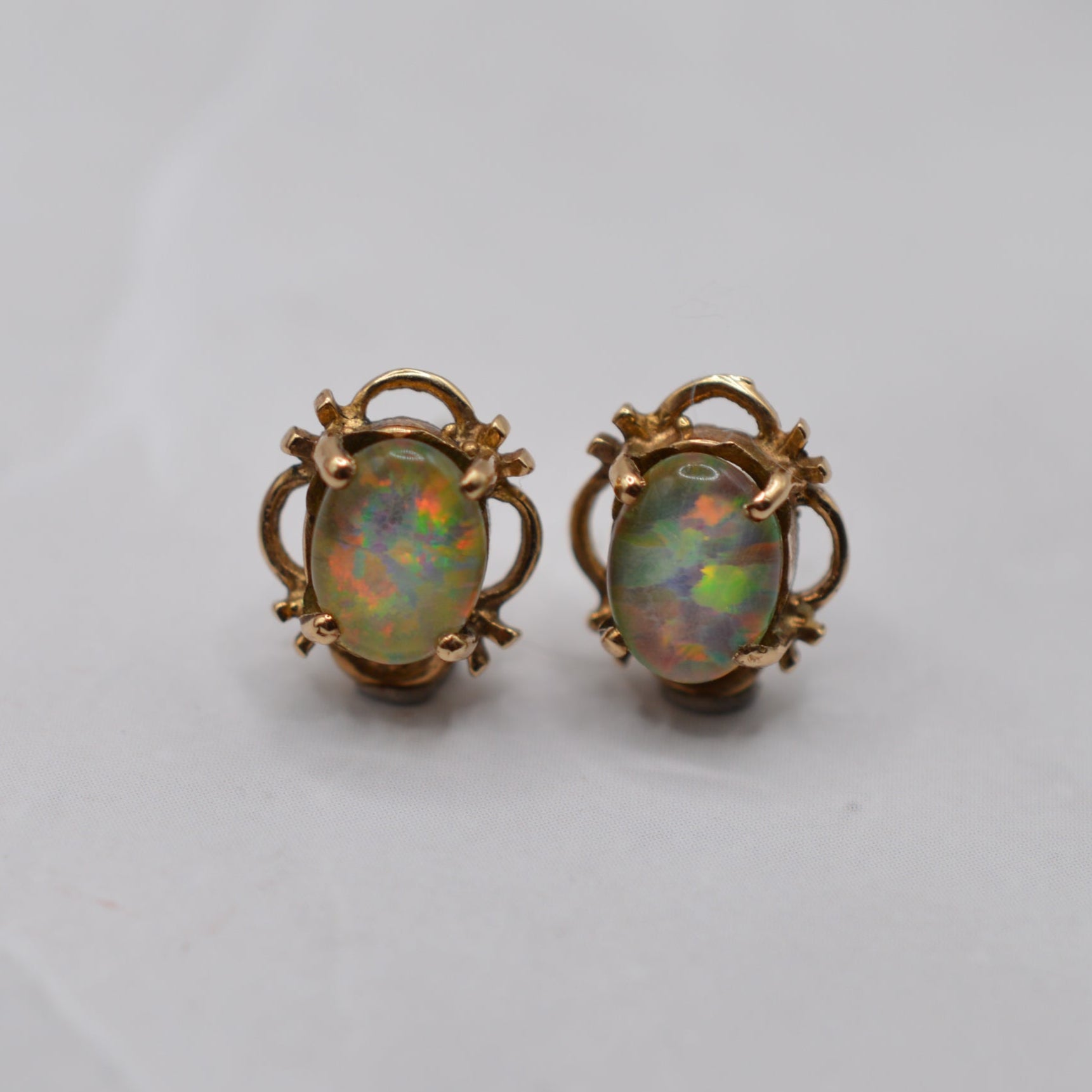 A pretty pair of 9ct gold opal triplet stud earrings from the 1990s! Each earring features an oval-shaped opal triplet with fabulous colour play, shimmering with iridescent ripples of blues, greens, oranges and pinks, and framed by a luxurious and delicate scalloped border.