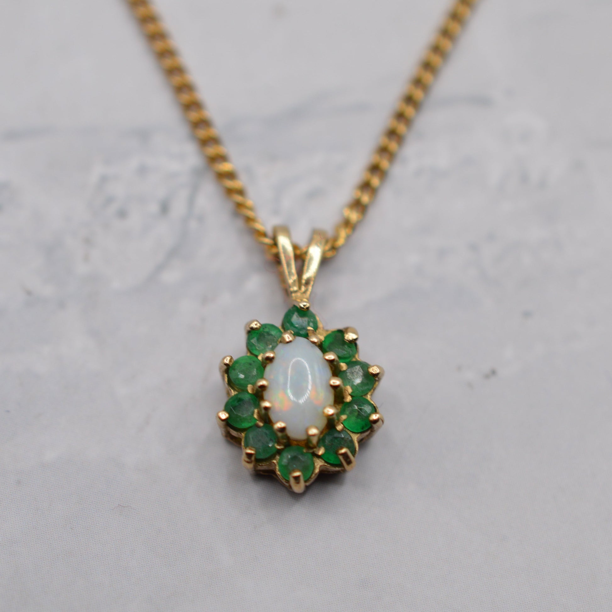 A beeeautiful 9ct gold opal & emerald cluster pendant necklace. The pendant features an oval opal at the centre, displaying lovely shimmers of yellows, greens and pinks, surrounded by a halo of meadow-green round-cut emeralds.