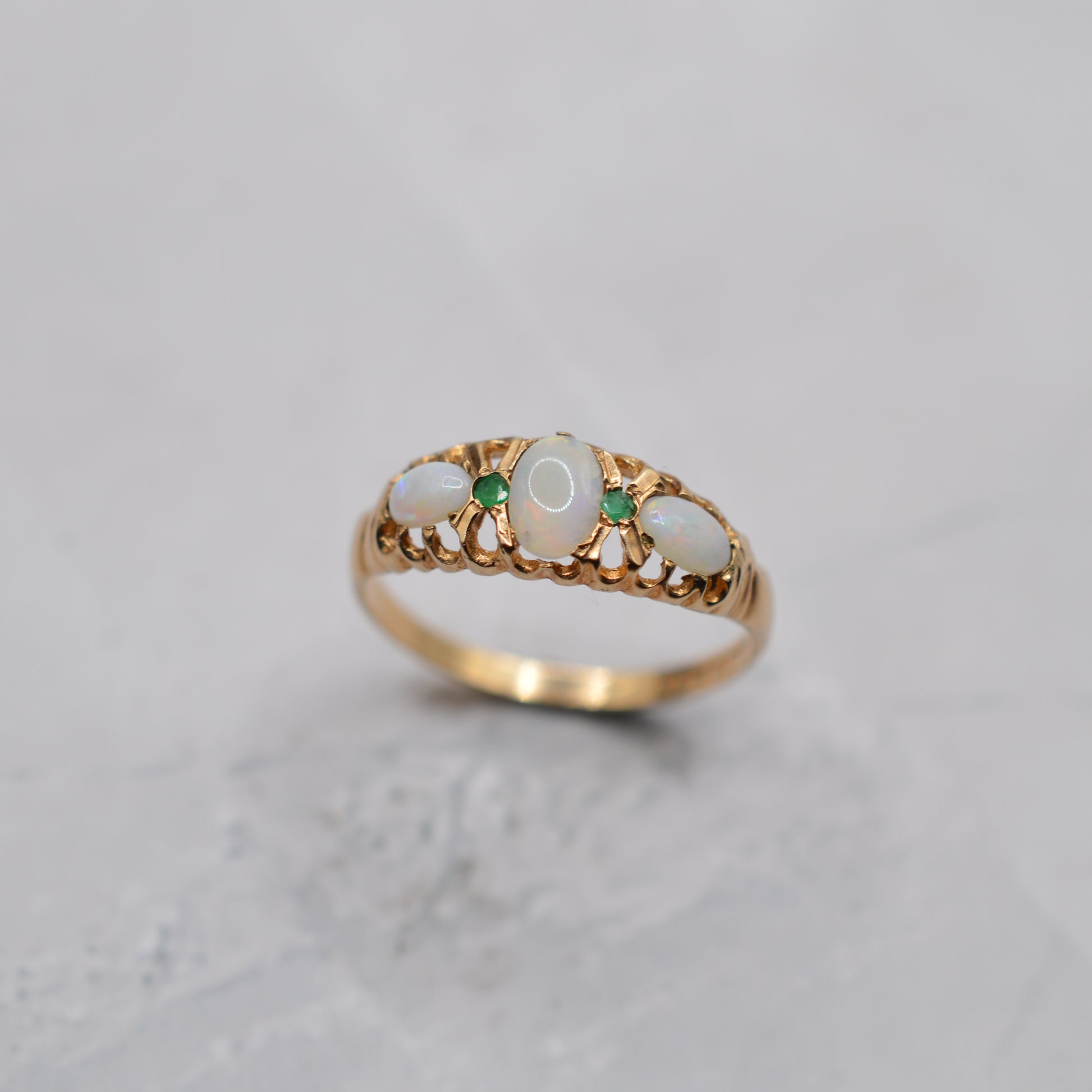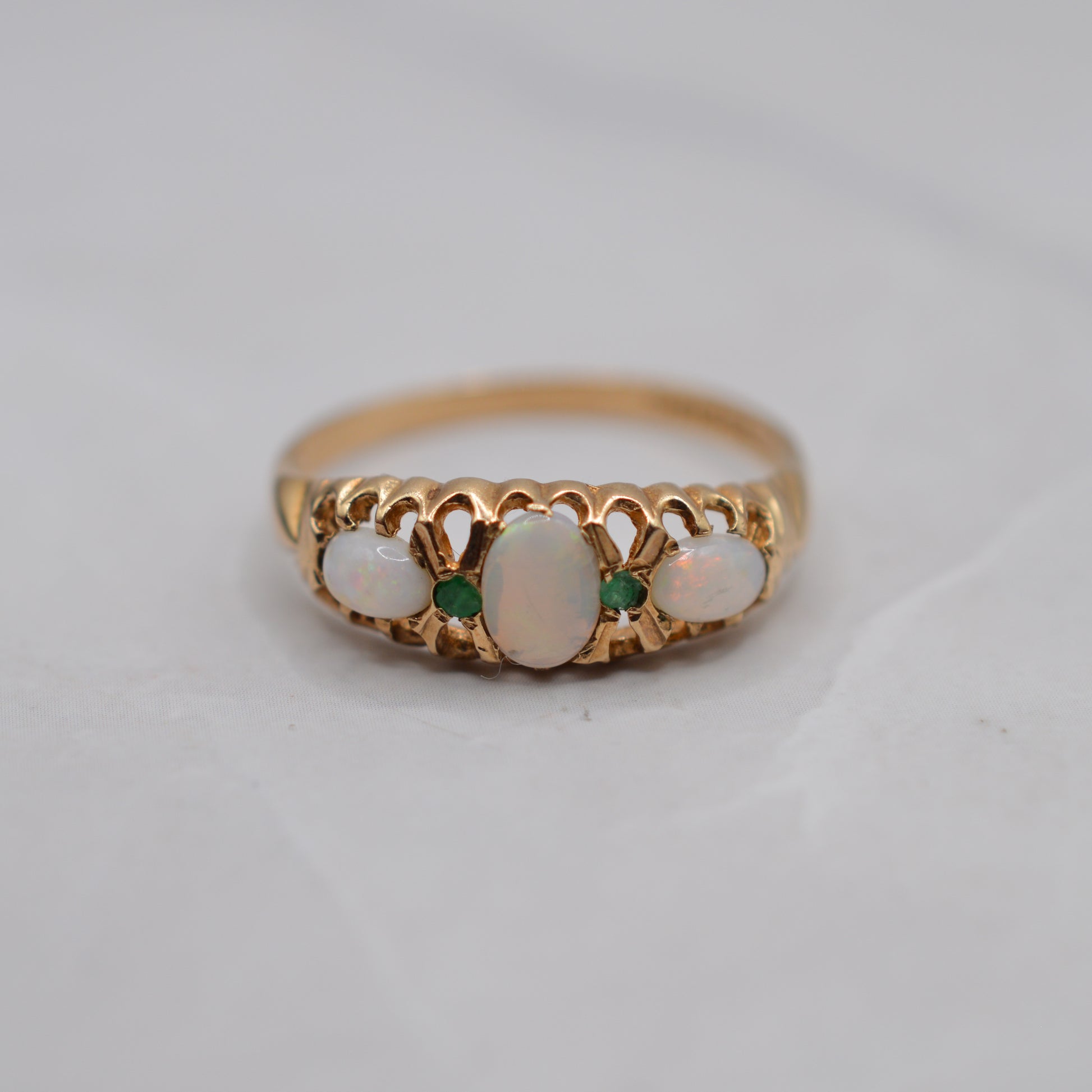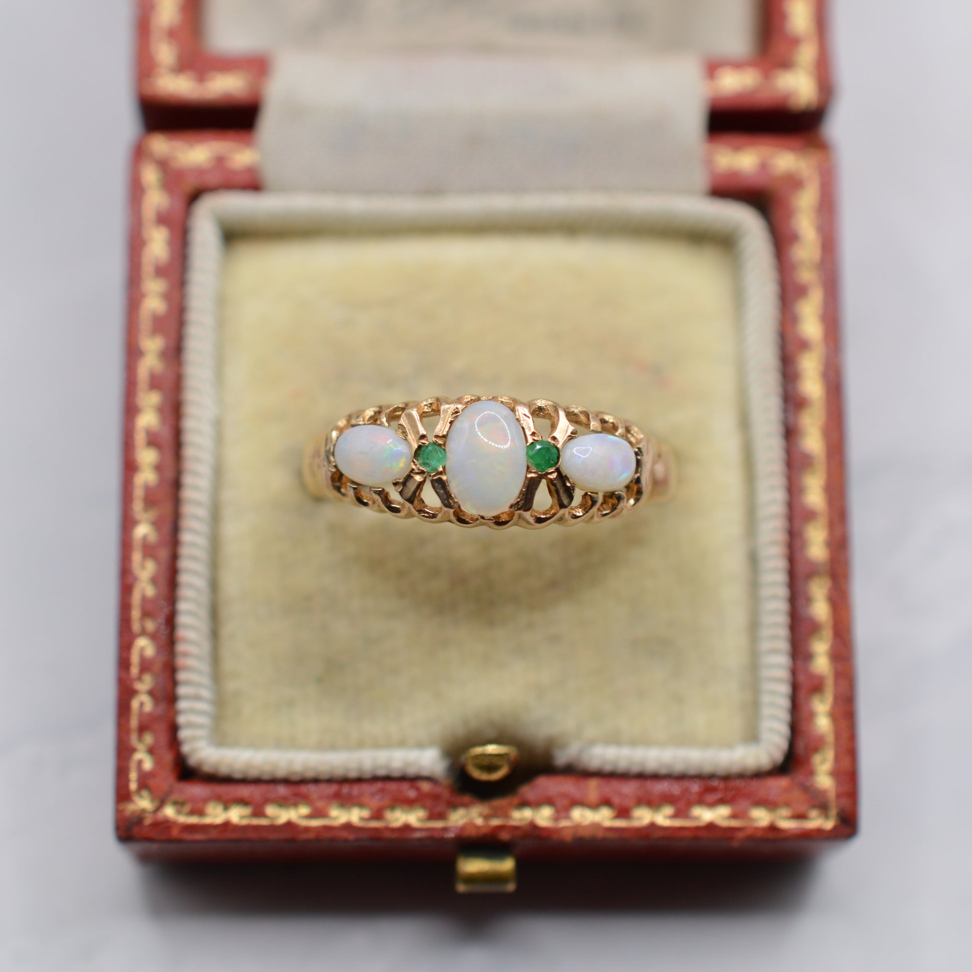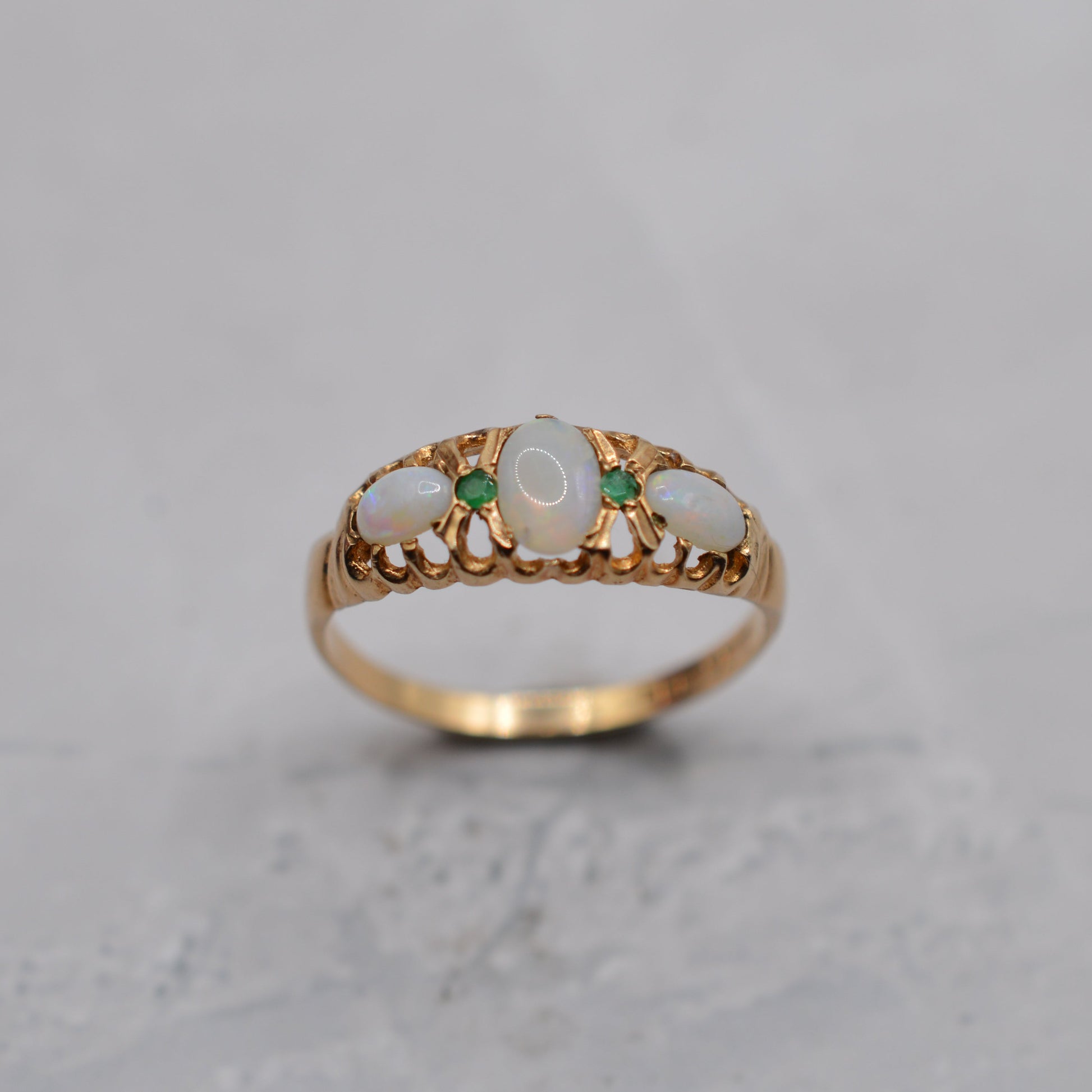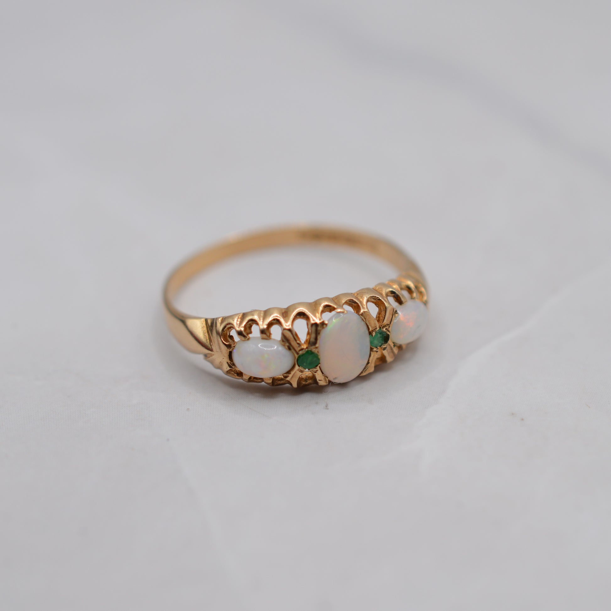 A rather pretty and unusual 1970s opal & emerald dress ring. This gorgeous 9ct gold ring features a trilogy of opals, the centre stone set vertically and flanked by two smaller horizontal opals; between each outer opal and the centre sits a small round emerald in a meadow green, while the opals display wonderful colour play with flashes of blues, greens and pinks.