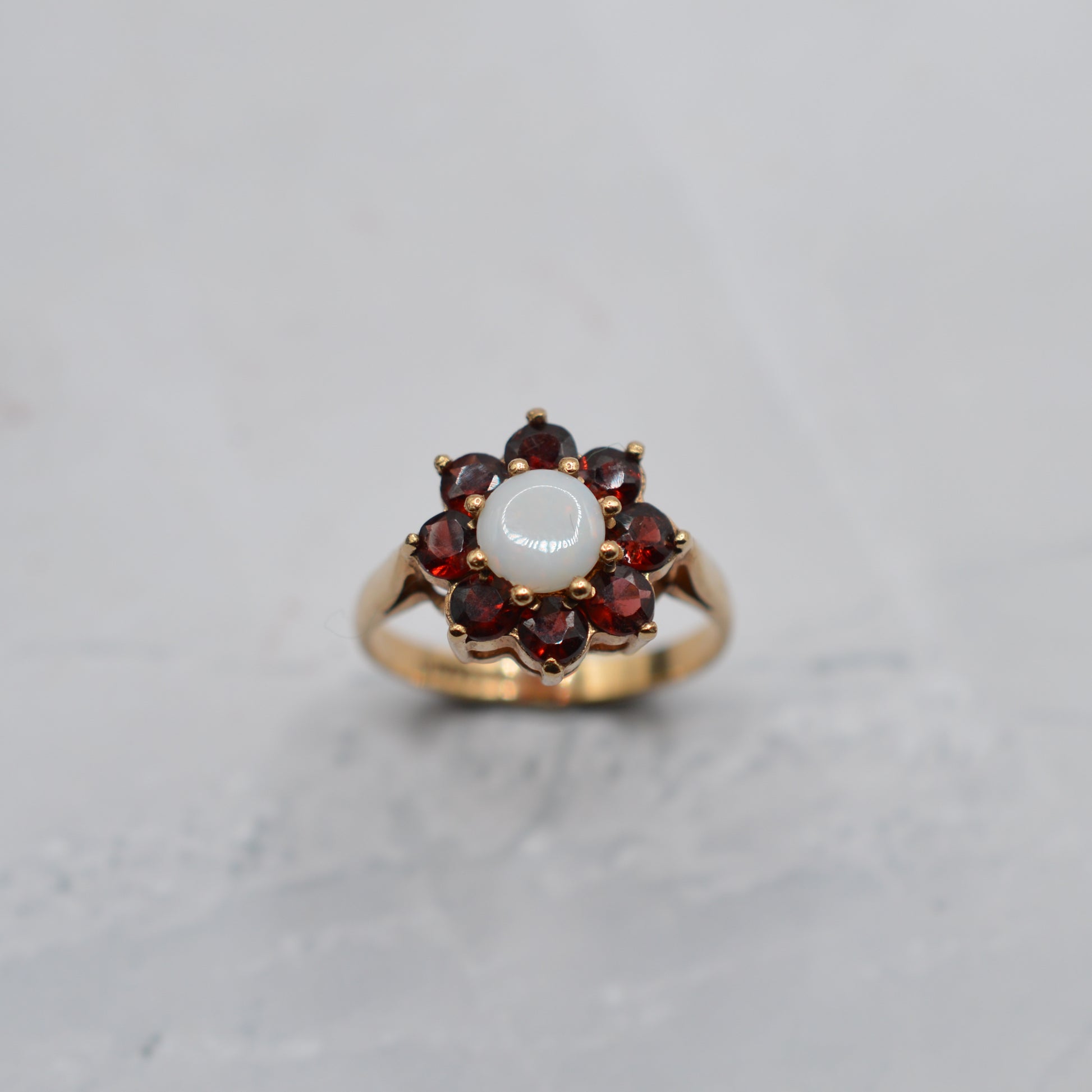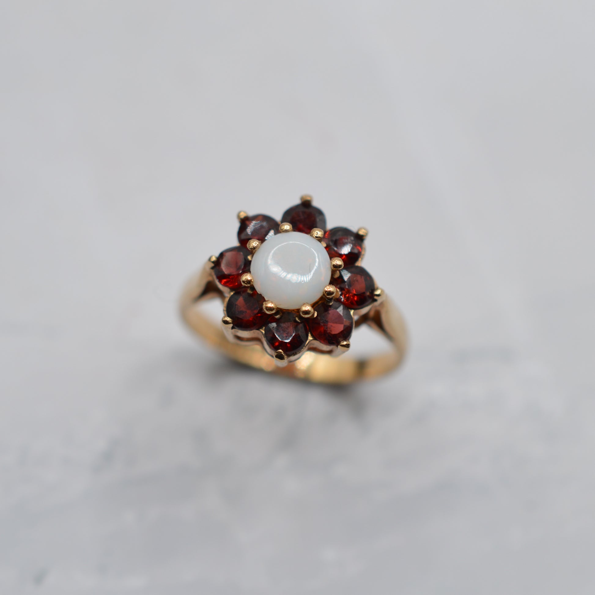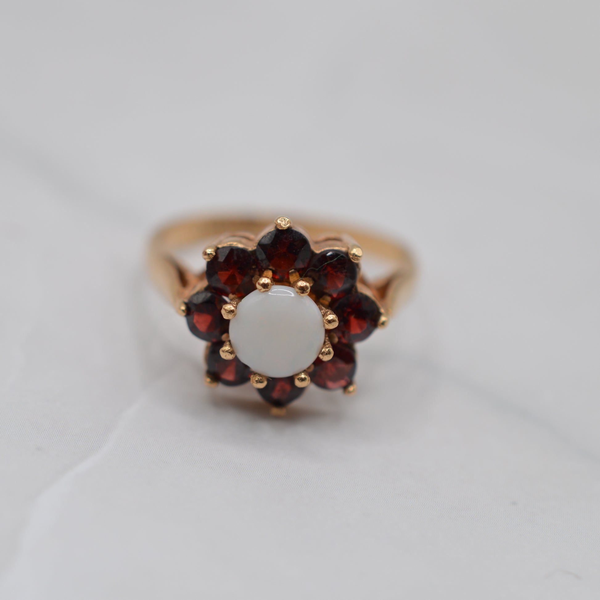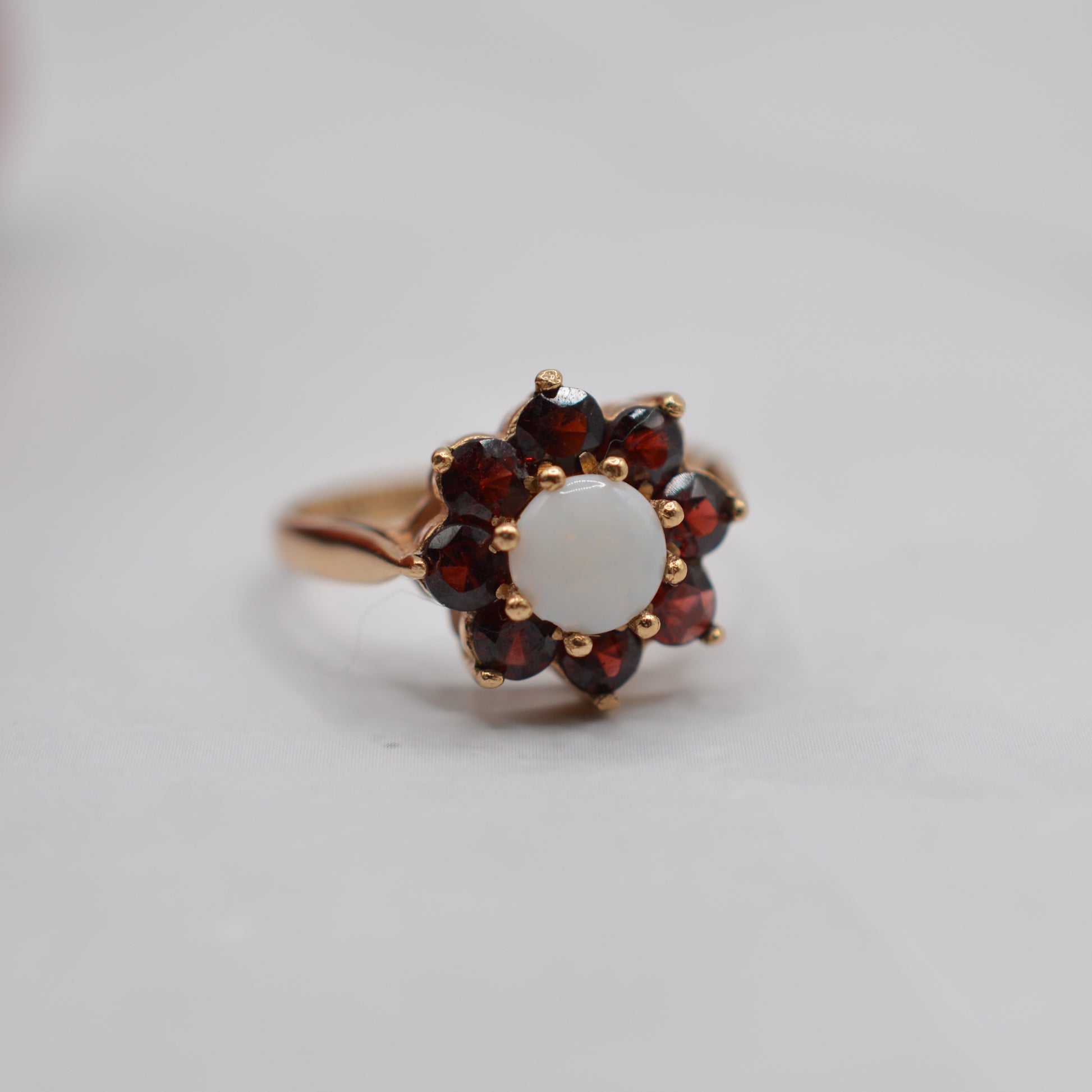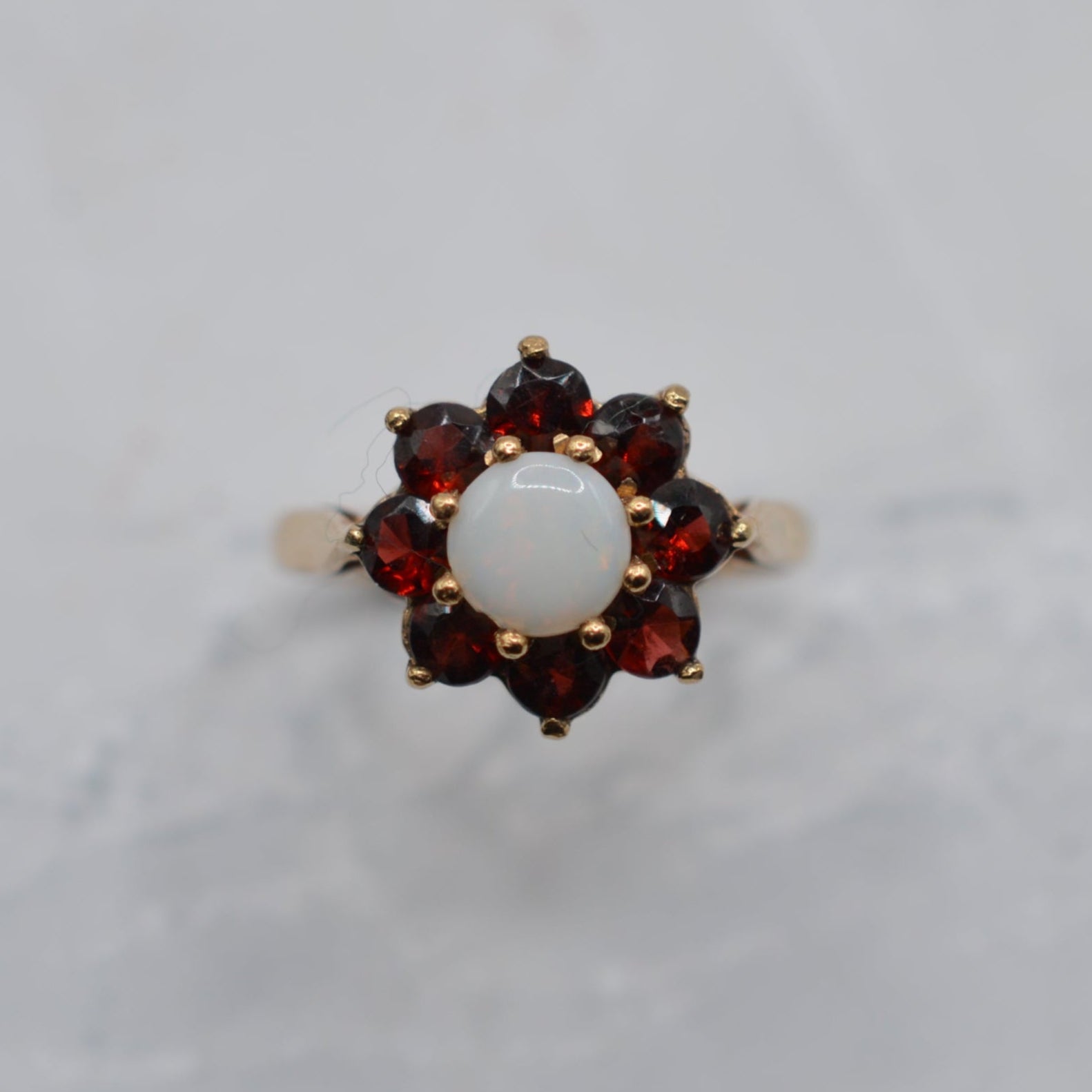 Vintage 9ct Gold Garnet & Opal Floral Cluster Ring
