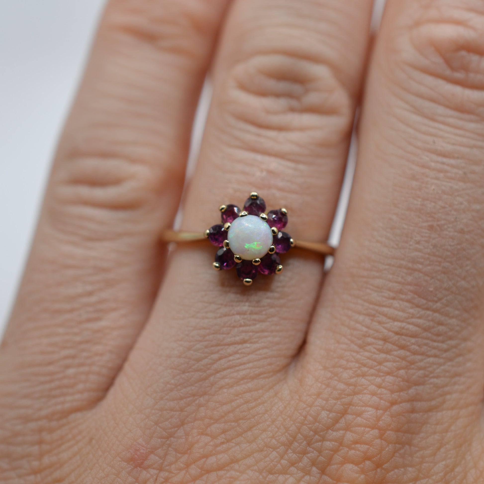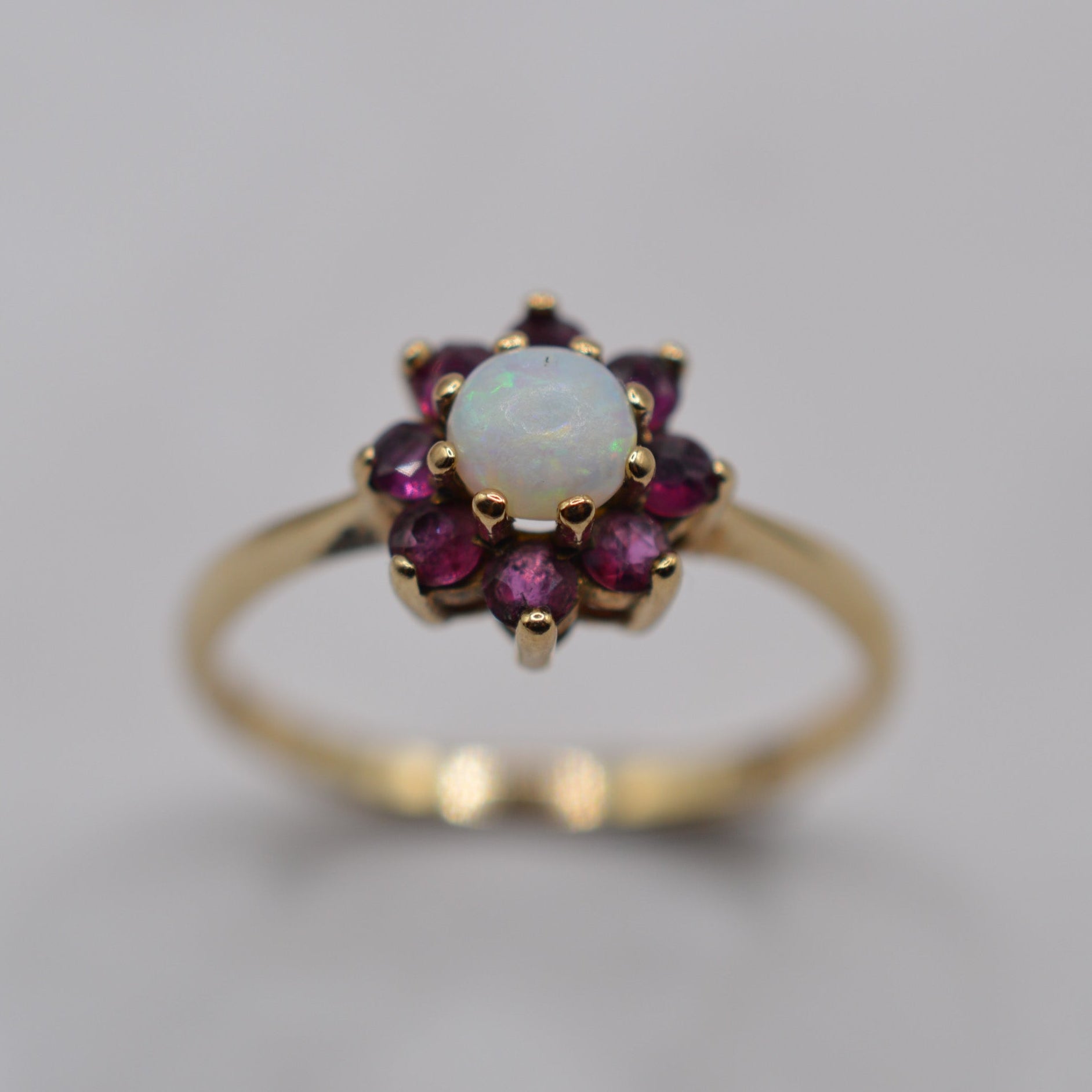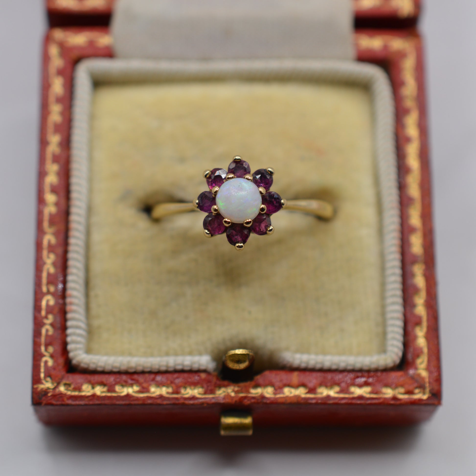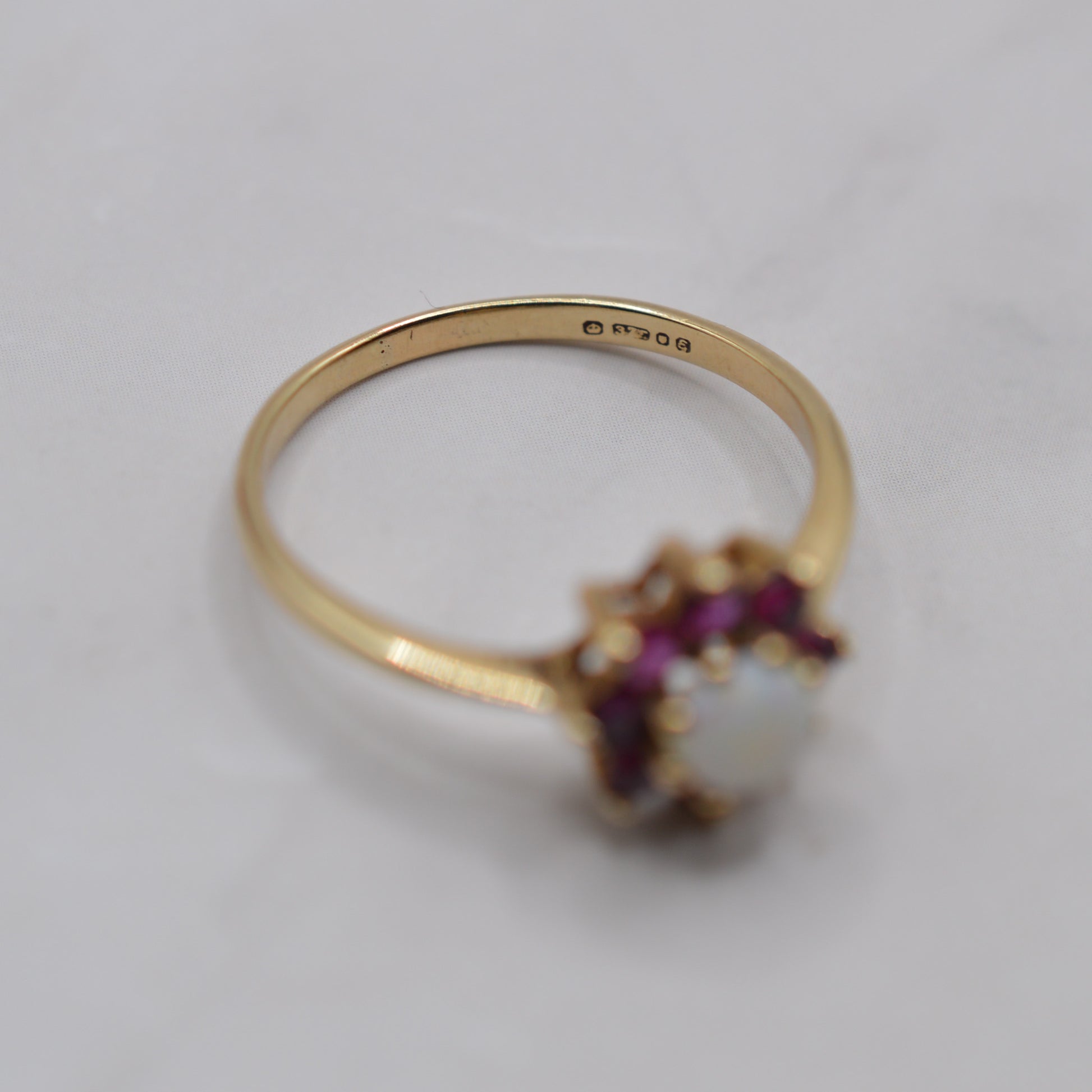 1970s Vintage 9ct Gold Opal & Ruby Cluster Ring