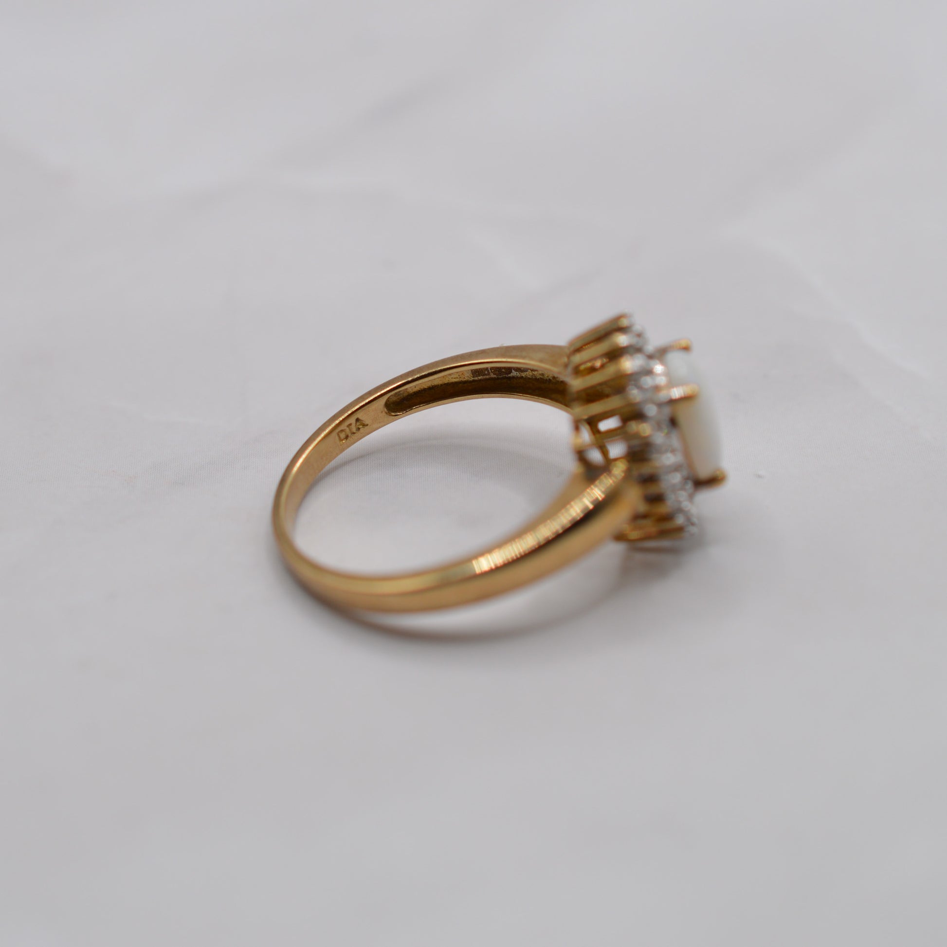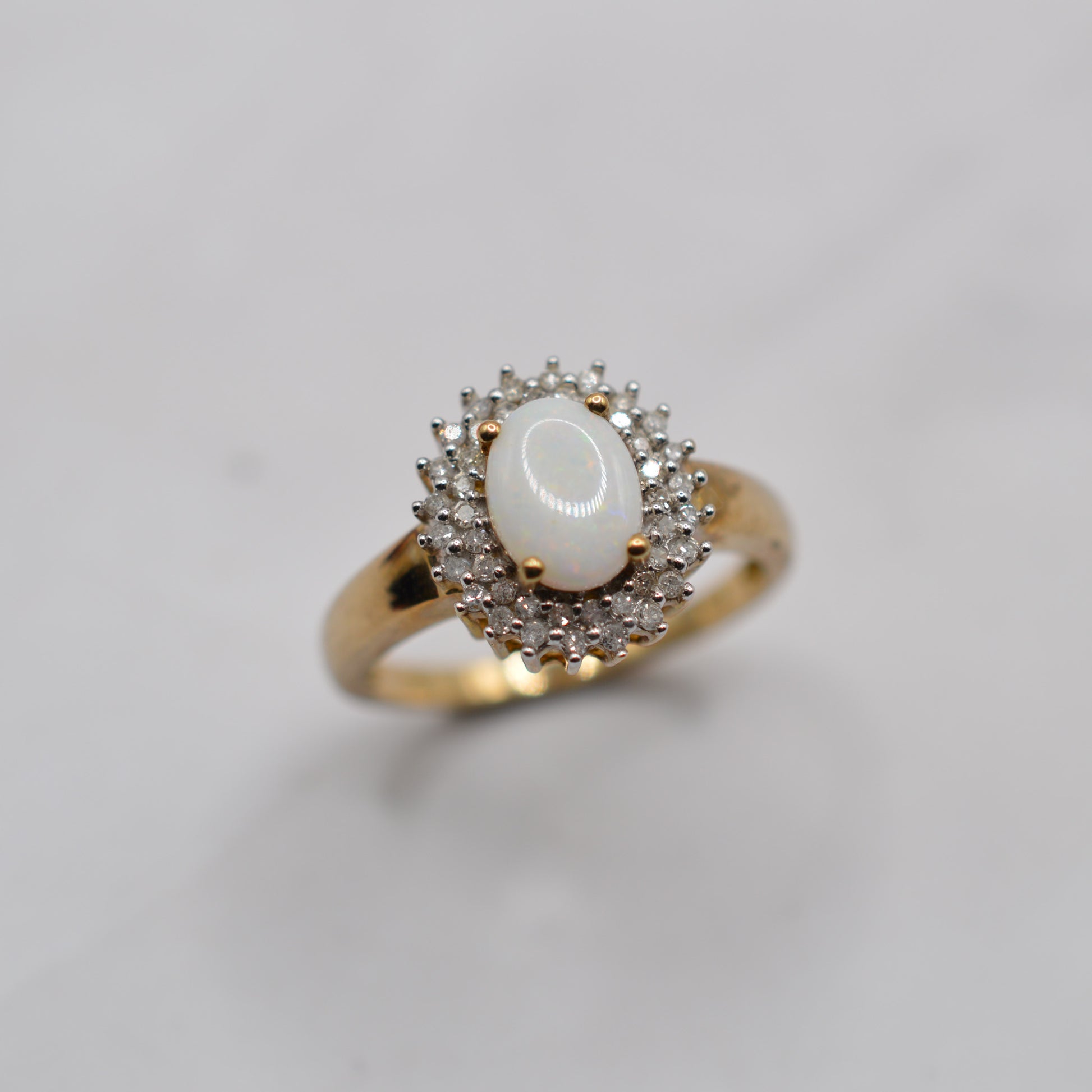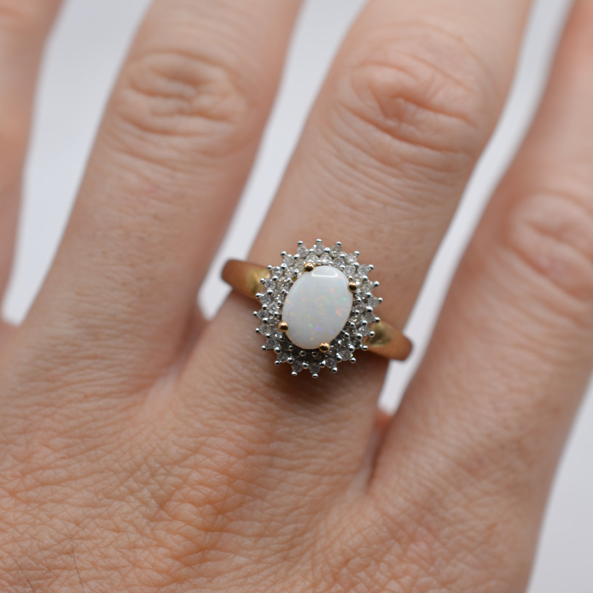 An utterly stunning 9ct gold opal and diamond cluster ring with a double diamond border. This stunning piece features an oval cabochon opal at the centre, displaying delicate flashes of green, pink, and orange; surrounding the opal are two concentric rows of sparkling little diamonds, offering wonderful contrast against the opal. The large, dazzling cluster is then set on a polished yellow gold band, forming a luxurious and eye-catching statement ring for any occasion.