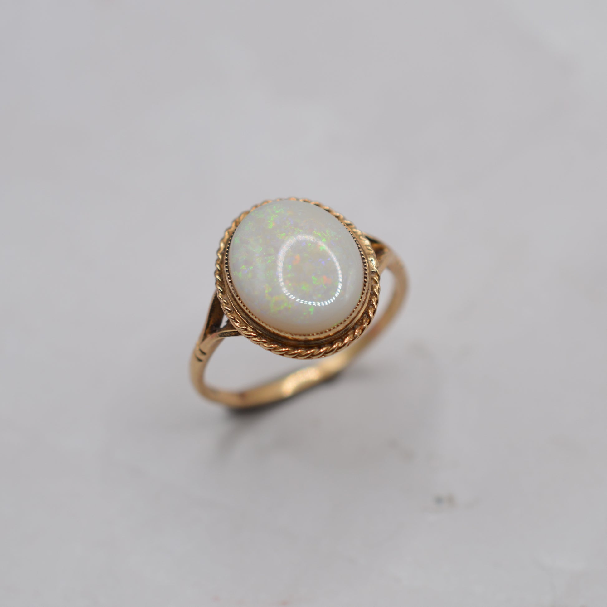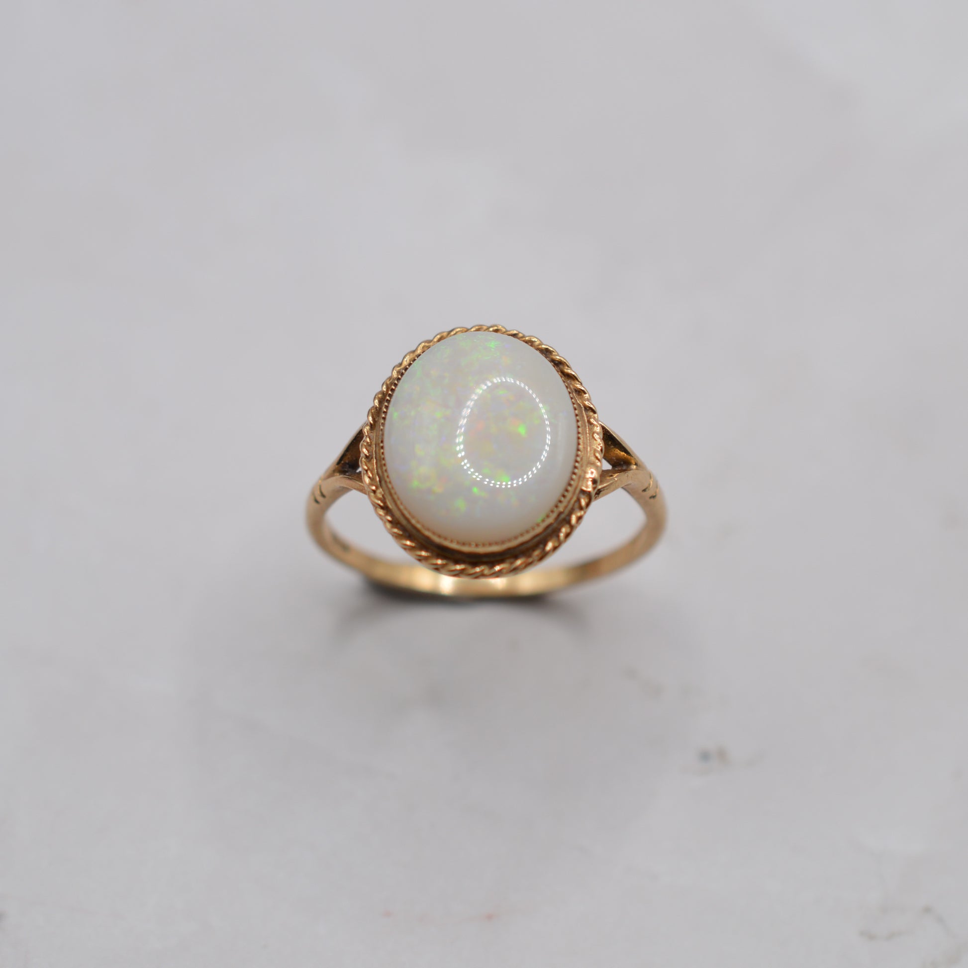 A gooooorgeous 1980s 9ct gold opal solitaire ring with a classic rope-twist border. This vintage eye-catching piece features a large oval-shaped opal, bezel set to show off its lovely play of colour with flashes of green, blue, and orange. Surrounded by a little rope-twist border, the opal measures approx. 12mm x 10mm, making it a stunning centrepiece that really stands out and pops. Details: