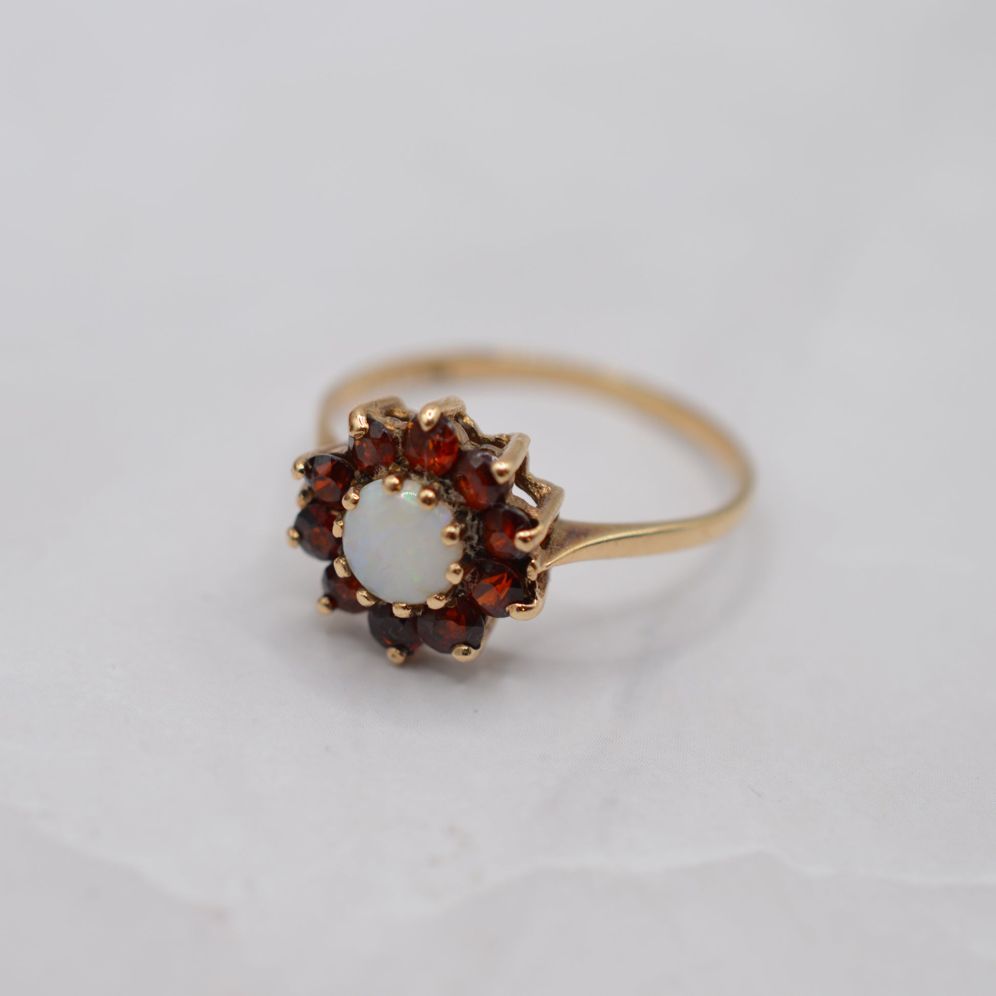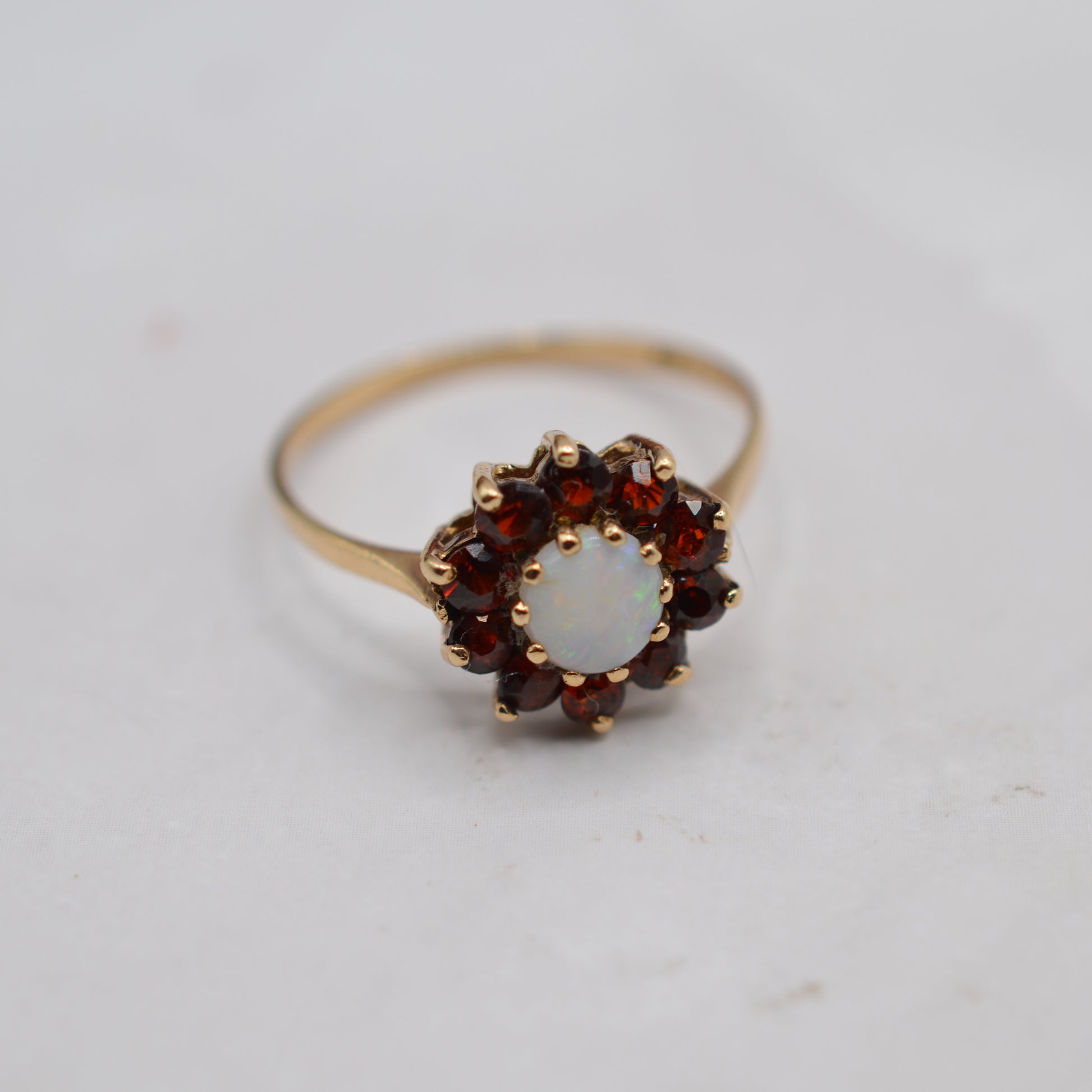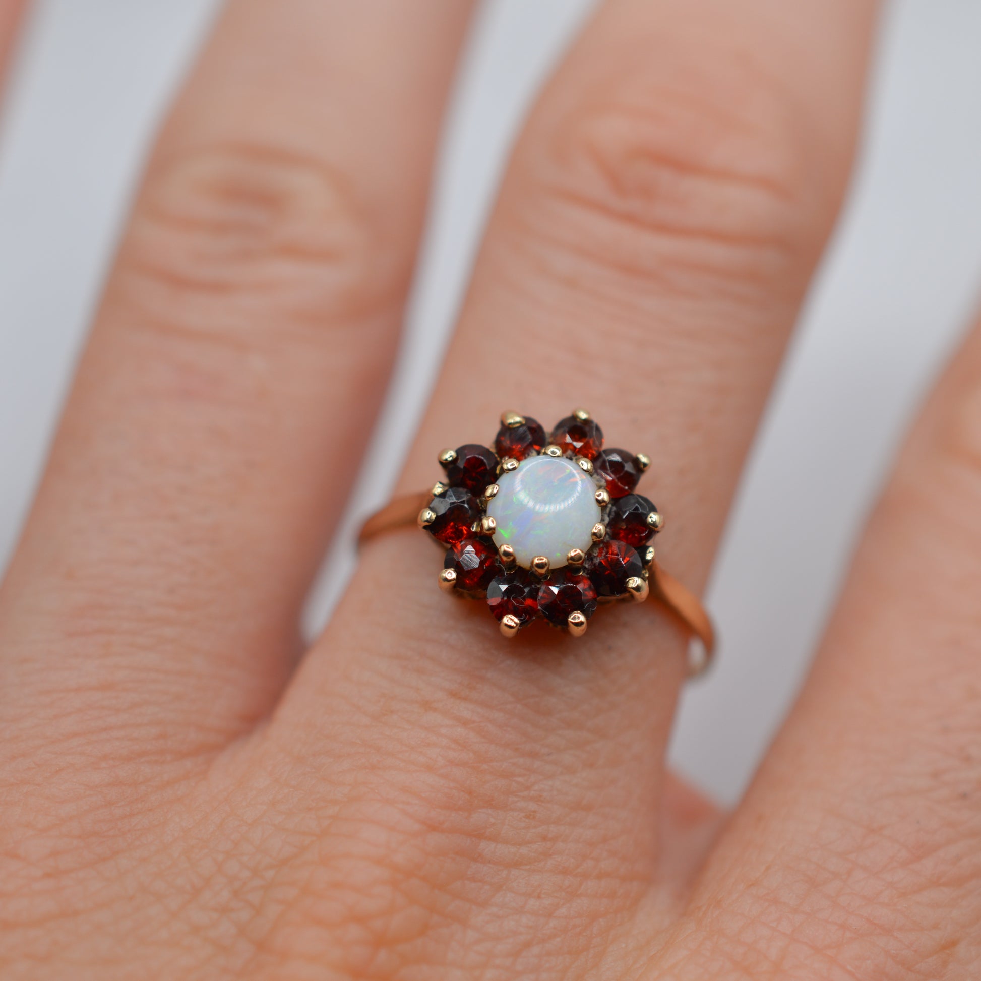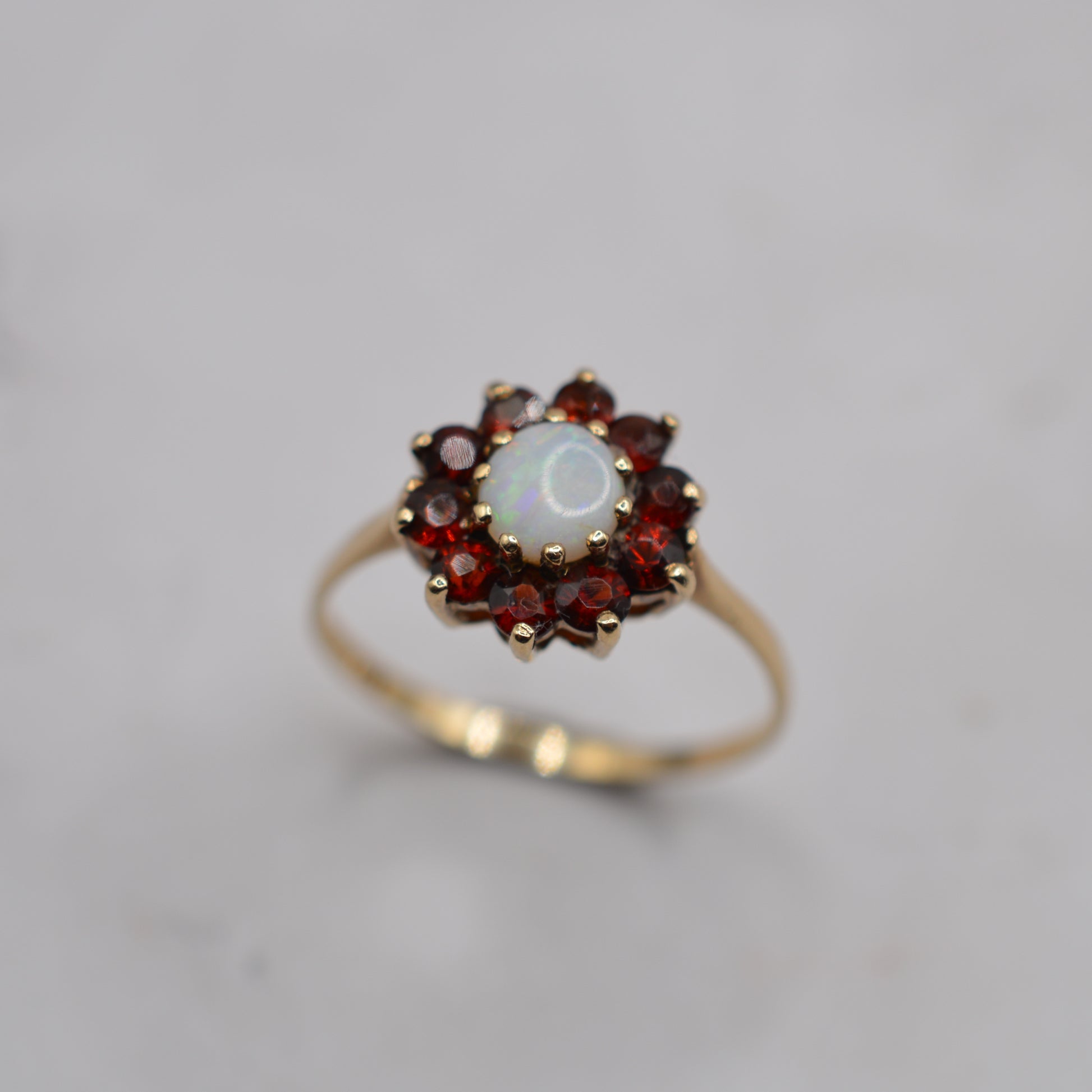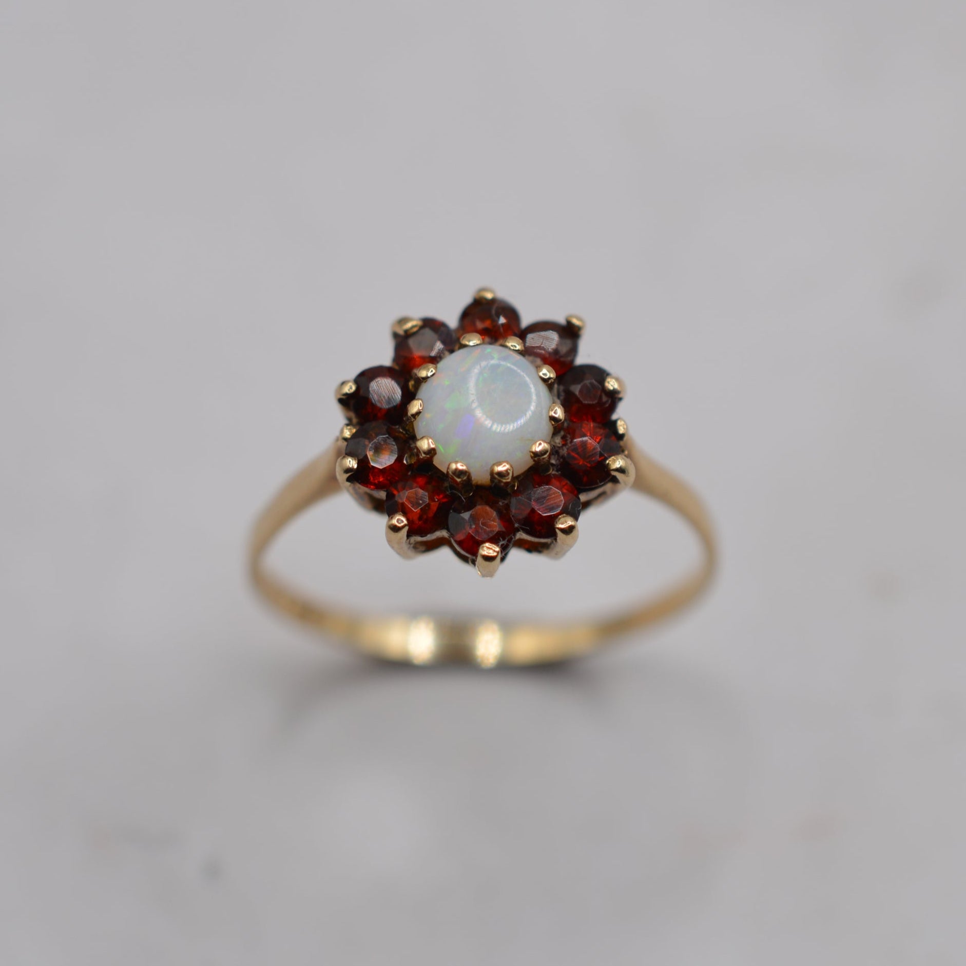 A gorgeous 1980s vintage 9ct gold opal and garnet cluster ring. This pretty piece features a central shimmering opal, glowing with dreamy flecks of green and blue, surrounded by a halo of richly coloured garnets. The garnets vary slightly in hue, adding lovely depth and warmth to the design. A beautiful vintage gemstone ring full of charm and sparkle!