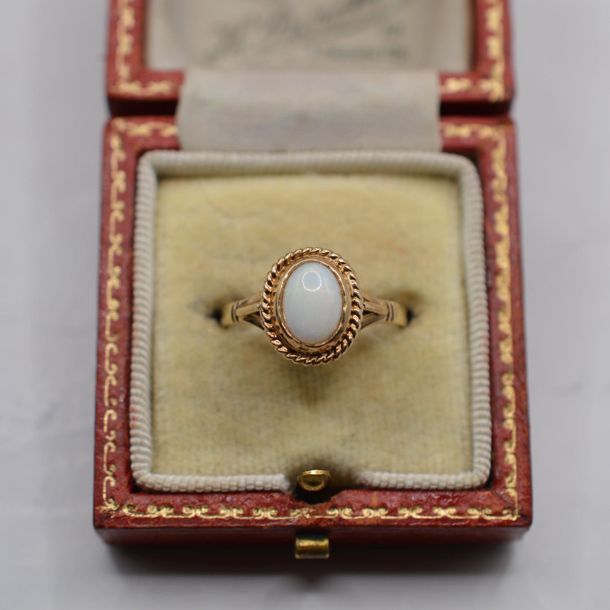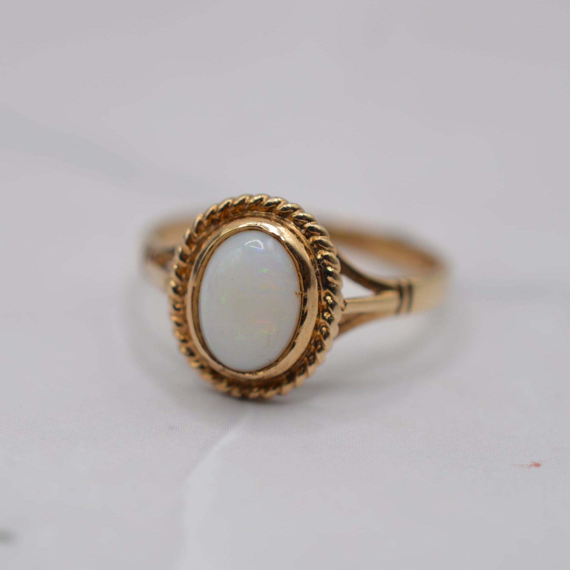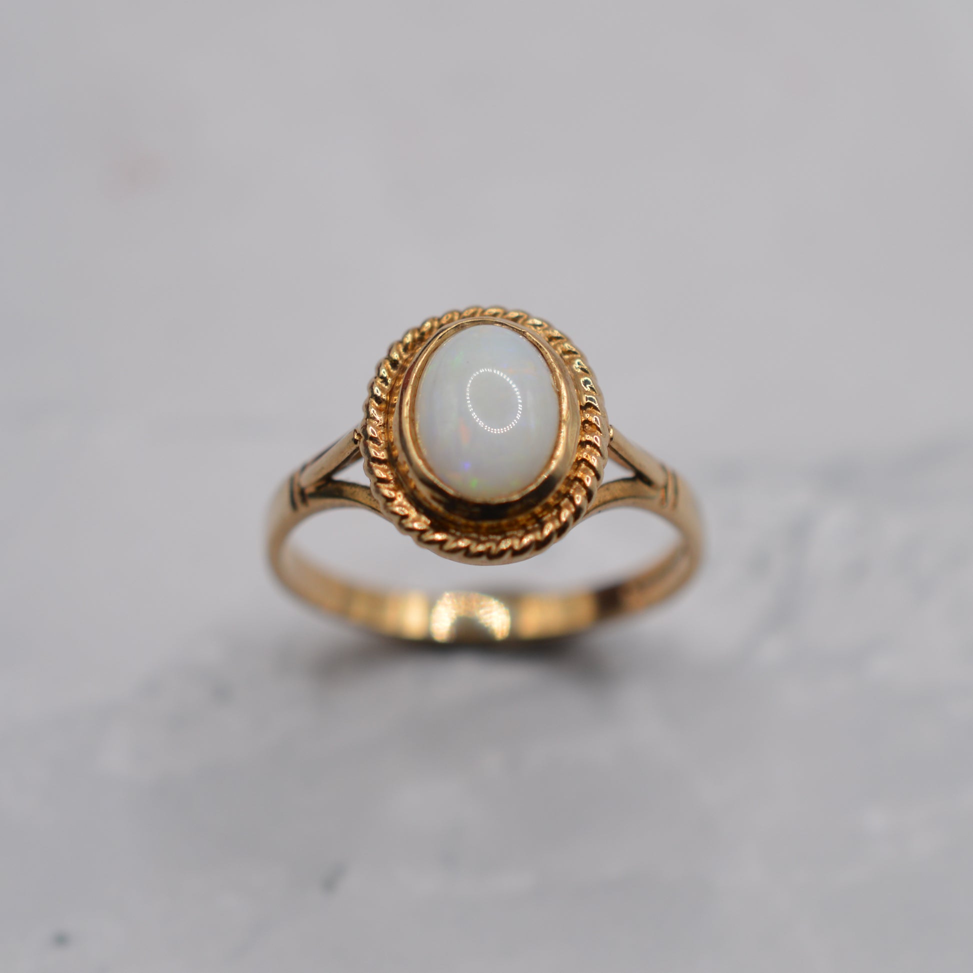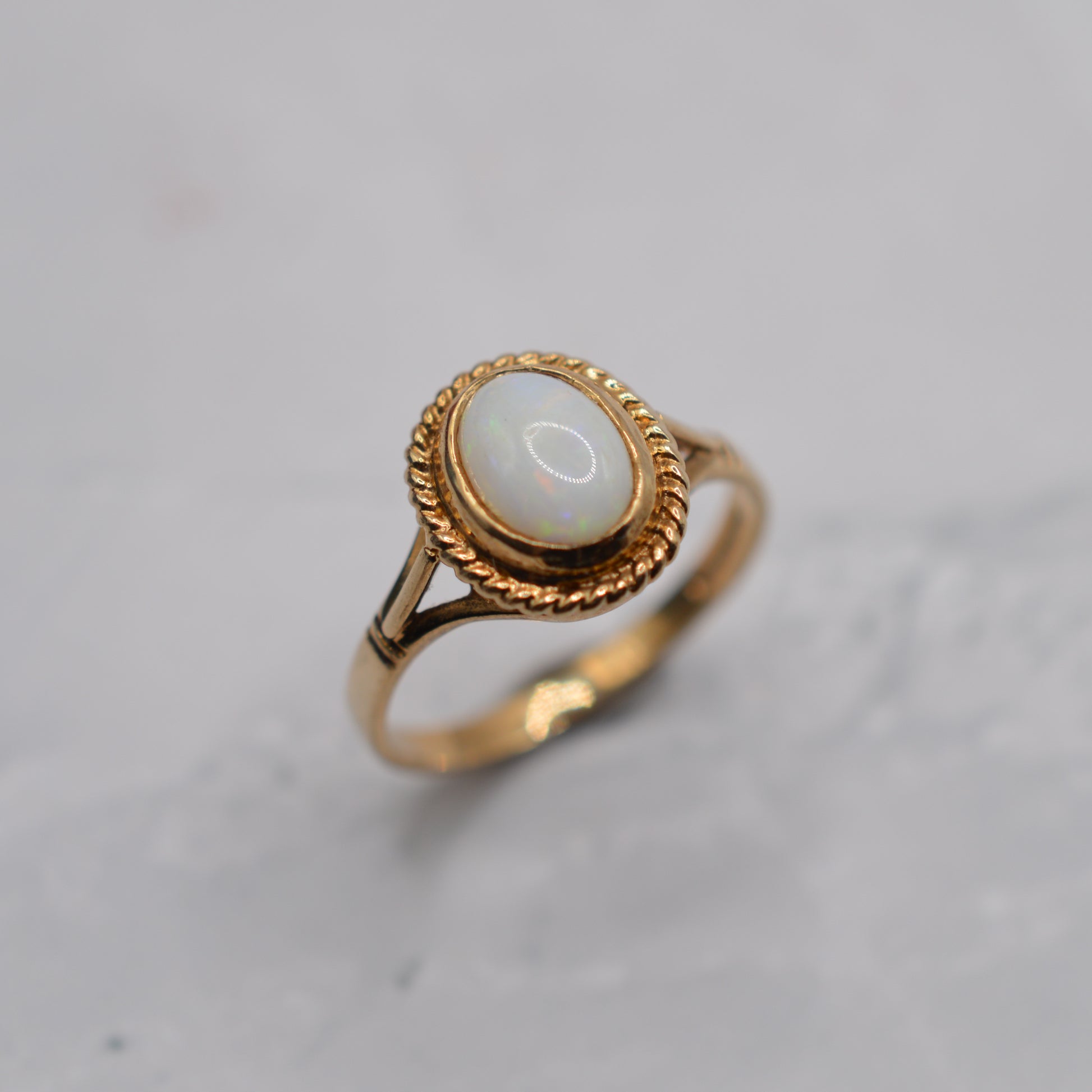 A sweet 1990s 9ct gold opal solitaire ring. This charming vintage piece features an oval, bezel-set cabochon opal with light colour play of oranges, greens and blues, surrounded by a decorative rope-twist border for a touch of luxury. The opal in its setting measures approx. 11mm x 9mm, making this a pretty and eye-catching size. A lovely piece that brings shimmer and elegance!