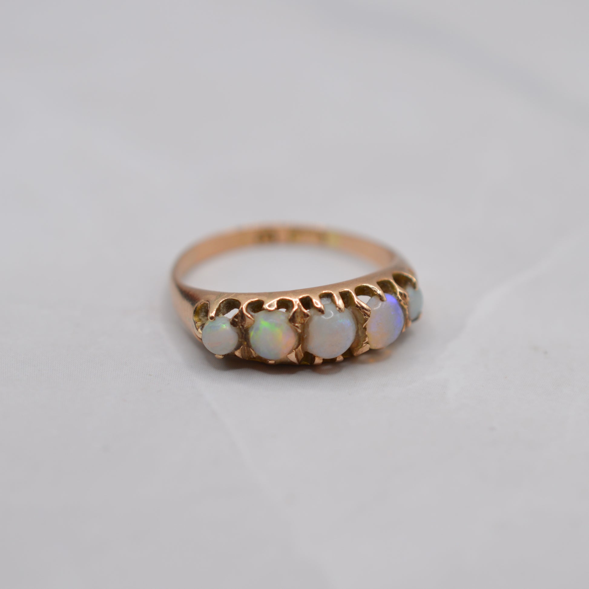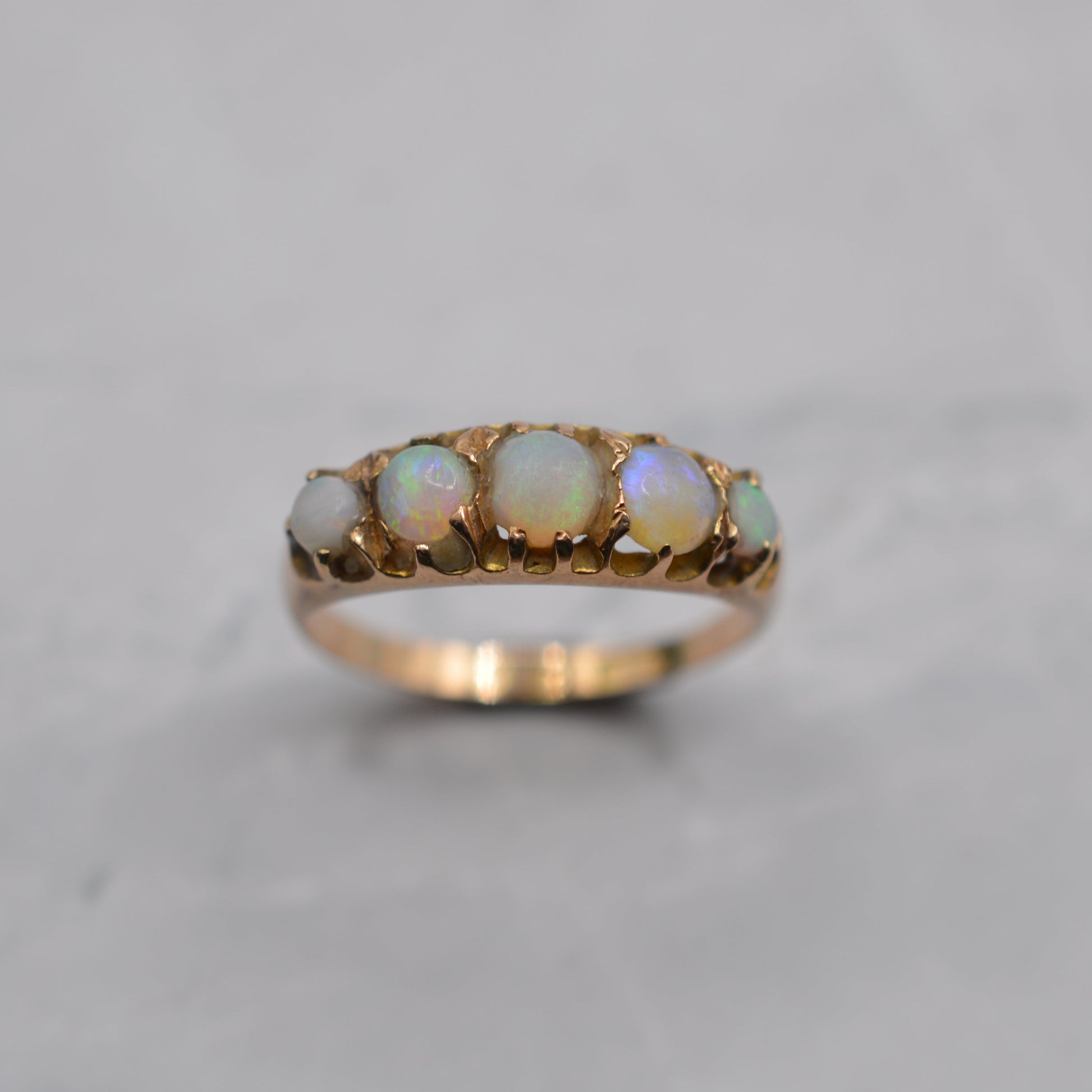 A beautiful Victorian 15ct gold opal five-stone ring. This charming antique piece features five natural opals set in a graduated arrangement, with the largest stone at the centre. The opals offer lovely colour play, with flashes of blues, greens and lilacs, claw-set in a classic Victorian open, pierced gallery.