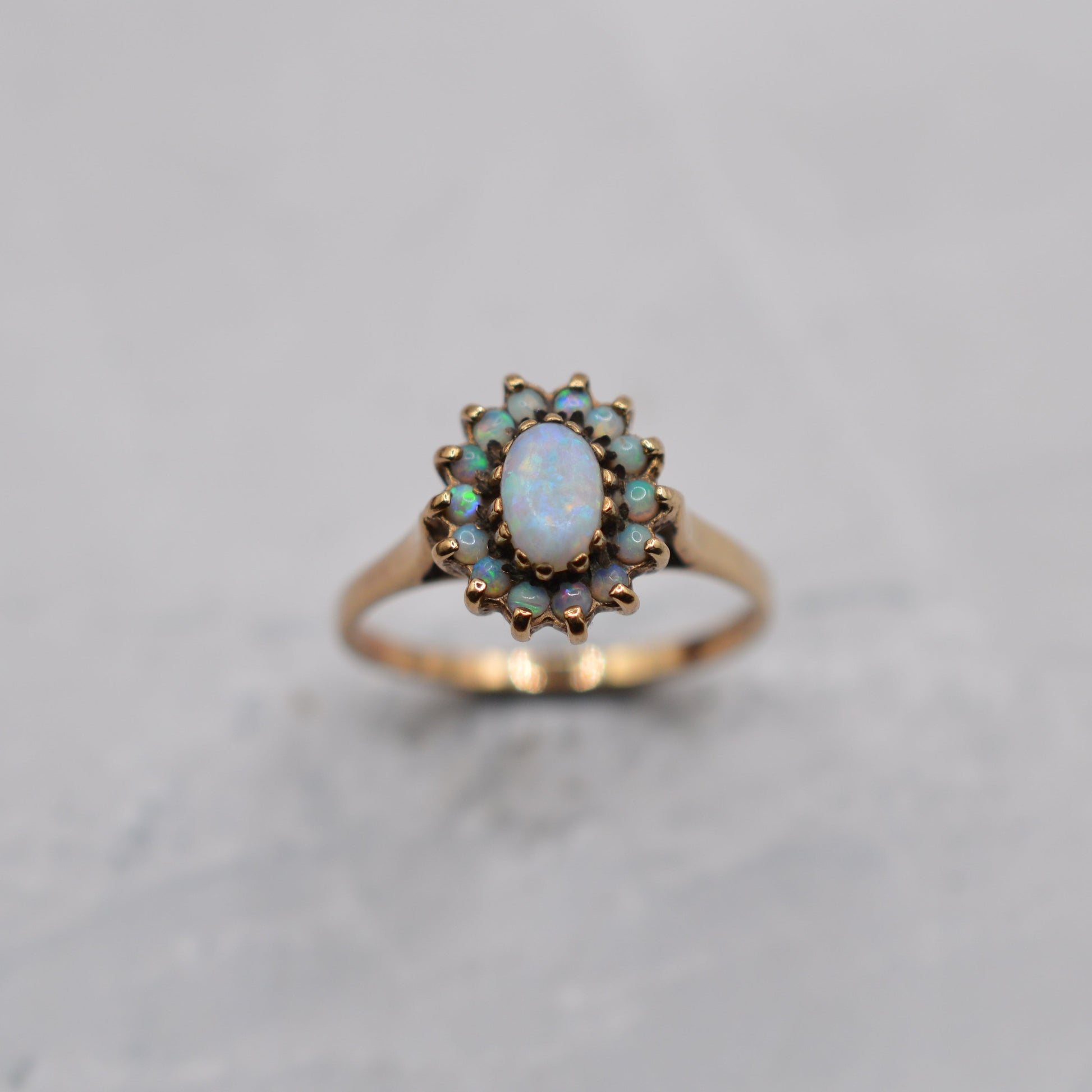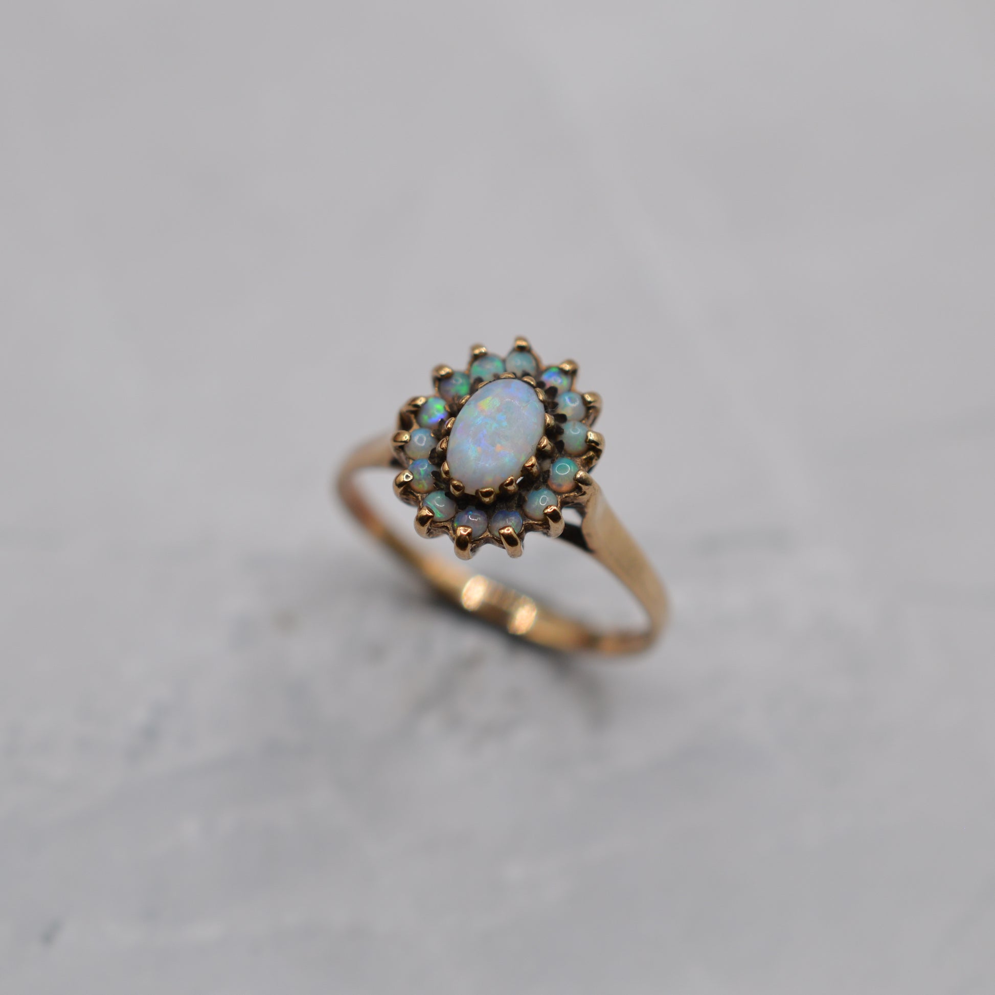 A rather sweet 1980s 9ct gold opal cluster ring. This cute vintage piece features an oval-shaped opal at the centre, framed by a halo of round smaller opals, creating a classic floral-style cluster that measures approx. 10mm x 8mm. The opals display beautiful flashes of blues, greens and violets, shimmering against the warm yellow gold of the band.