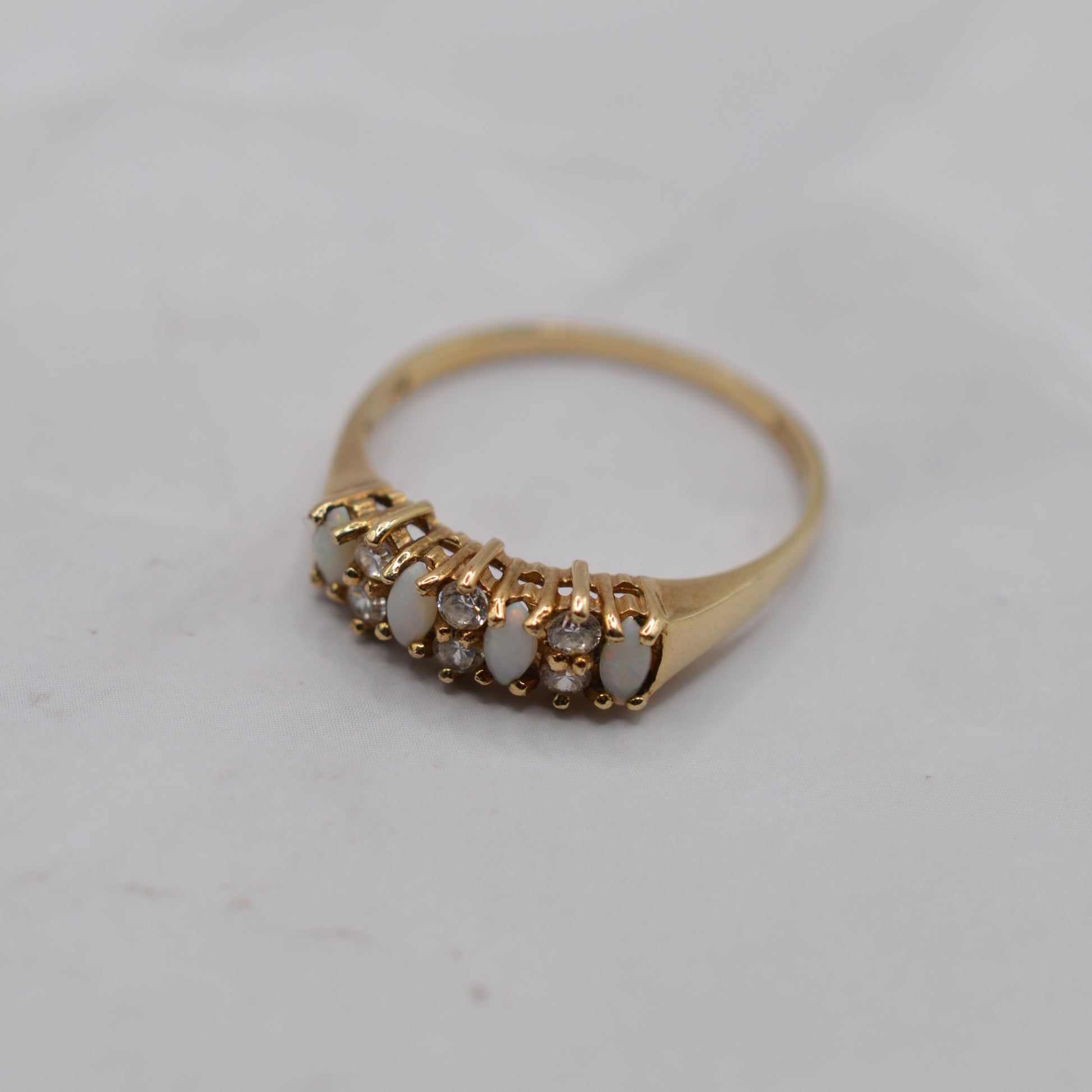 Such a gooorgeous and dreamy 9ct gold opal & CZ ring! This elegant preloved piece features four marquise-cut opals, each glowing with fiery colour play in shades of red, green and blue, set alongside six sparkling cubic zirconia stones for extra shimmer. A beautifully balanced design that's versatile and eye-catching all day long!