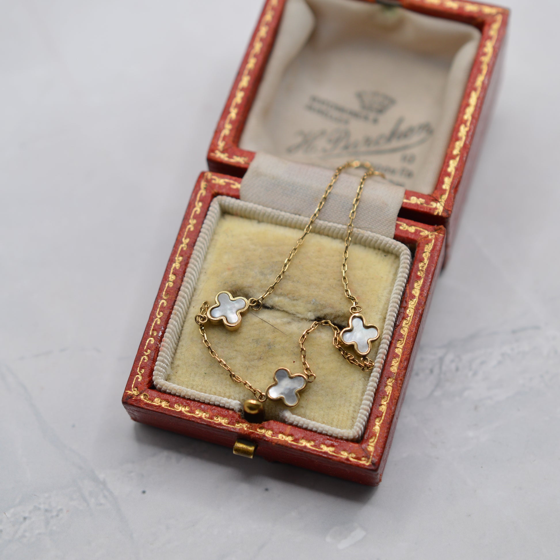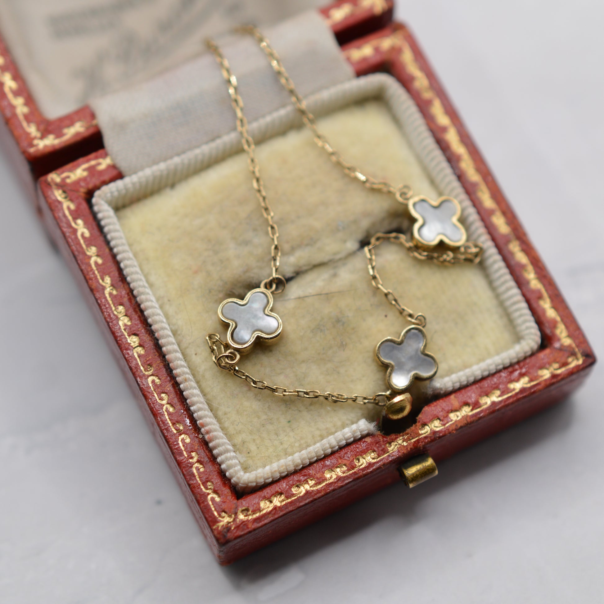 An adorable 9ct gold mother of pearl clover bracelet. This lovely piece features three dainty mother of pearls spaced evenly along a fine yellow gold chain, each set in a classic clover/quatrefoil shape. The mother of pearl has that lovely soft, natural shimmer and iridescence that catches the light beautifully. The bracelet is delicate and refined, complete with two fastening loops so that the length can be adjusted.