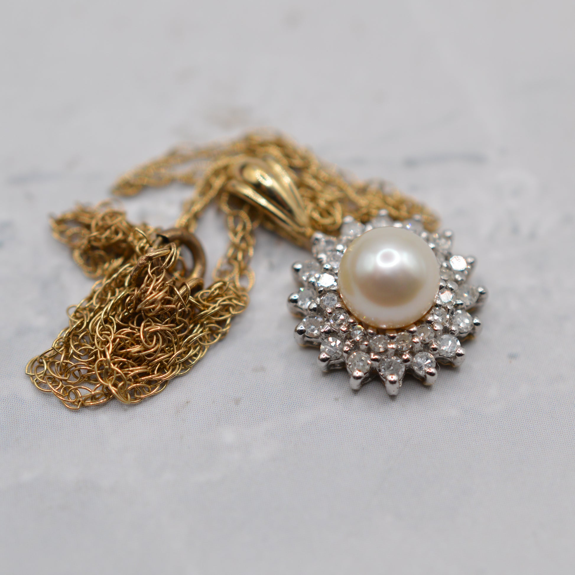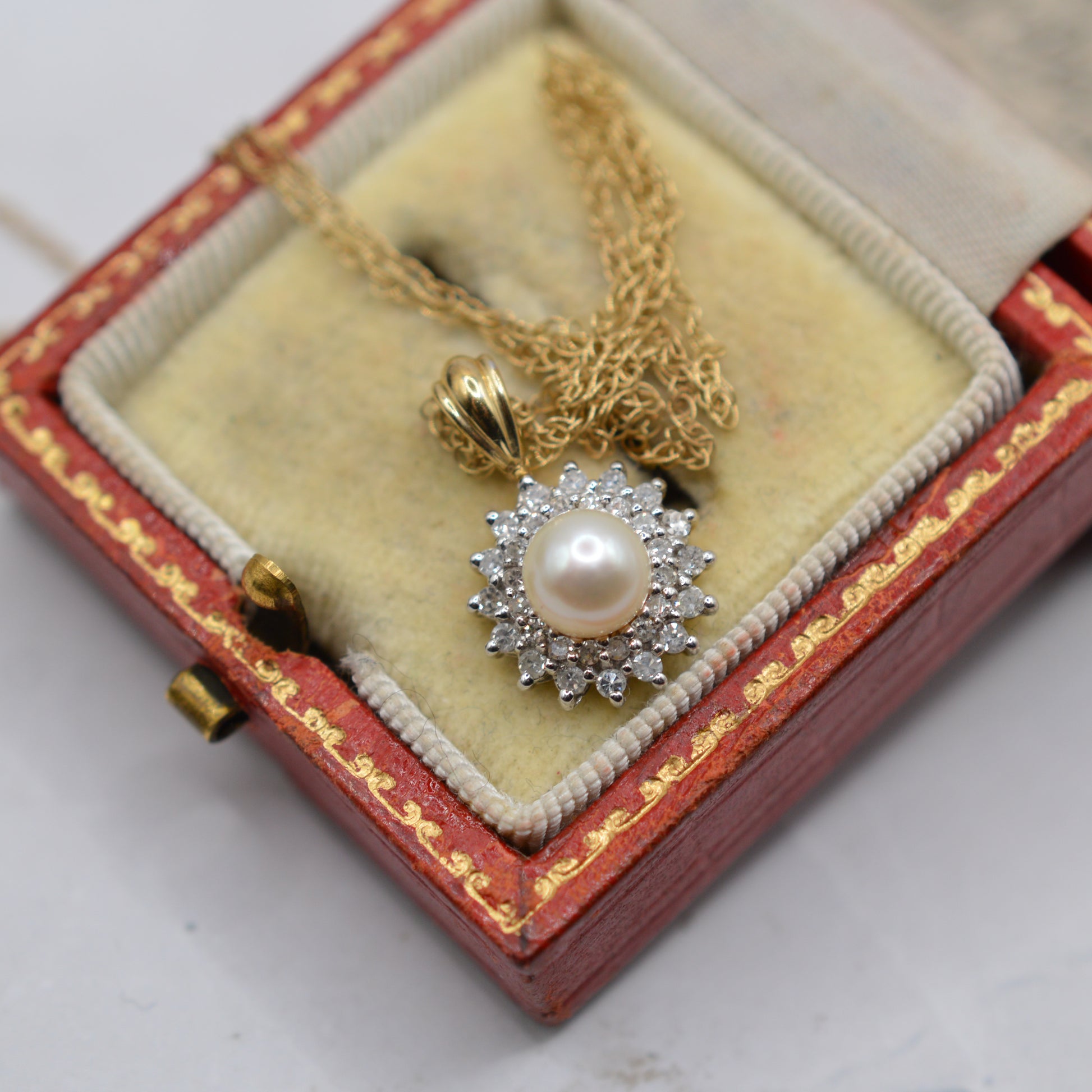 A beautiful 9ct gold pearl & diamond cluster pendant necklace. This elegant piece features a round white cultured pearl at its centre, beautifully framed by two sparkling halos of diamonds, the outer halo set with slightly larger stones to create a sunburst effect. The pendant measures approx. 12mm in diameter (18mm including the bale) and is suspended from a 16" 9ct gold trace link chain, sitting just above the collarbone. An utterly graceful necklace that's perfect for special occasions, formal wear or even wedding day jewellery.