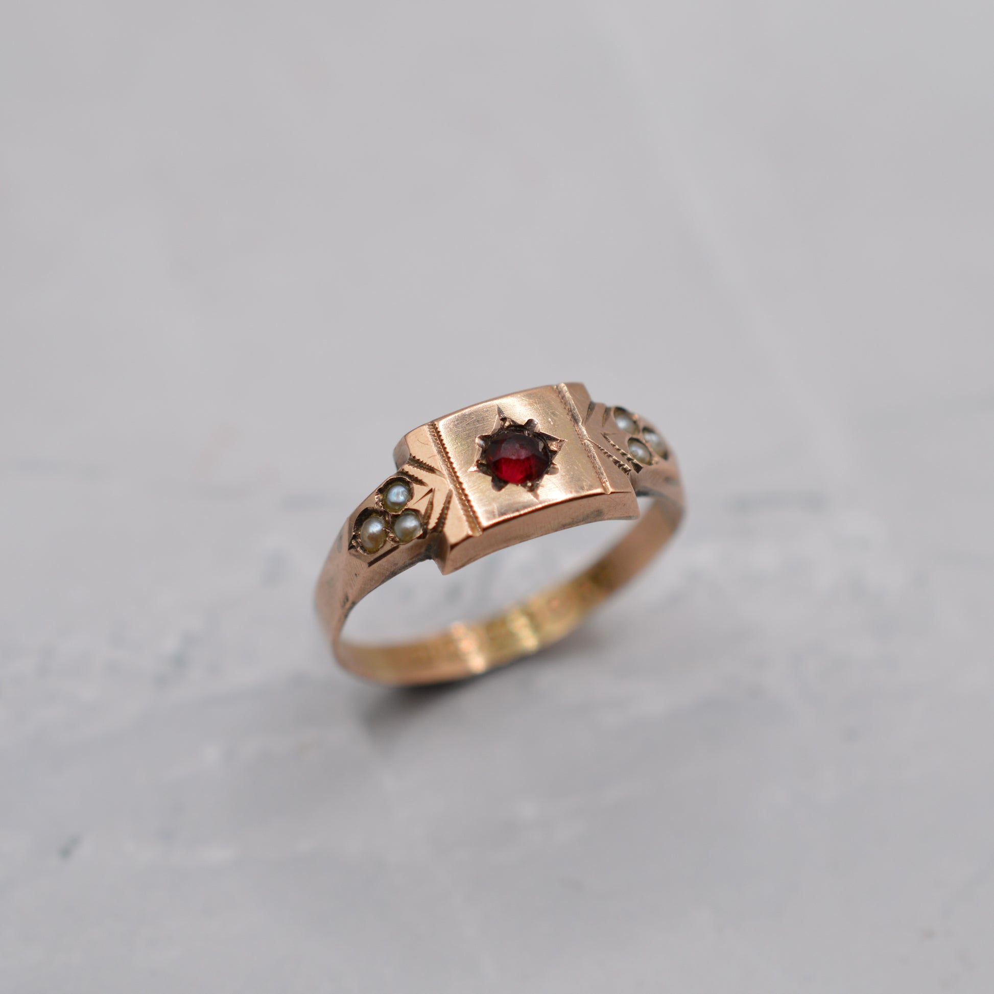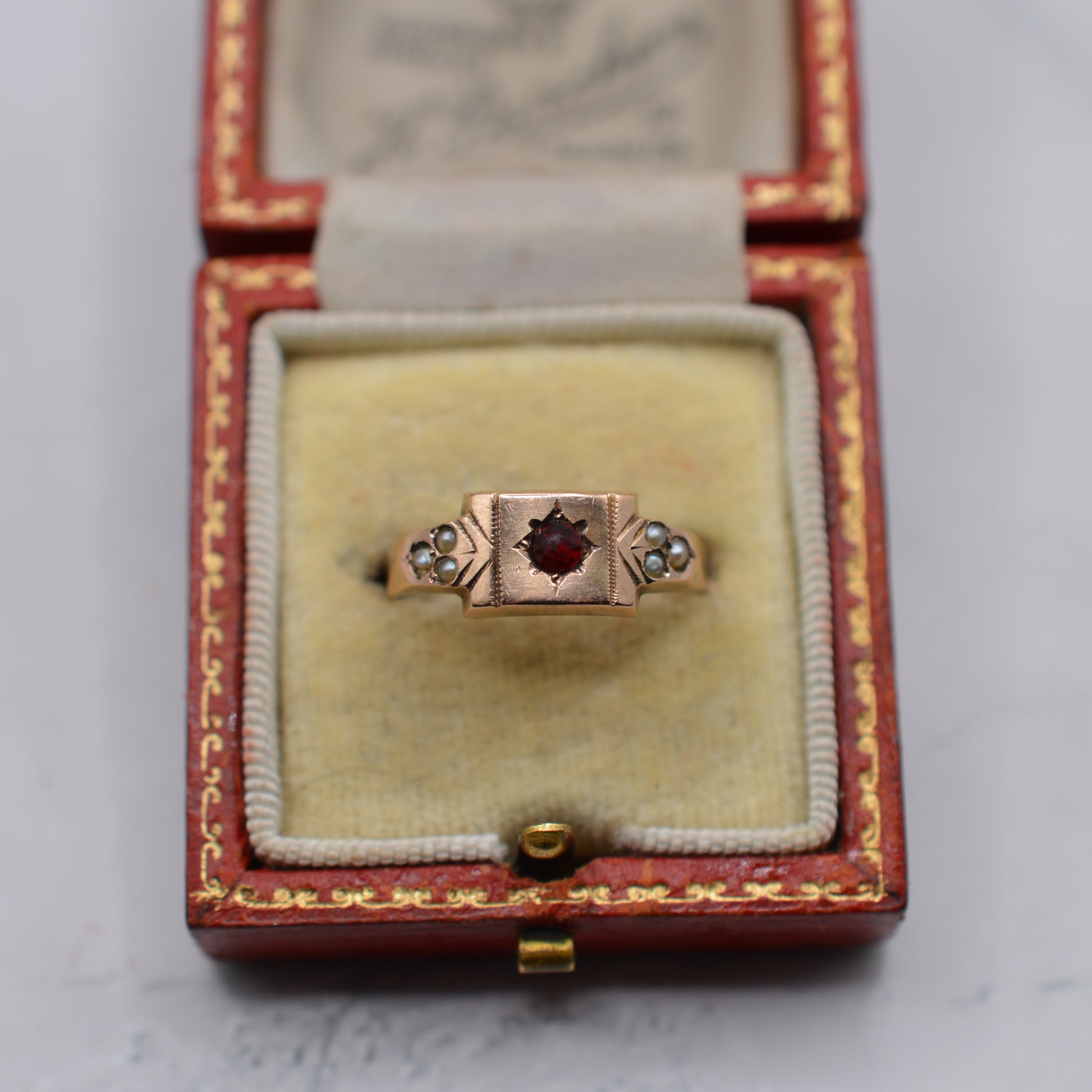 A utterly charming late Victorian 9ct gold pearl & paste ring from 1894. This gorgeous antique treasure features a round red paste stone at the centre, gypsy/star-set into a square plaque. The shoulders are adorned with three small white seed pearls on each side, adding a little elegance and symmetry. Such a wonderful piece in warm, rich gold perfect for antique and history lovers!