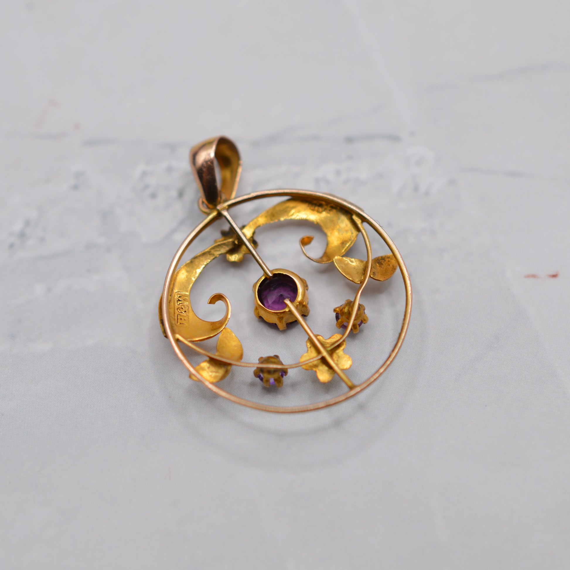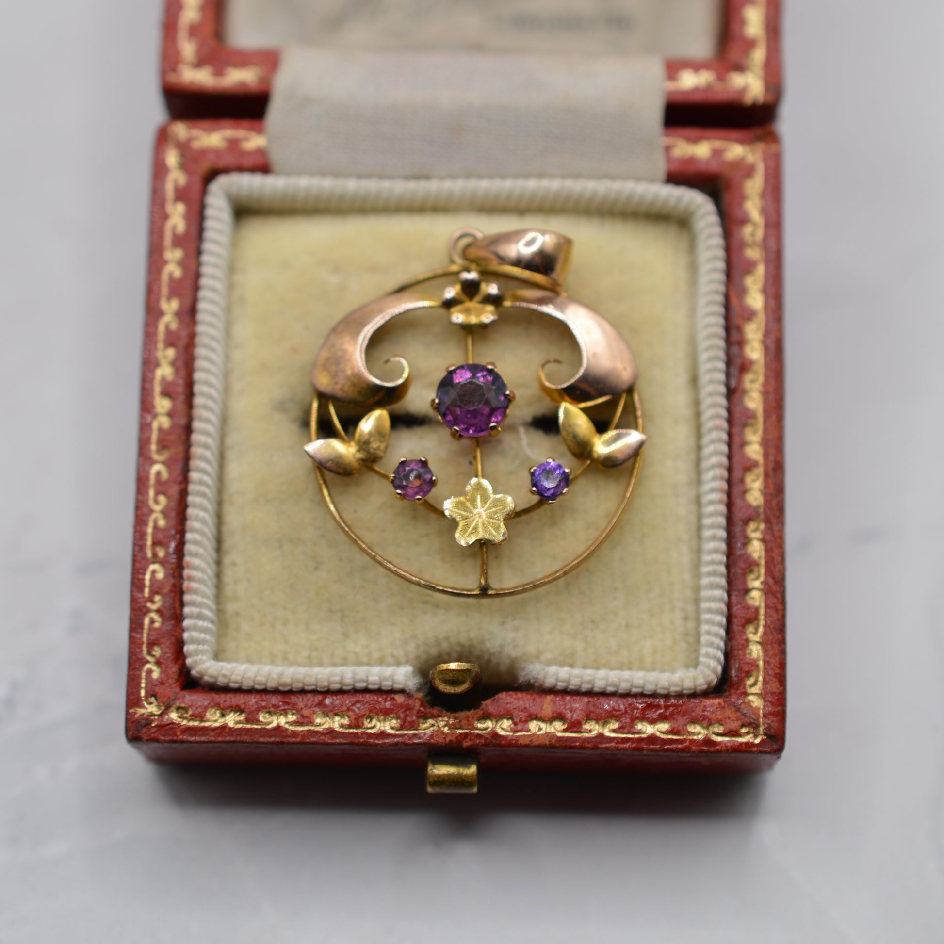 A beautiful antique Edwardian Art Nouveau pendant! This lovely piece features an openwork circular gold frame with a symmetrical foliate-inspired design, with three purple stones -- one amethyst and two paste stones -- adding a pop of colour and sparkle. The pendant also features delicate leaf and flower details and its gold offers a warm hue that between rose and yellow gold.