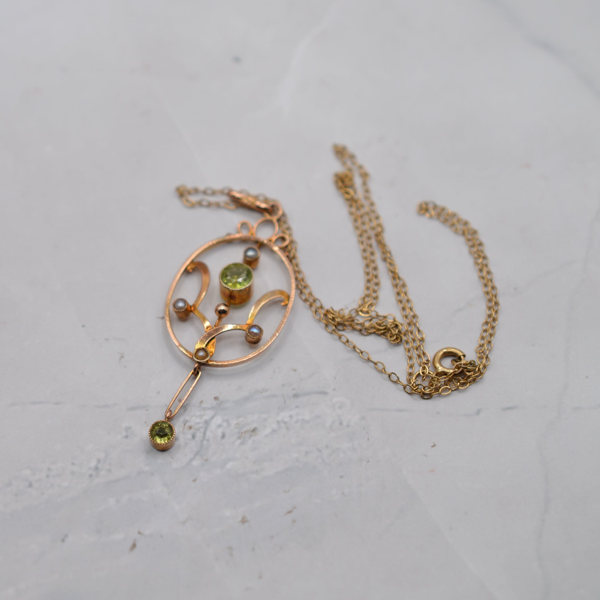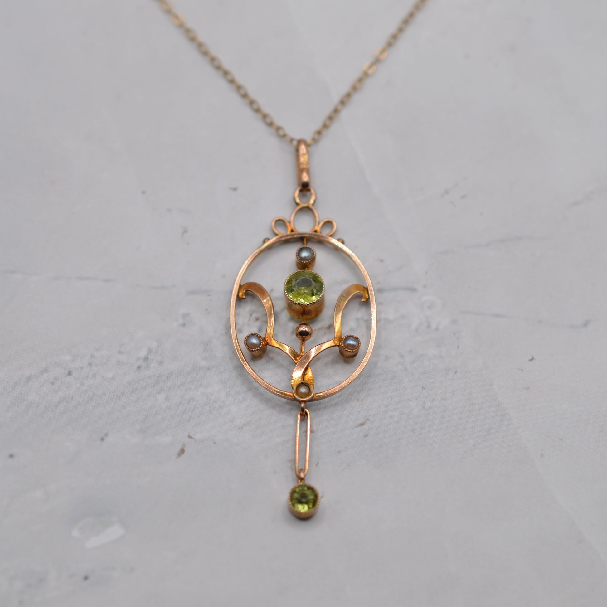Antique Edwardian 9ct Gold Peridot & Pearl Lavalier Pendant Necklace