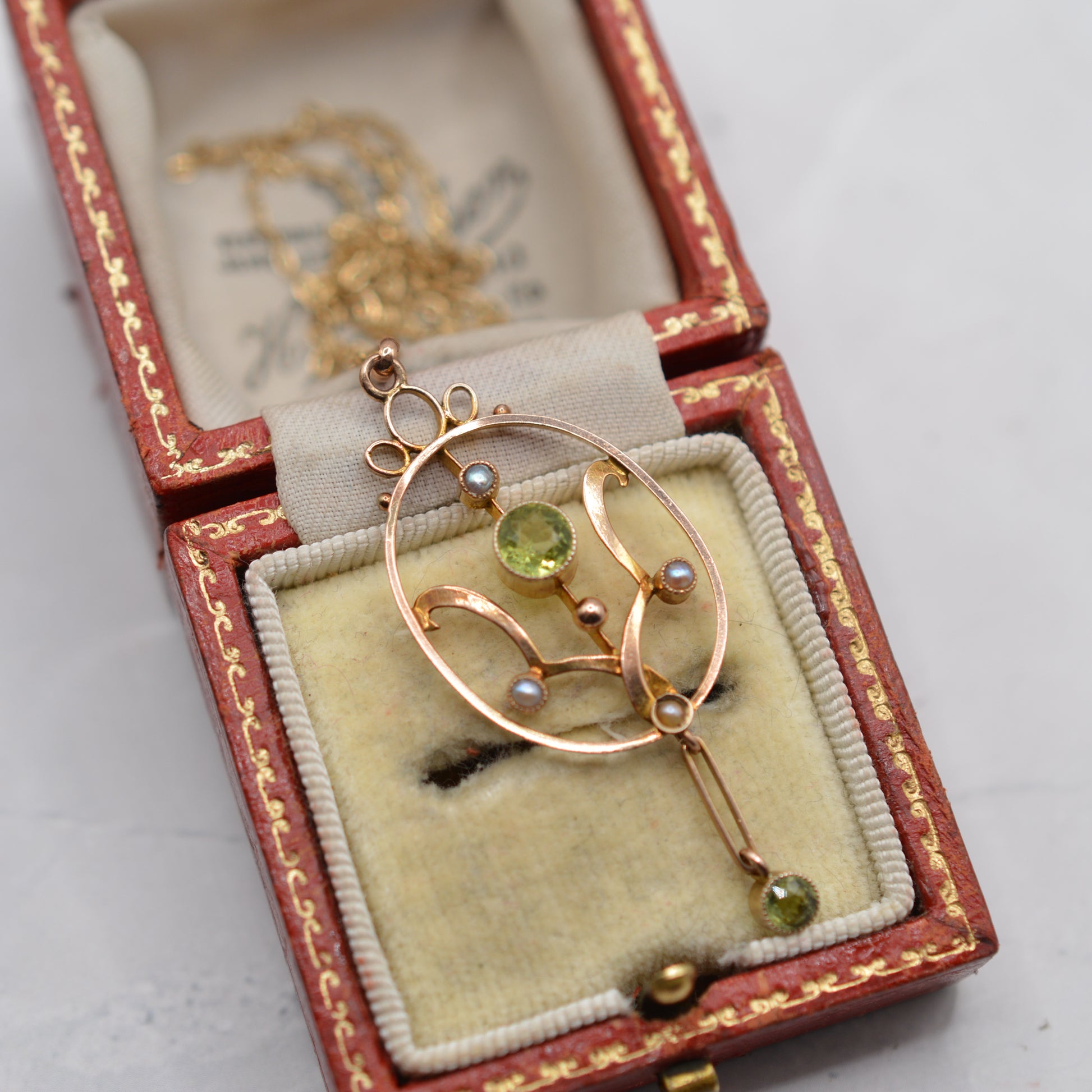 A truly gooorgeous antique Edwardian 9ct gold peridot and pearl lavalier pendant necklace. This elegant openwork pendant features a green peridot at the centre, framed by delicate scrolling gold work and four small white seed pearls, with a further suspended peridot drop below. It is a beautiful Art Nouveau piece with fabulous symmetry and antique character.