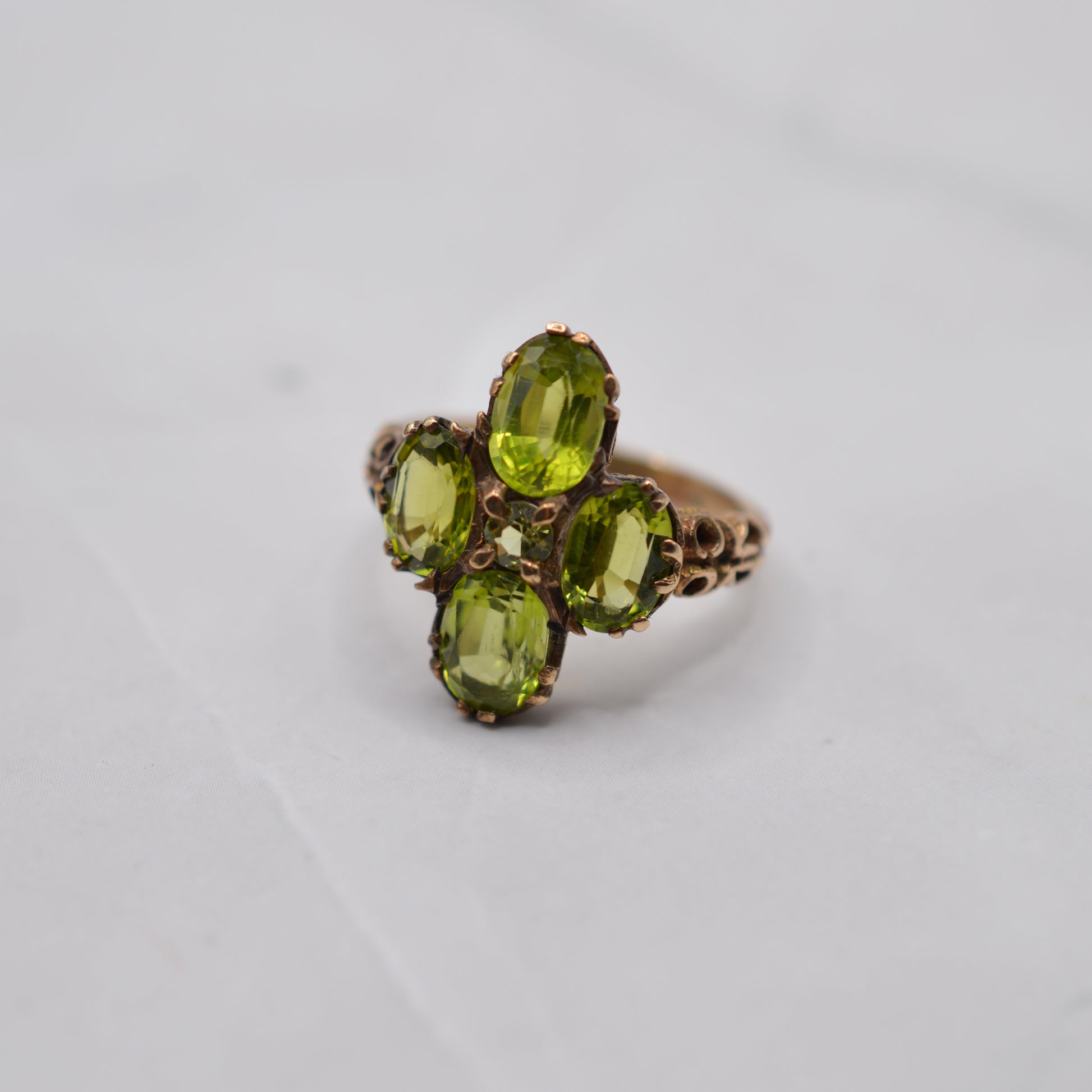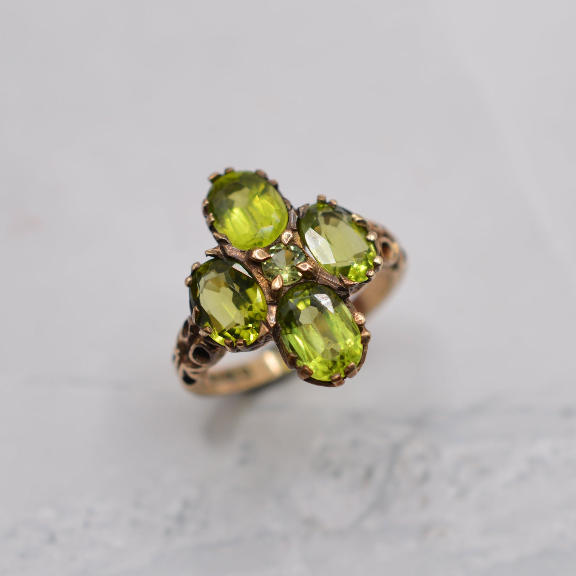An incredibly stunning and rather unique 1970s vintage peridot cluster ring. This eye-catching statement piece features a round-cut peridot at the centre, framed by four oval-cut peridots arranged in a striking cross formation that gives it a fabulous late Victorian revival feel. The gemstones have a delicious lime green glow with gorgeous clarity and sparkle, all claw-set in rich 9ct yellow gold. A bold, dazzling ring with a large cluster that really stands out - perfect for as an August birthstone ring or for lovers of unusual vintage designs or large gemstone clusters.