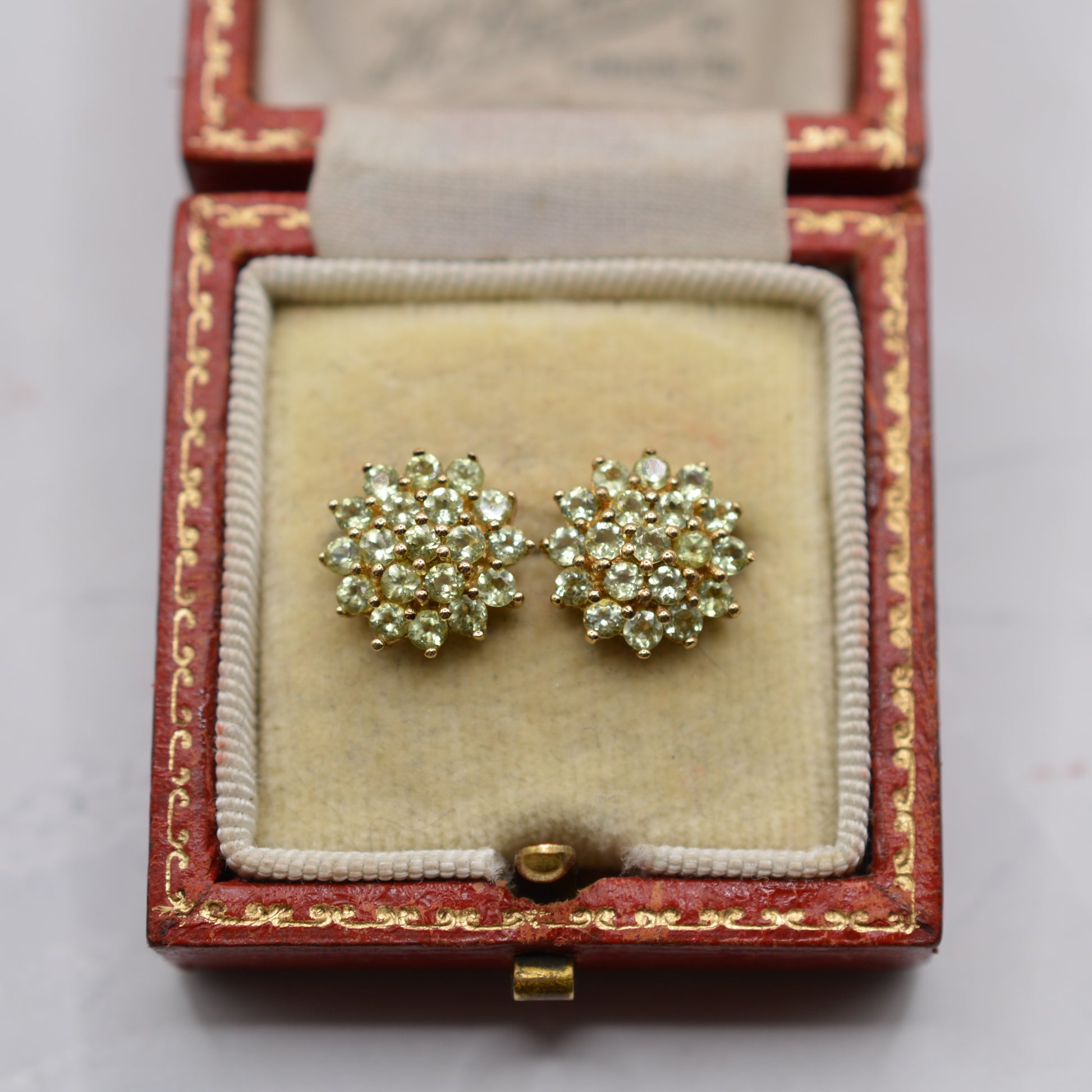 A stunning pair of 9ct gold peridot cluster earrings from the early 2000s. Each stud is set with an array of sparkling and delicious lime-green peridots, arranged in a circular cluster that adds a gorgeous pop of colour. The peridot gemstones are bright, lively and full of colour - perfect for anyone who loves statement earrings that dazzle!