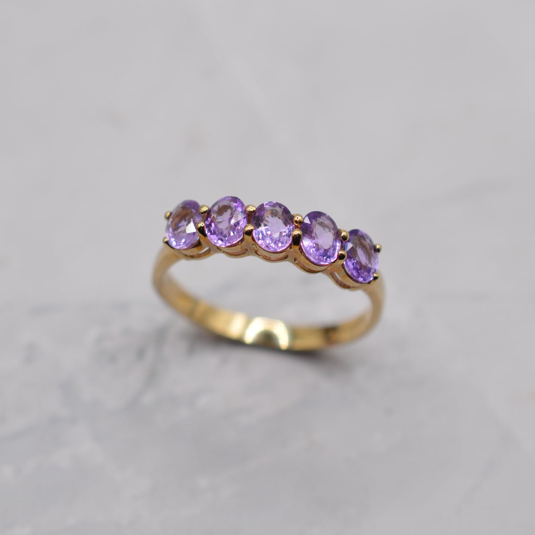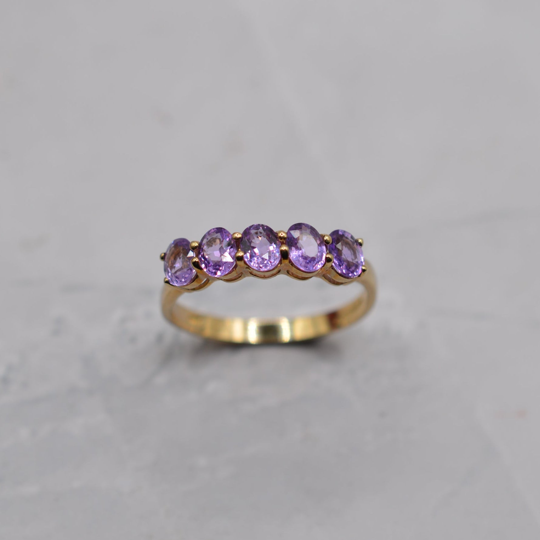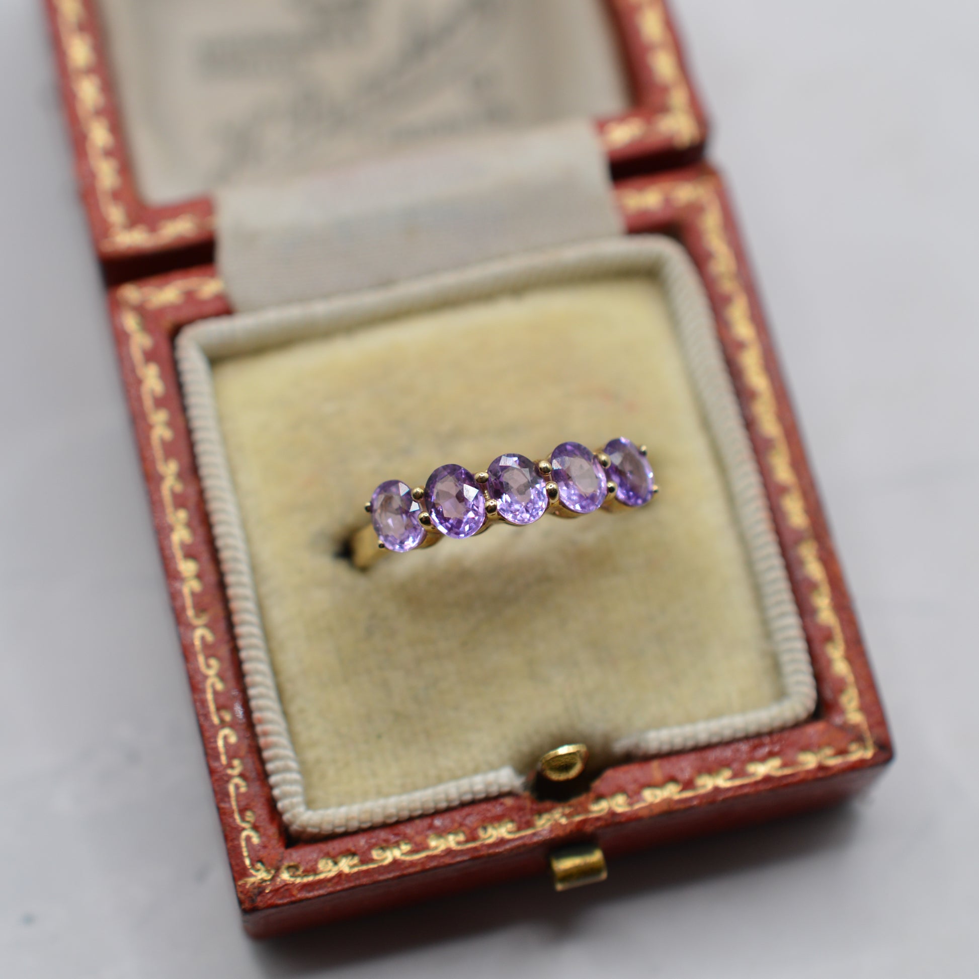 An utterly delightful 9ct gold pink sapphire ring. This dazzling five-stone treasure features a row of sparkling oval-cut pink sapphires in the most stunning pale shade of fuchsia, all well-matched, twinkly and with lovely clarity.