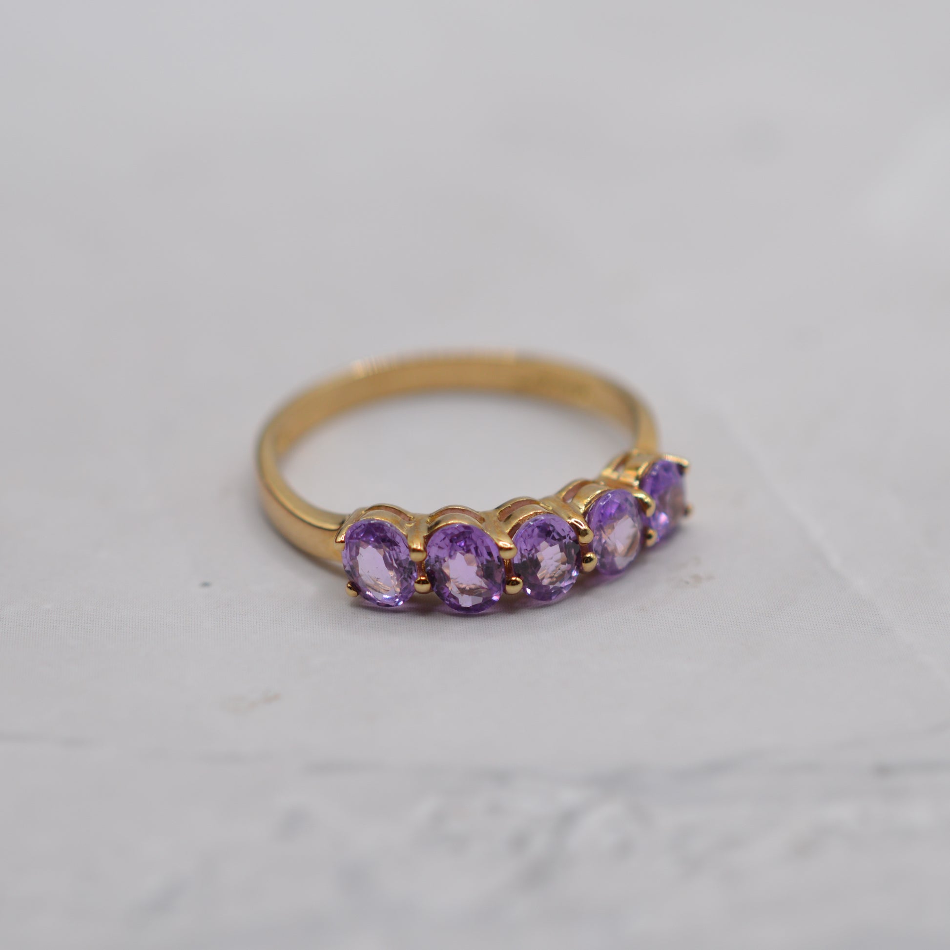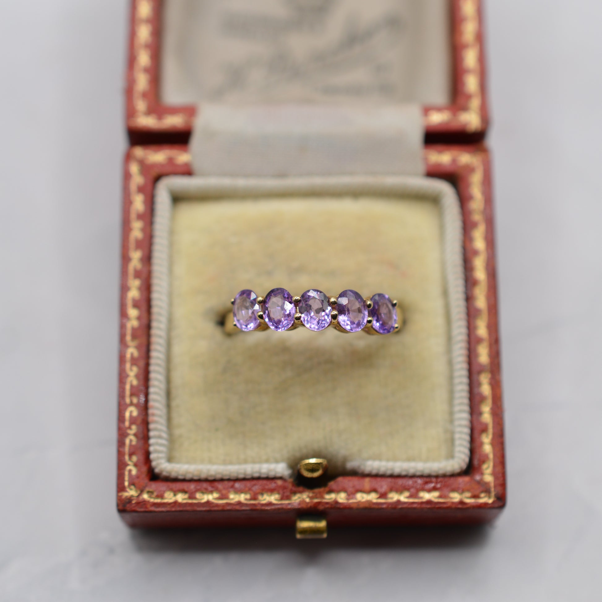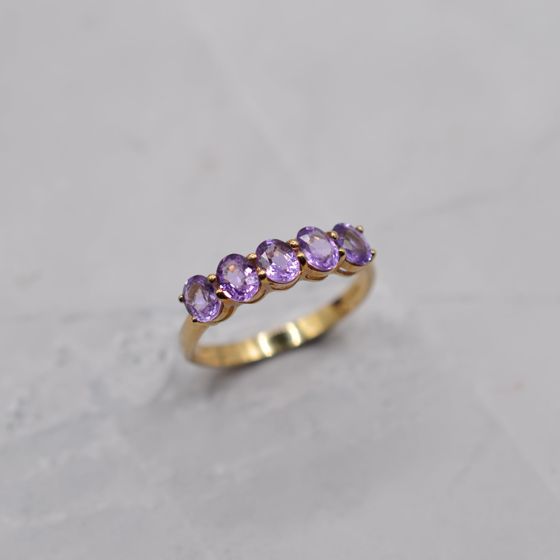 An utterly delightful 9ct gold pink sapphire ring. This dazzling five-stone treasure features a row of sparkling oval-cut pink sapphires in the most stunning pale shade of fuchsia, all well-matched, twinkly and with lovely clarity.