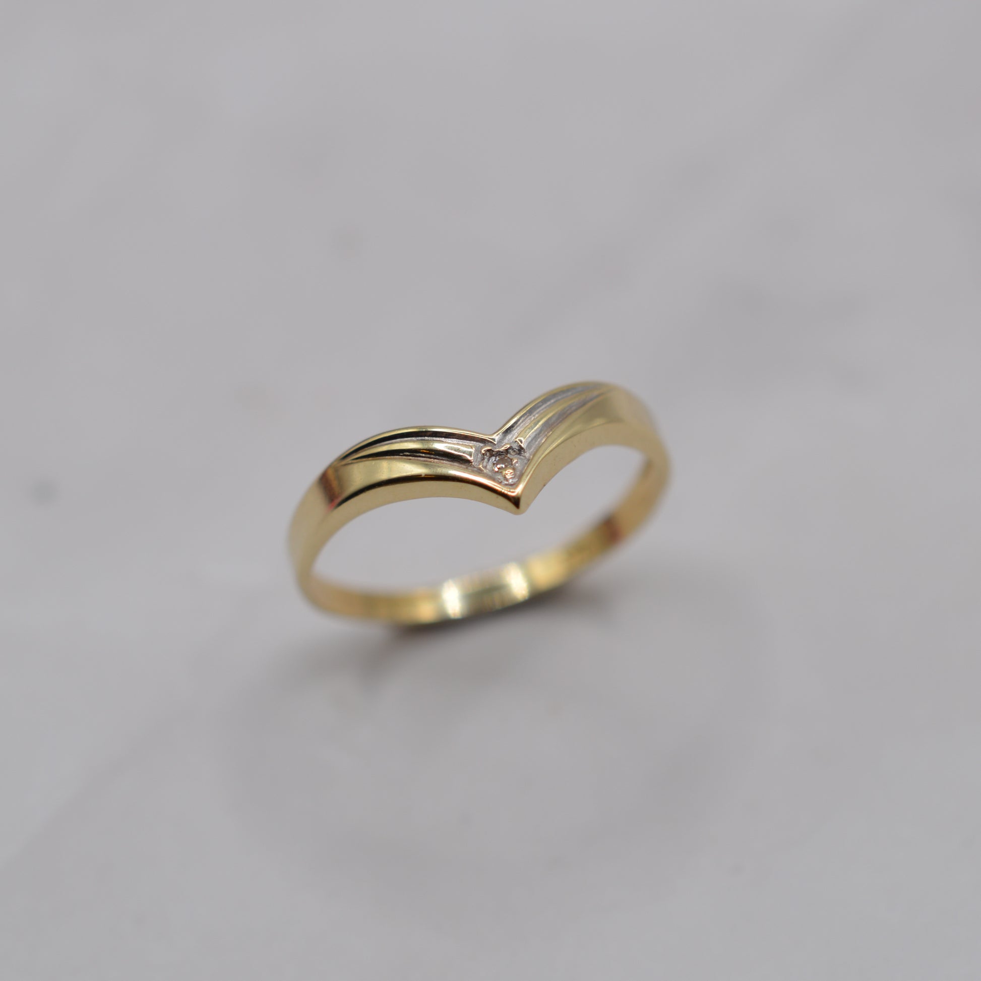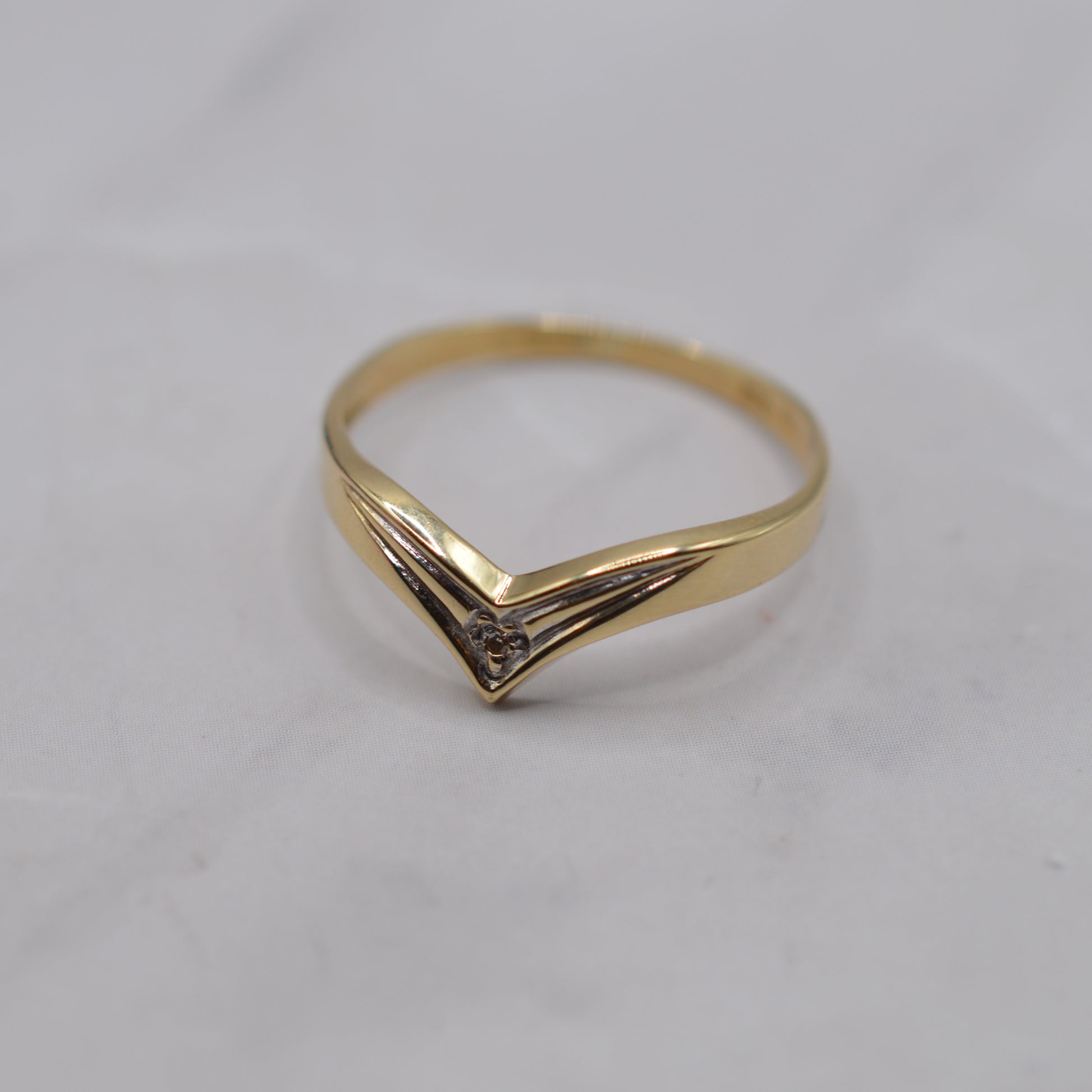 An adorable & minimalist 9ct gold wishbone ring with a touch of sparkle. This dainty piece features the classic V-shaped chevron design, with a tiny diamond chip set at the tip to add just a little shimmer. It's a lovely minimalist ring that's perfect worn alone or stacked with others for a layered look.