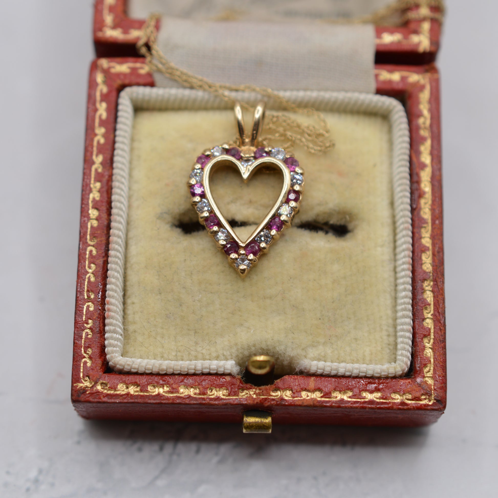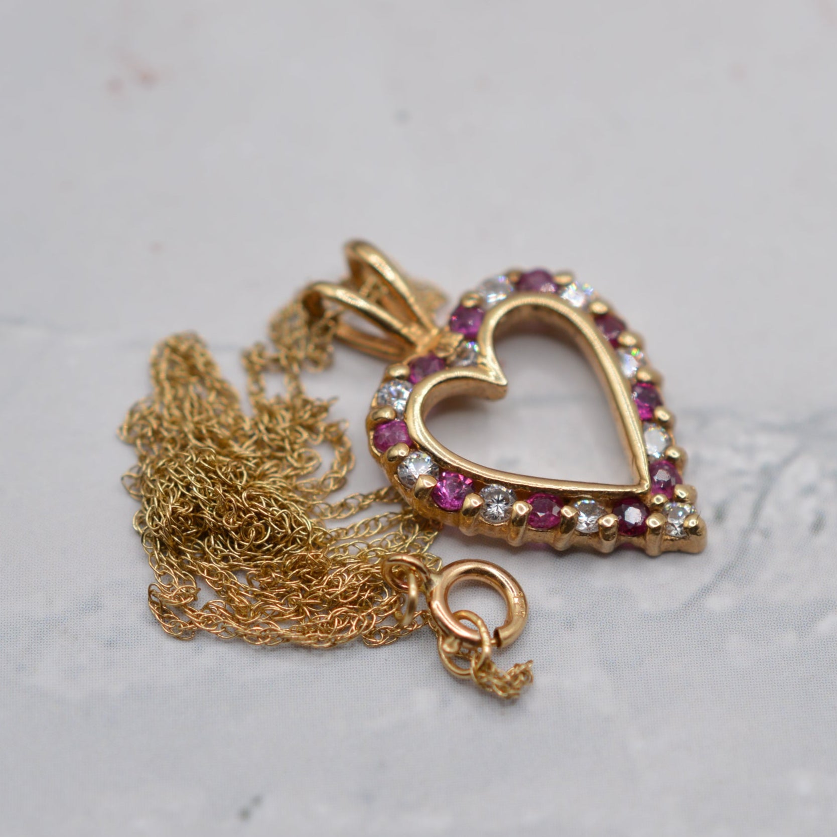 1990s 9ct Gold Ruby & CZ Heart Pendant Necklace