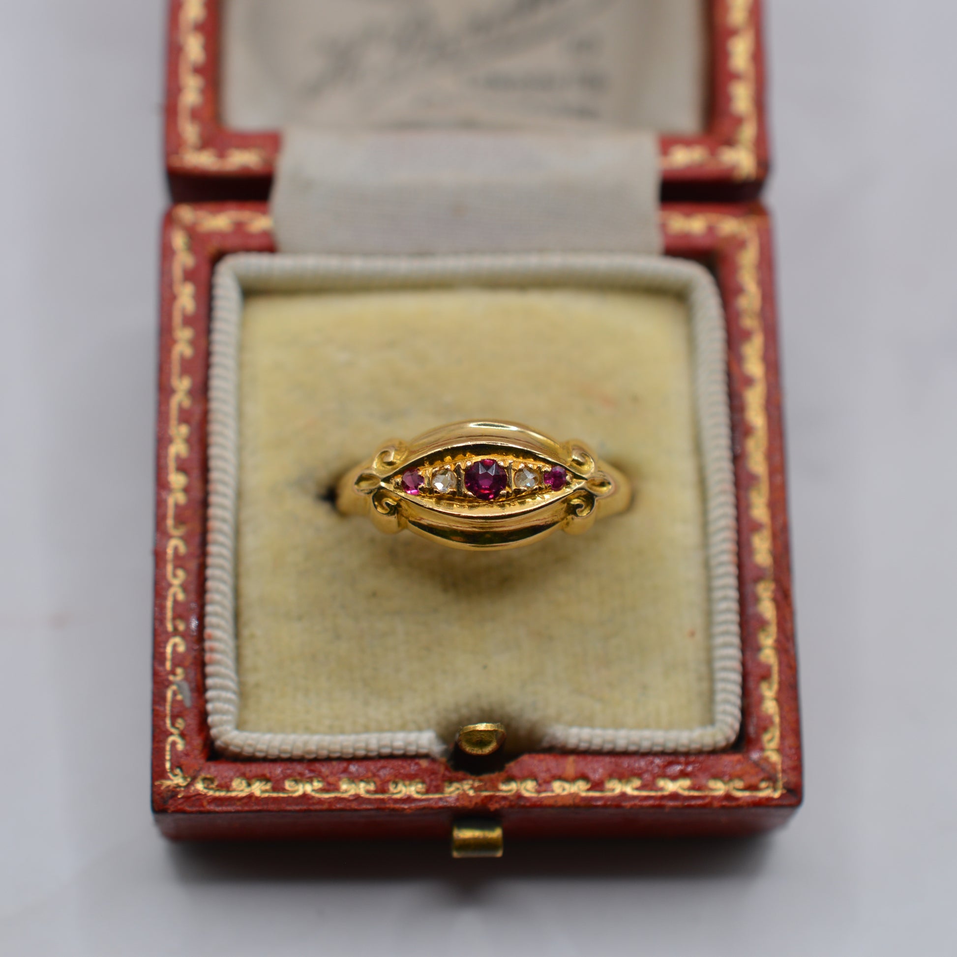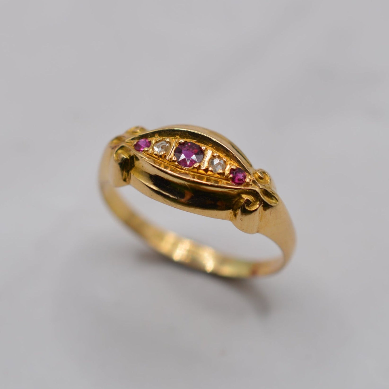 Antique 1918 18ct Gold Ruby & Diamond Five-Stone Boat Ring