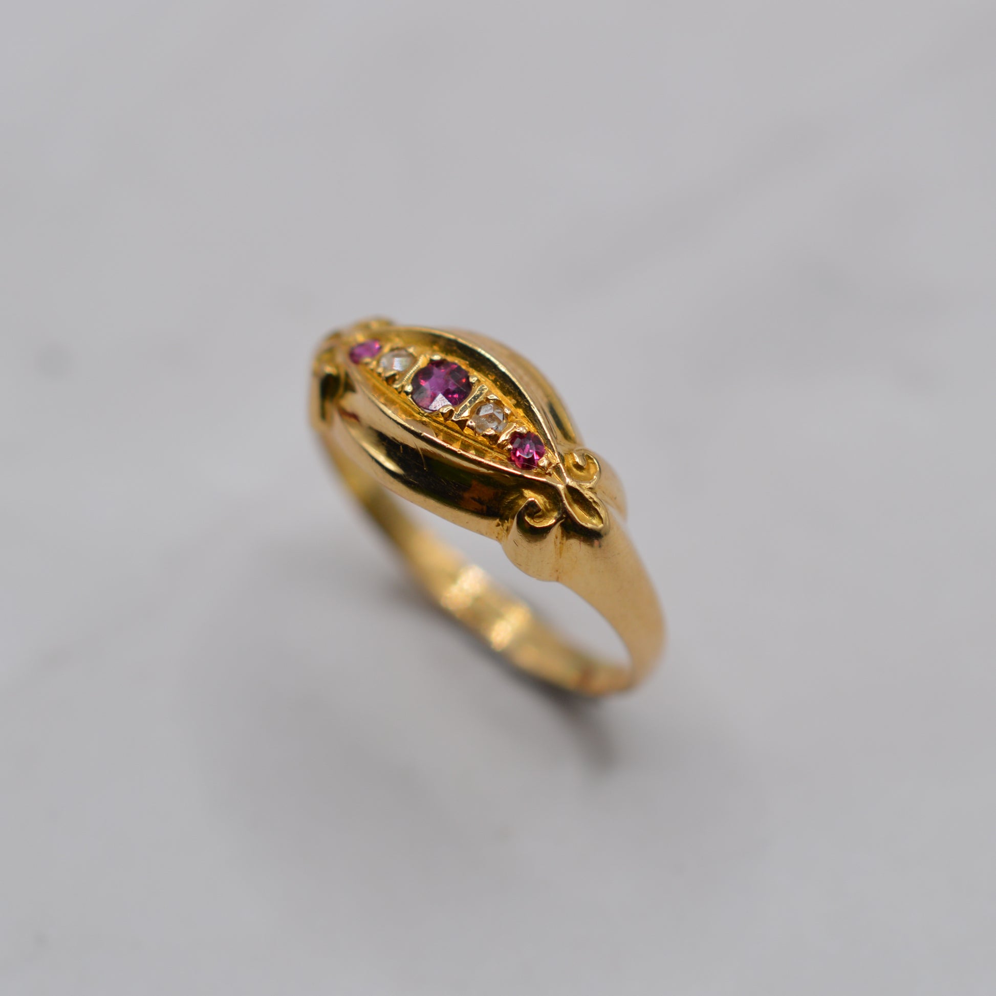 Ohhh a truly delightful antique 18ct gold ruby and diamond boat ring! This beautiful 1918 piece features five gemstones set across a buttery yellow gold band: three pink rubies interspaced with two twinkly rose-cut diamonds. The central ruby is the largest at approx. 2mm diameter, flanked by smaller rubies and diamonds that bring plenty of sparkle. The setting itself is boat-shaped with charming fleur-de-lys details at each end. A gorgeous treasure that is classic, timeless and beautifully made.