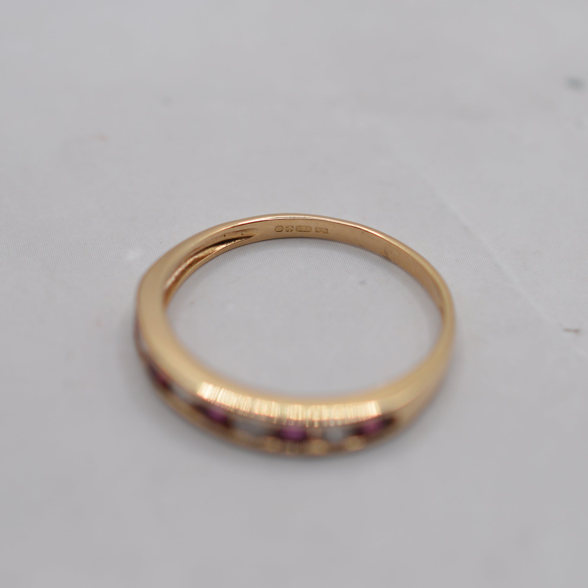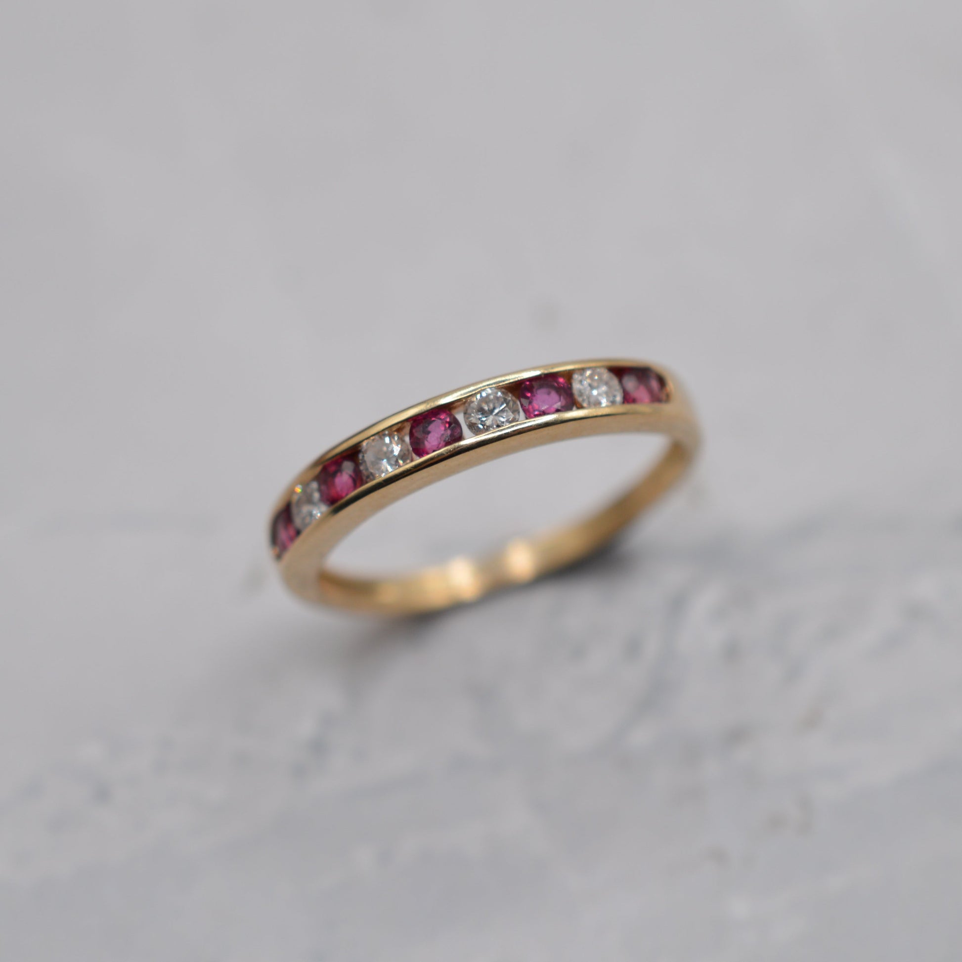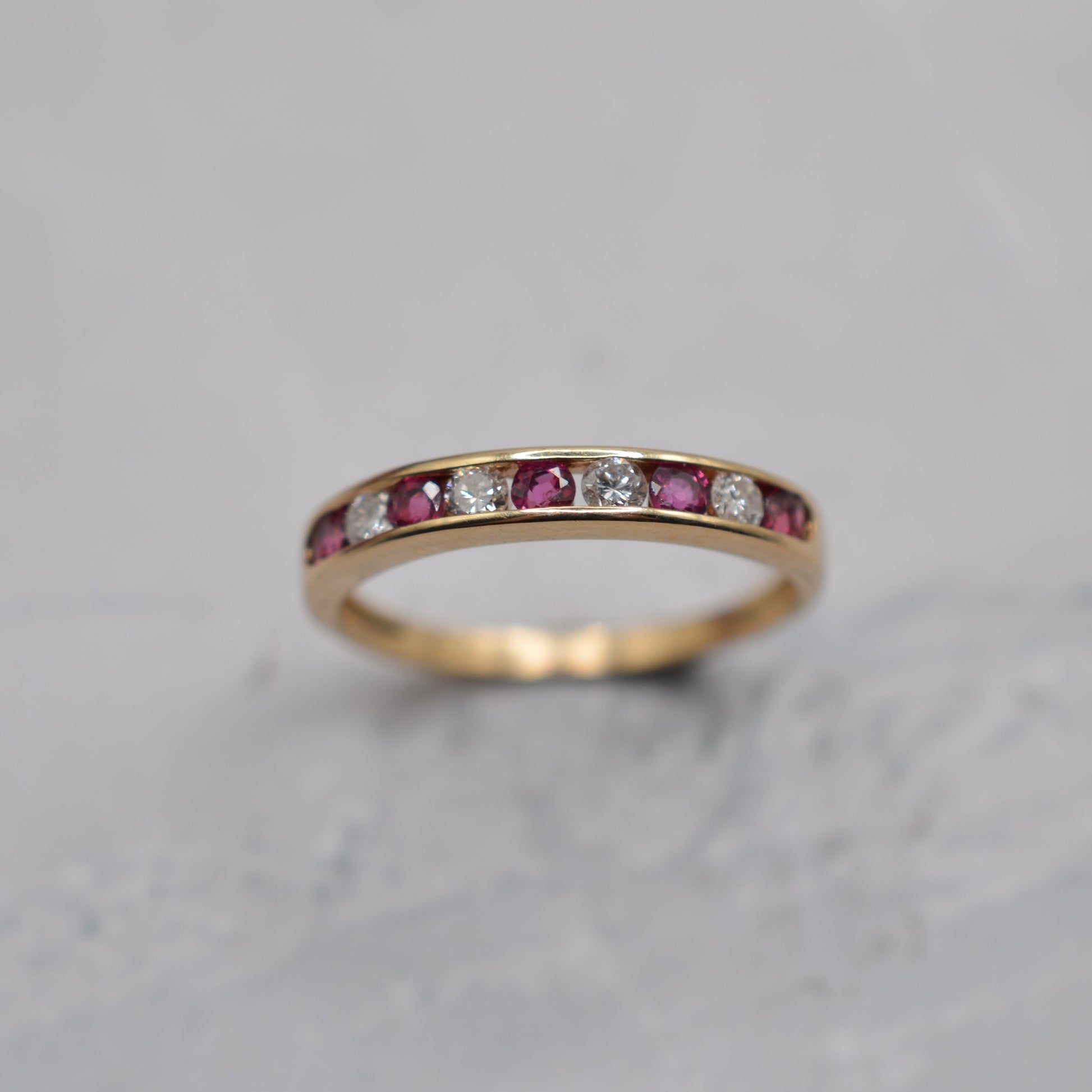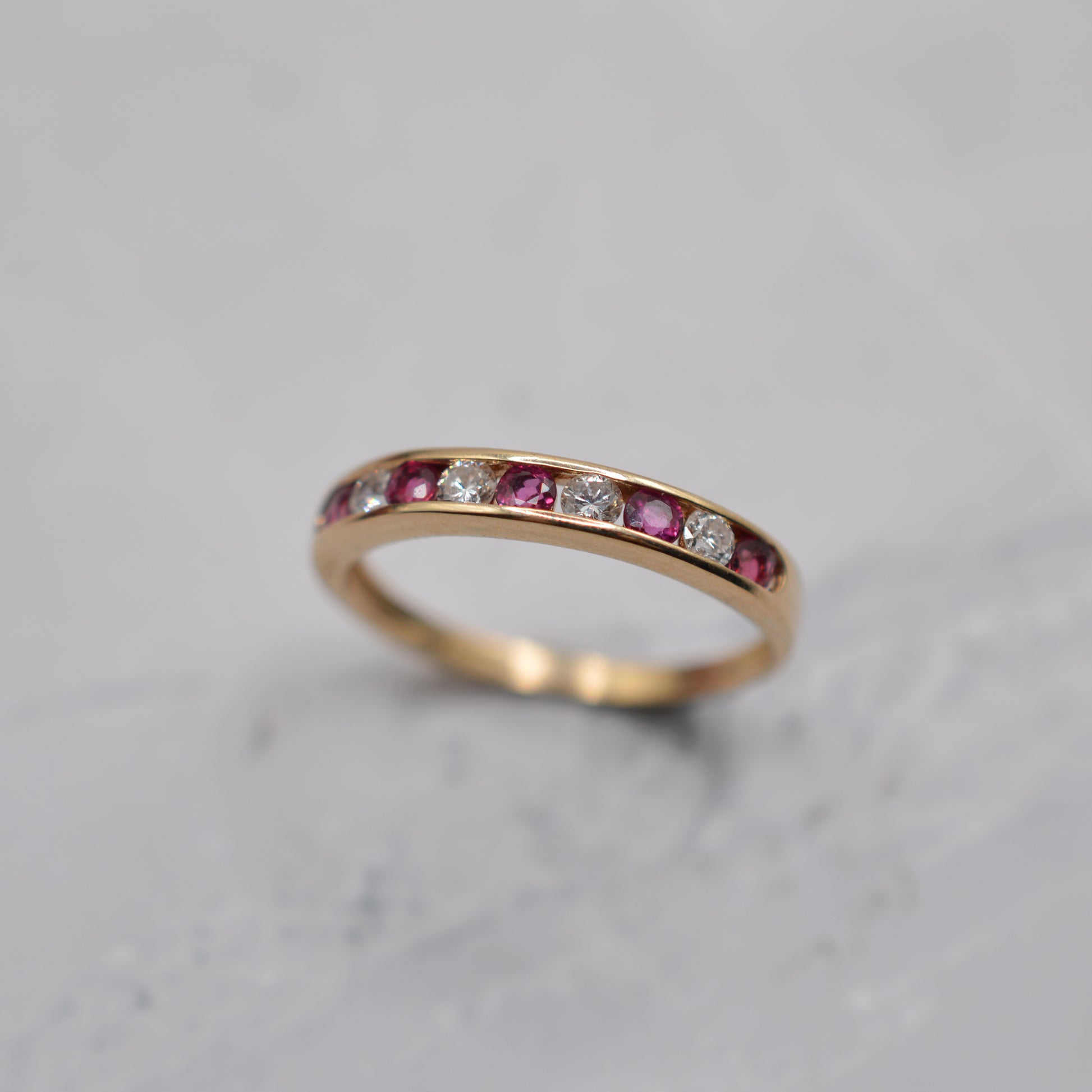 A sweet 1990s 9ct gold ruby and diamond half-eternity ring. This lovely piece features a row of alternating rich crimson rubies and bright sparkling diamonds, channel-set in a slim yellow gold band (nine gemstones in total). The band measures just under approx. 2.5mm wide, making it perfect for stacking or wearing alone as a minimalist piece.