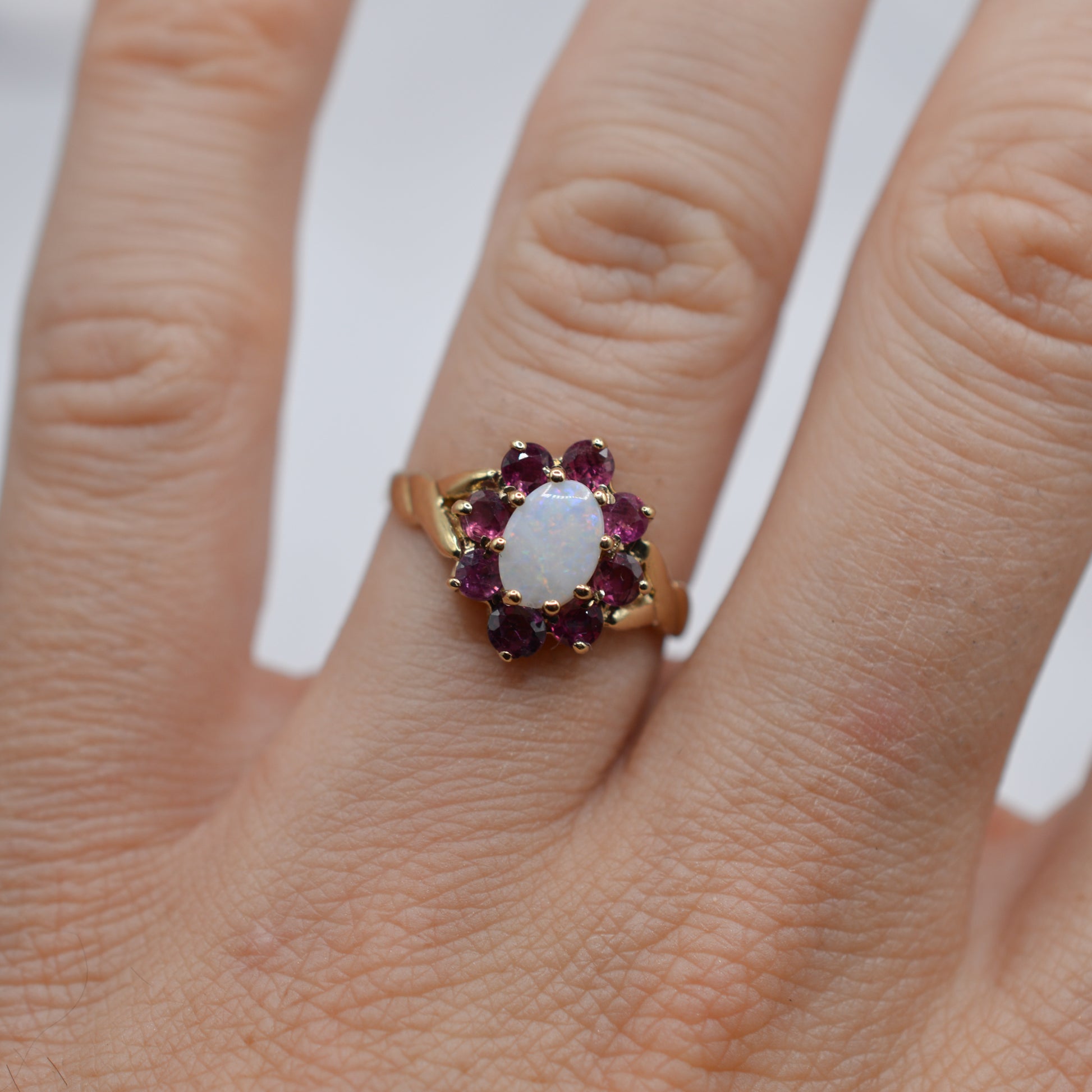 1980s Vintage 9ct Gold Opal & Ruby Cluster Ring