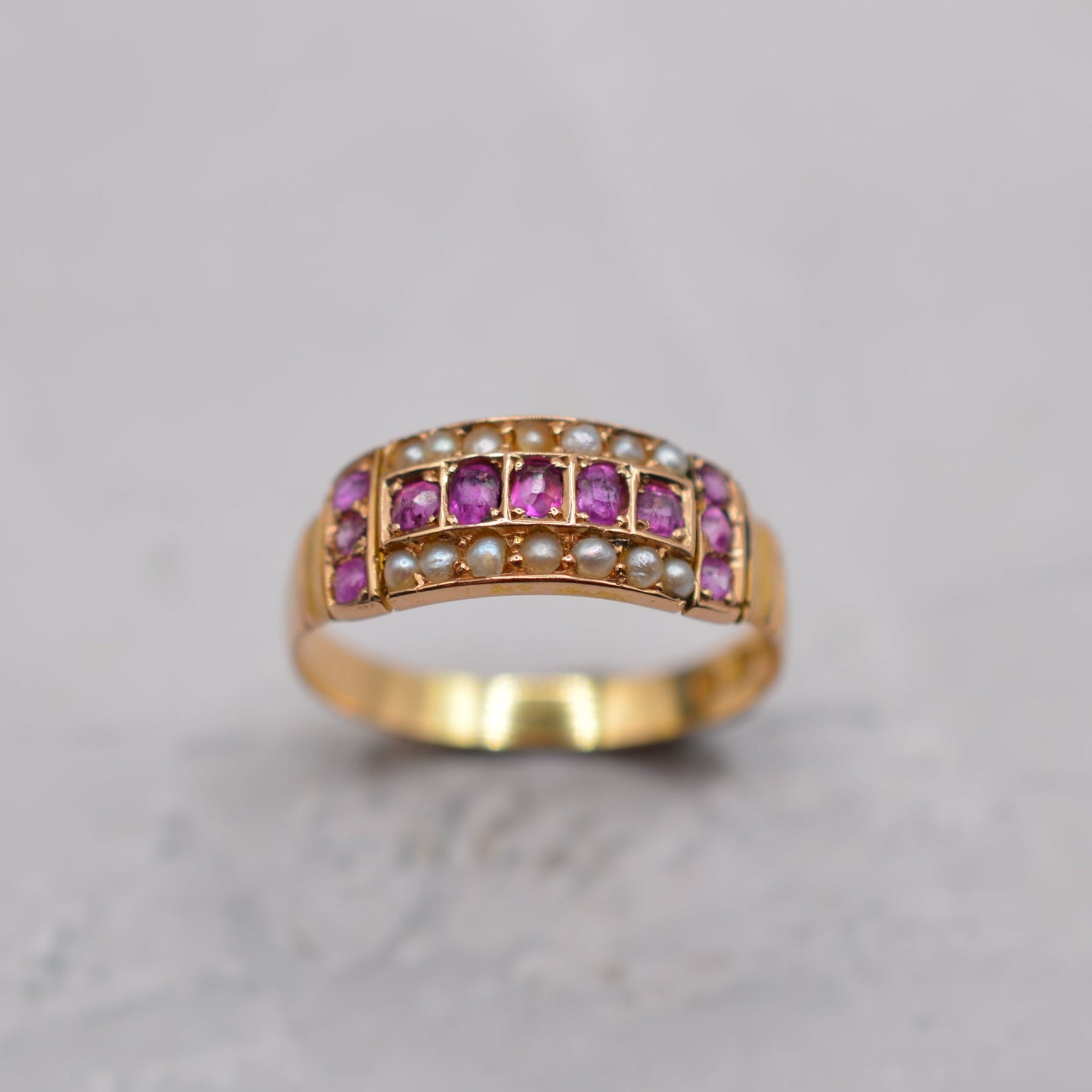 A truly beautiful Victorian 18ct gold ruby and pearl ring. Dating to 1886, this charming antique piece features a central row of oval-cut pink rubies, framed above and below by rows of creamy white seed pearls; each shoulder is further accented with three round pink rubies, creating a rich three-row design full of colour and symmetry. It is such an elegant and feminine example of late Victorian jewellery that is sure to delight!