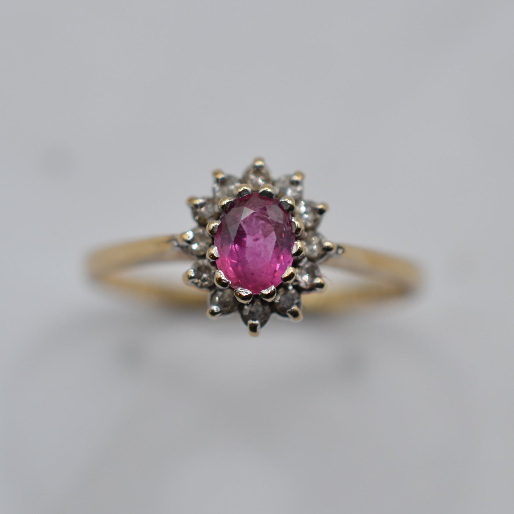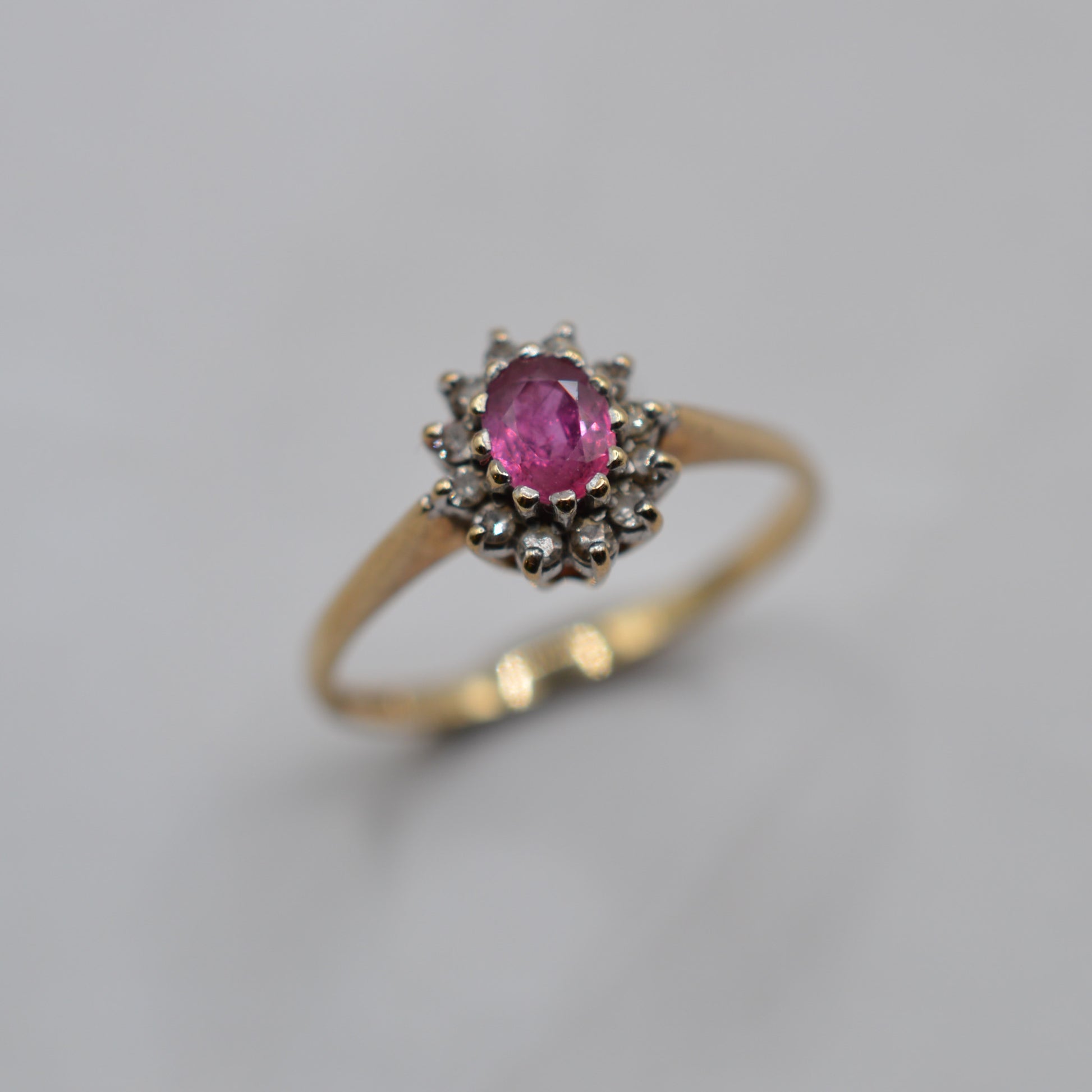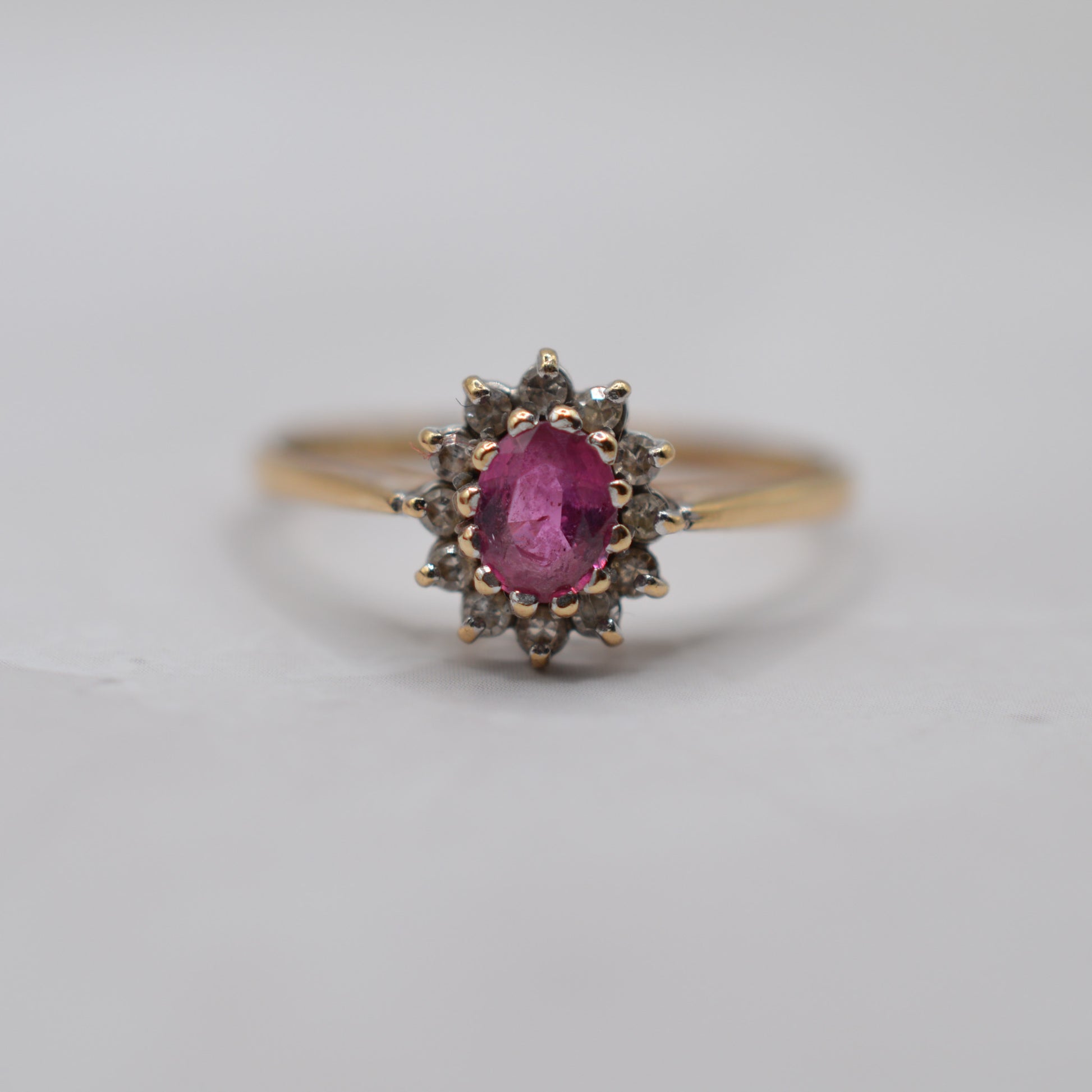 A rather pretty 9ct gold ruby and diamond cluster ring. This sweet 1980s piece features an oval-cut ruby in a lovely crimson shade of pink, framed by a sparkling halo of twelve little diamonds. A classic, timeless design that works beautifully for everyday wear or special occasions. Petite but eye-catching, it would make a lovely addition to any jewellery collection.