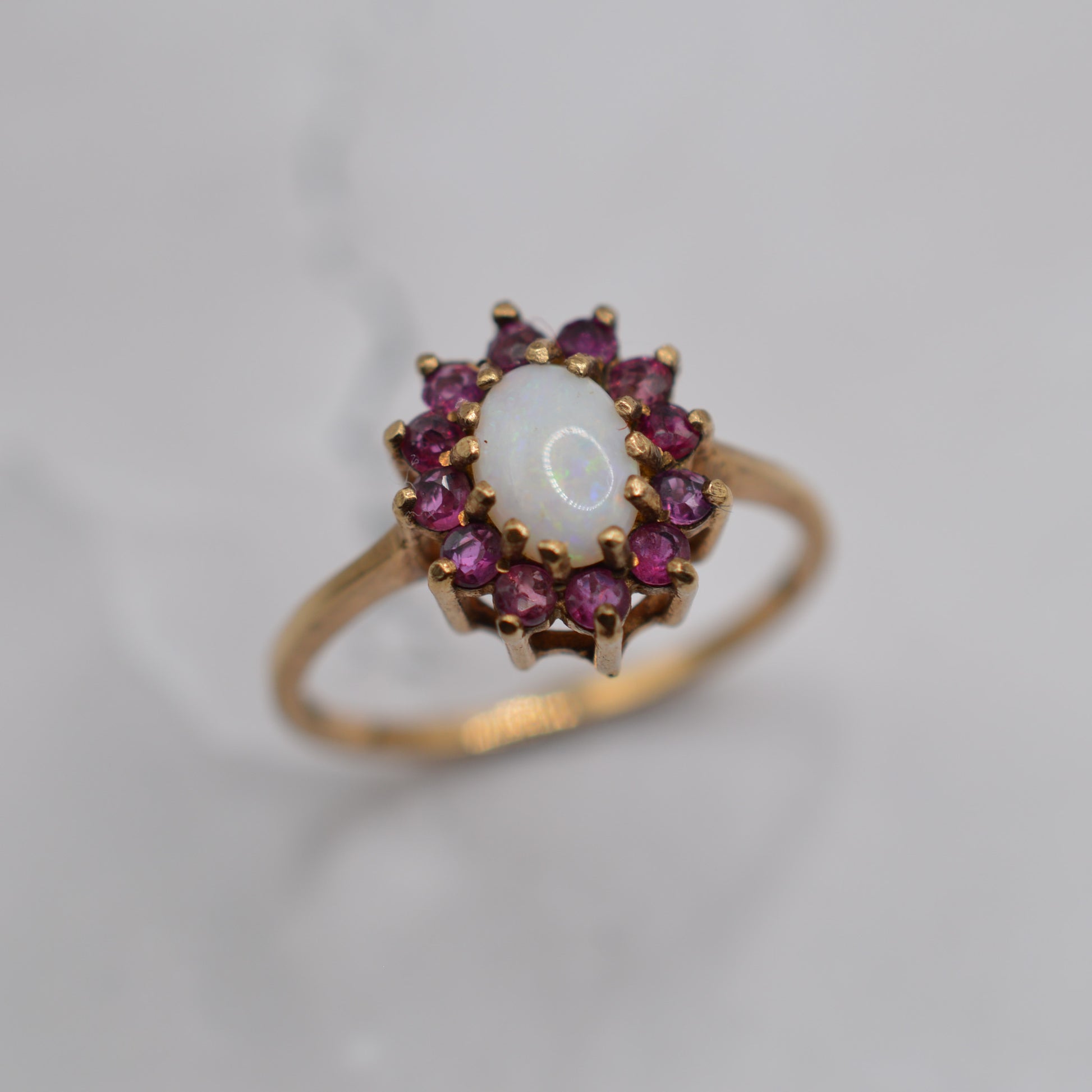 An incredibly pretty 1970s 9ct gold opal and ruby cluster ring. This beautiful vintage treasure features an oval-shaped opal at the centre, glowing with flashes of yellows, greens and blues. Surrounding the opal sits a delicate halo of twelve pink rubies in a gorgeous shade of pink, creating a feminine and stunning contrast that really pops. So elegant and adorable -- the pictures don't do it justice!