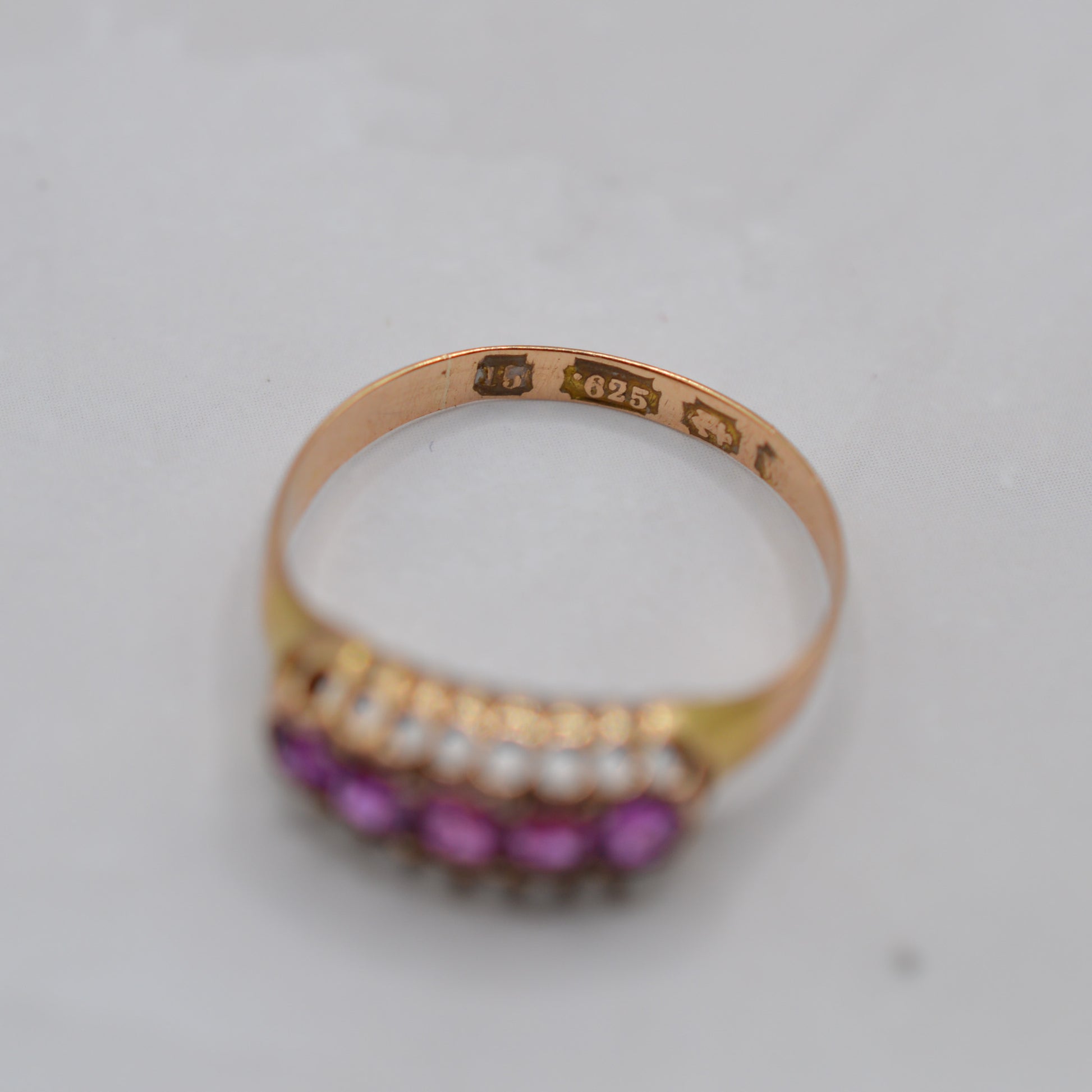 Such a beauuuutiful and sparkly antique 15ct gold ruby ring! This delightful 1920s piece features five oval-shaped rubies in a stunning shade of pink, set in a classic pierced gallery setting. It is crafted in 15ct gold, a lovely high-purity gold no longer being made, and is a luxurious, collectible and ultra delightful ring for any occasion.