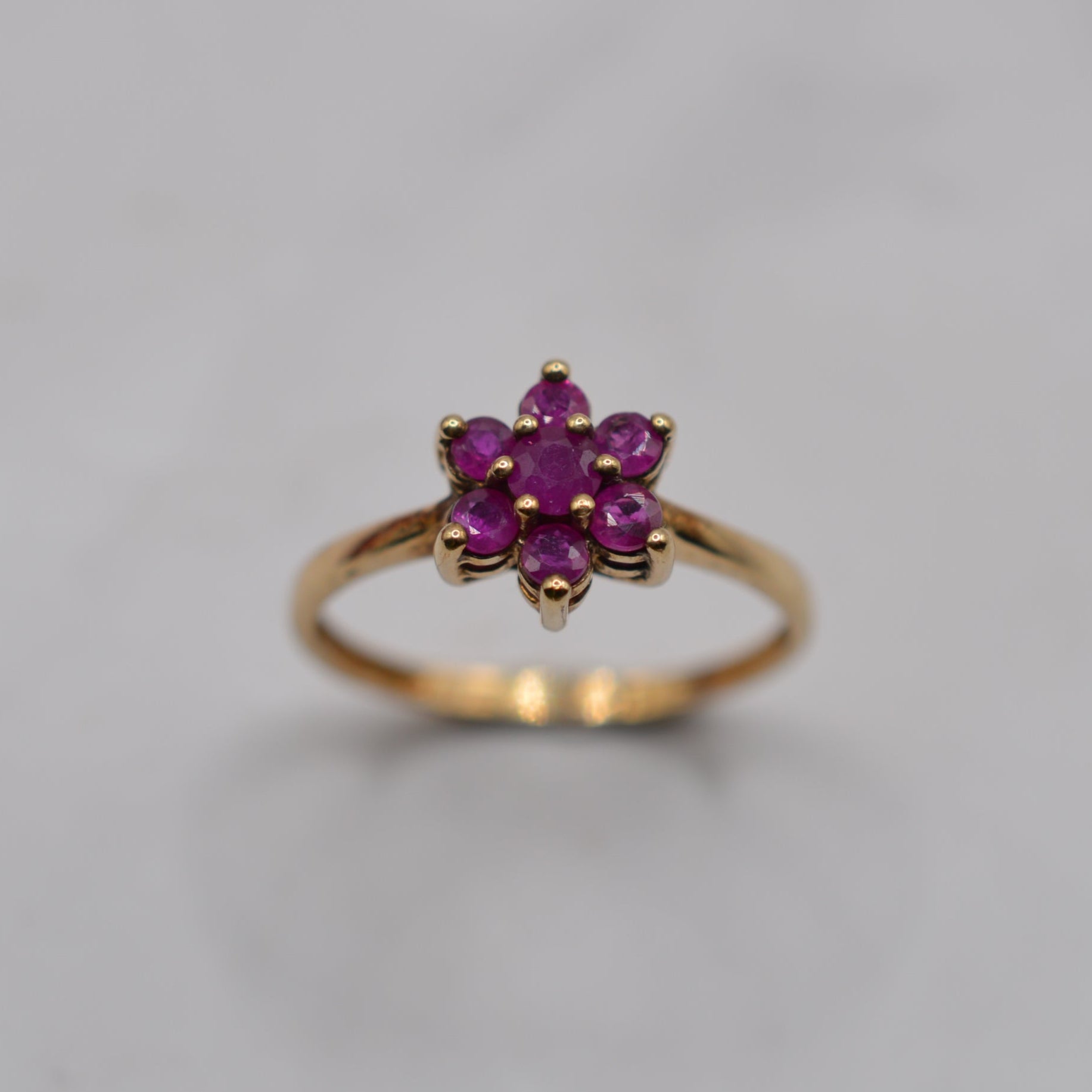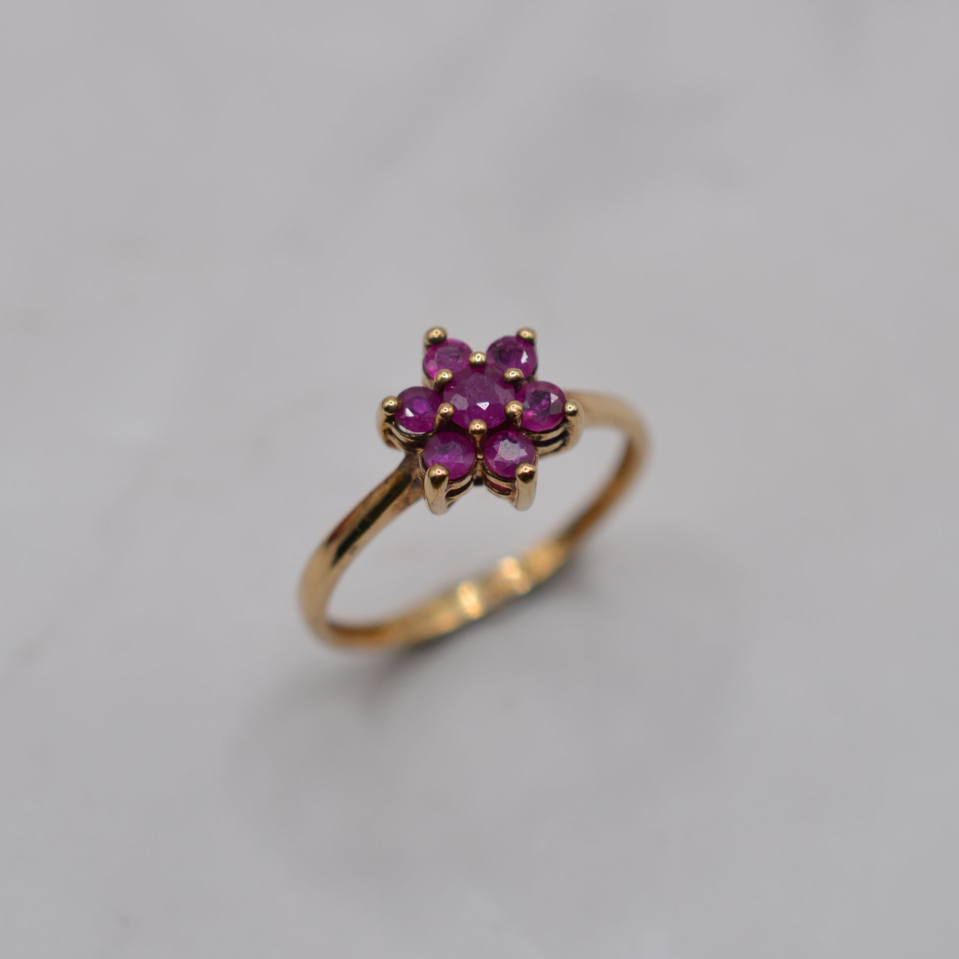 Such a cute little 9ct gold ruby floral cluster ring!! This sweet Y2K-era piece features a rich pink ruby at the centre surrounded by six smaller pink rubies, forming a dainty flower-shaped cluster. The cluster itself measures approx. 8mm across, making it a delicate and charming design that’s perfect for everyday wear to add a pop of pretty pink colour.