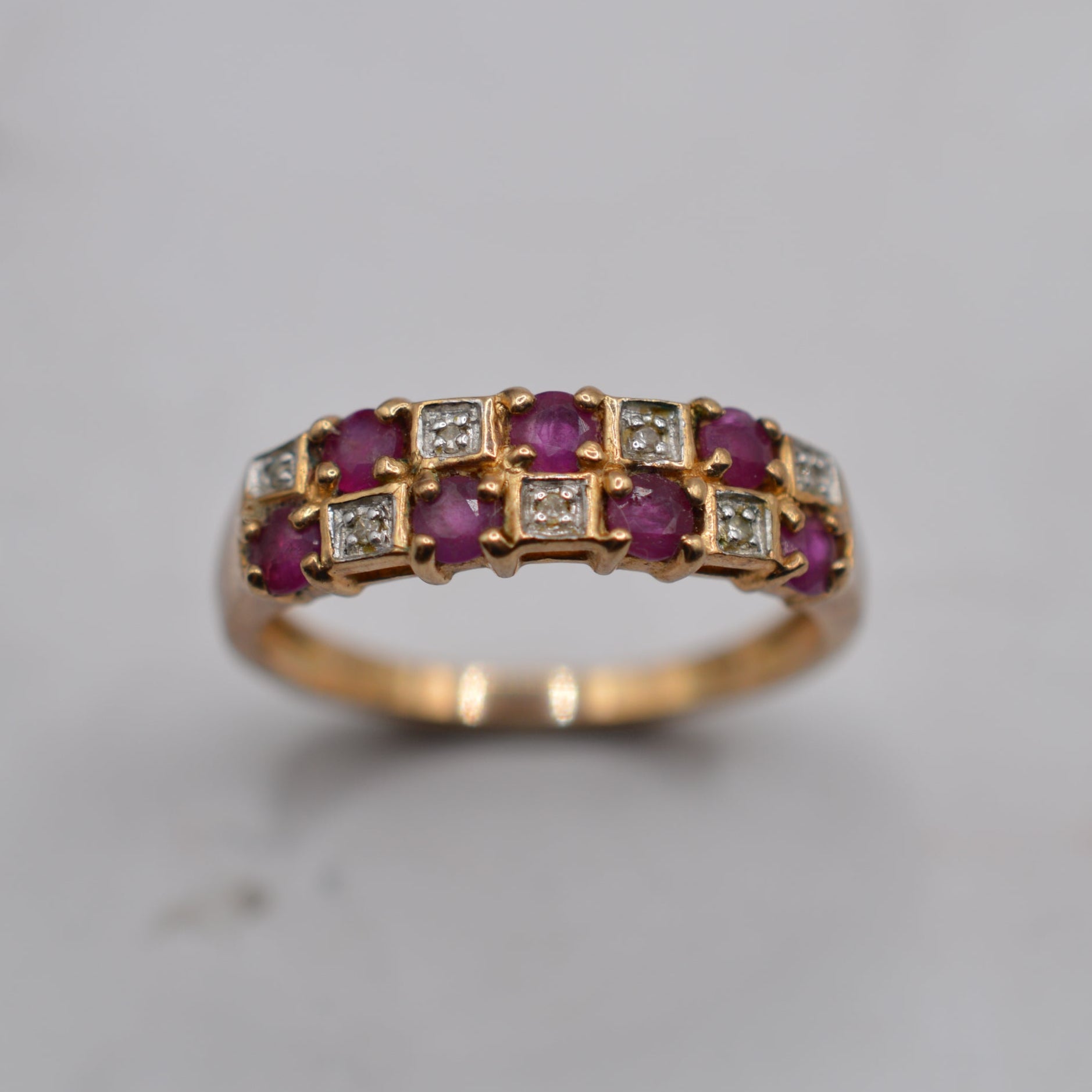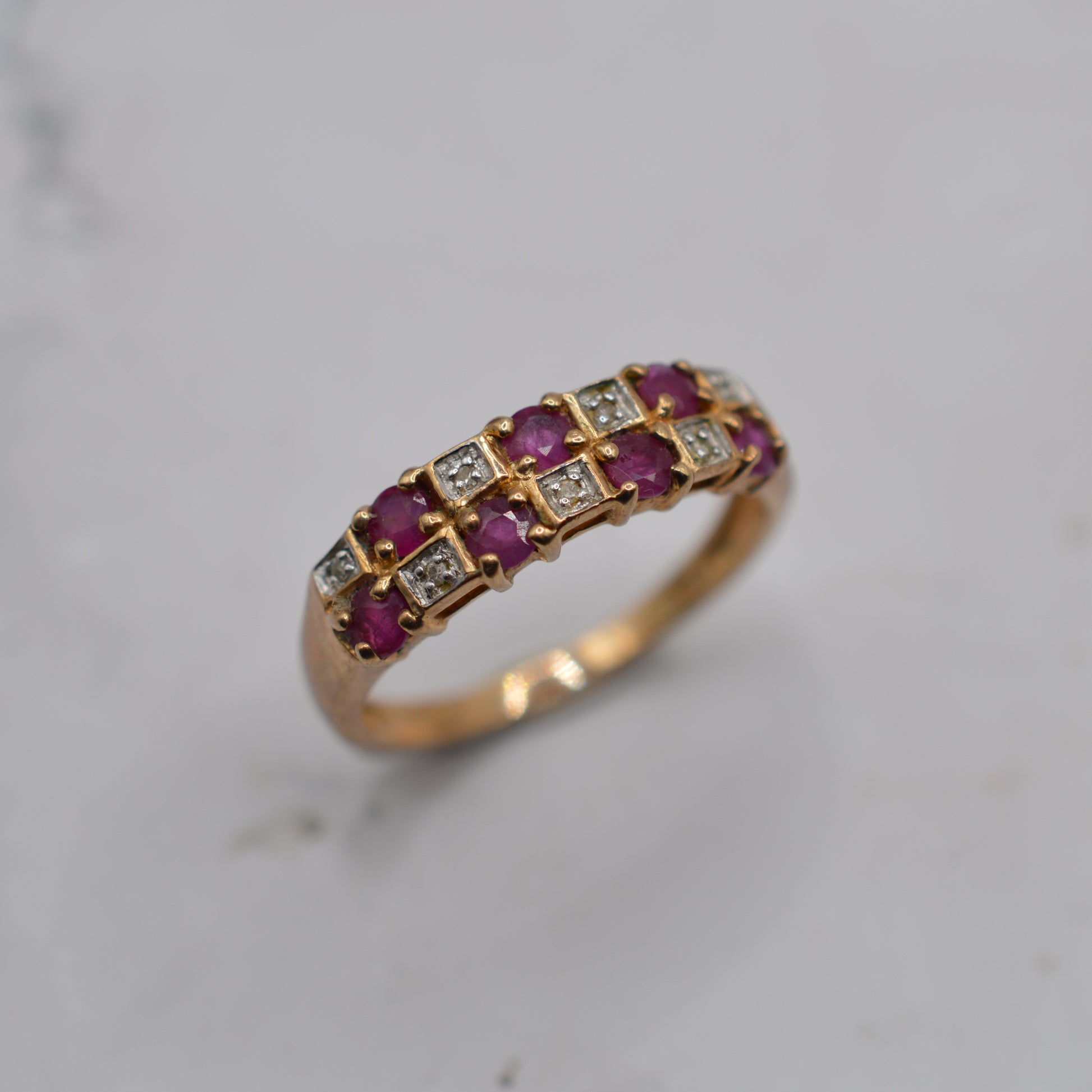 Such a beautiful 9ct gold ruby and diamond half-eternity ring! This gorgeous design features two rows of gemstones in a checkerboard pattern, with ruby above diamond, then diamond above ruby, and so on. The rubies are round-cut and in a wonderful deep shade of pink, while the little diamonds chips add an extra touch of sparkle. An unusual twist on the classic eternity style, this piece is perfect for everyday wear or stacking with other band rings.