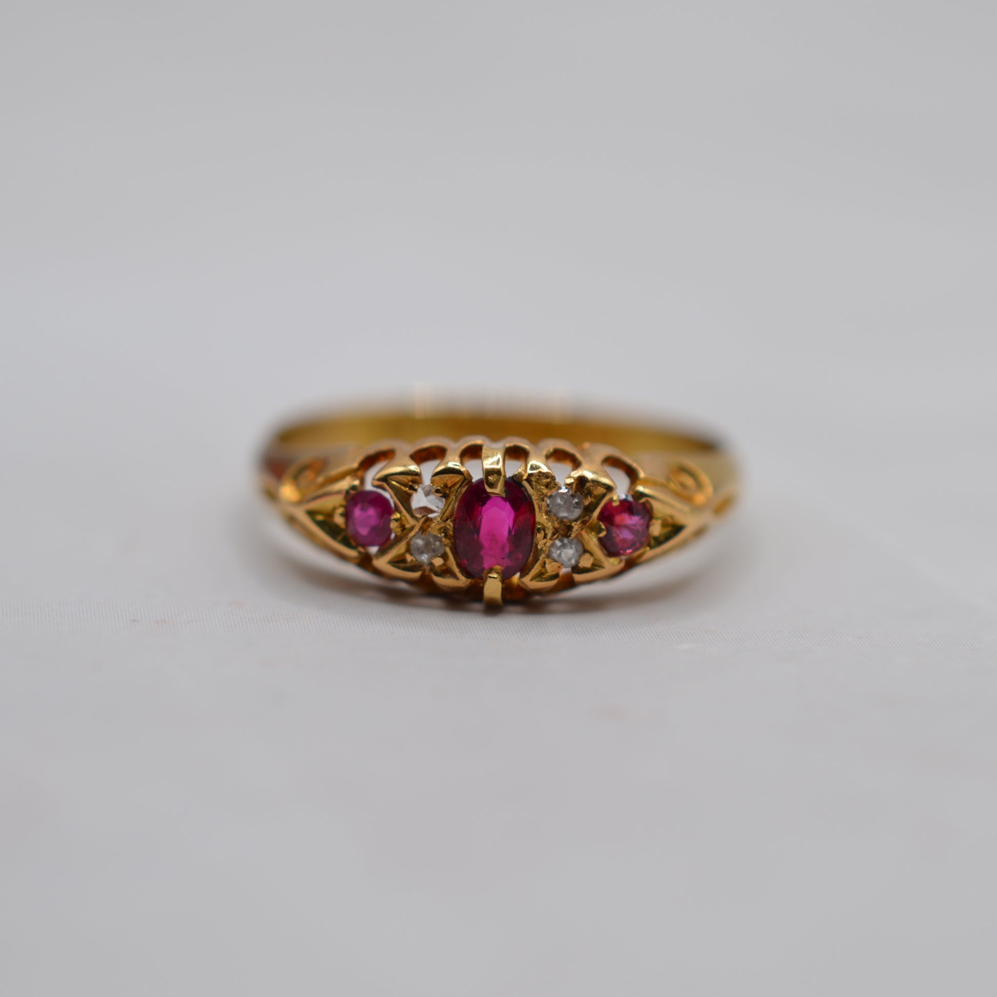 Antique 1909 Edwardian 18ct Gold Ruby & Diamond Boat Ring