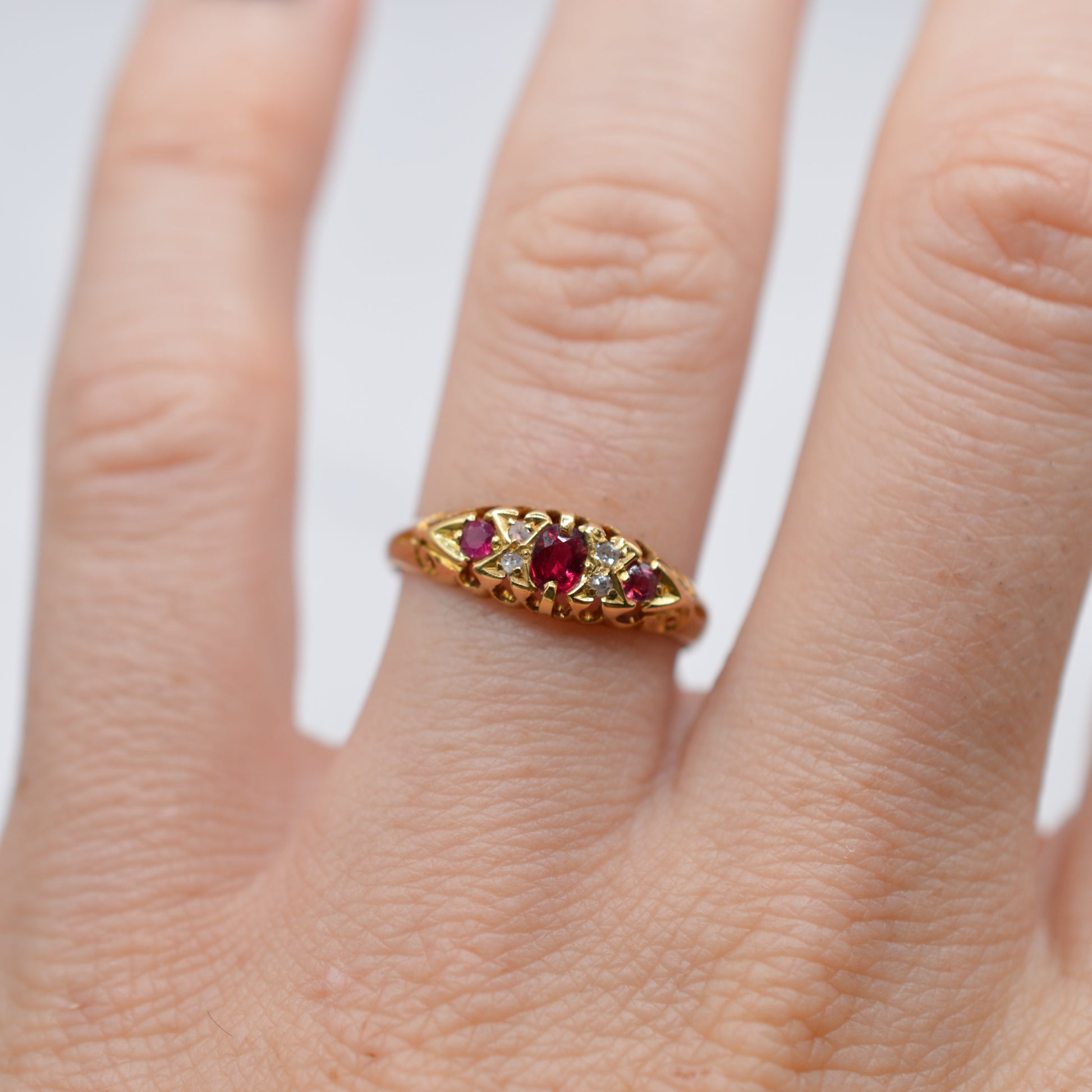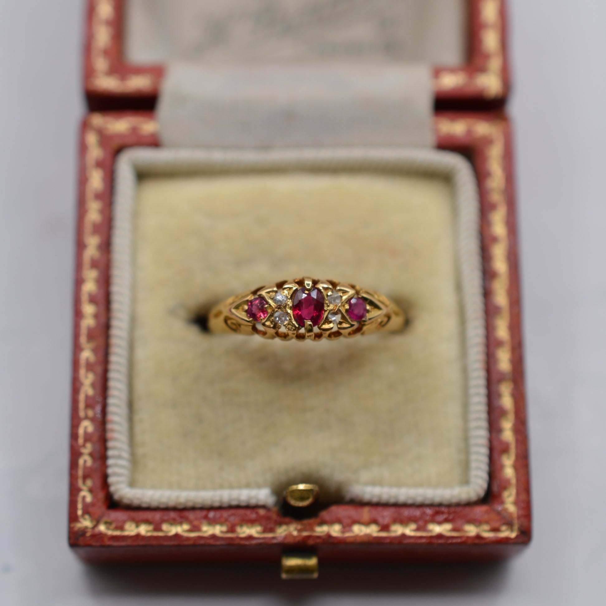A beautiful antique 18ct gold ruby and diamond boat ring from the Edwardian era! This elegant piece, dating to 1909, features three bright rubies, interspaced with four sparkling diamonds for extra twinkle. The classic boat-shaped setting is finished with adorable swirl details at either end, all crafted in rich buttery yellow gold. A fabulously traditional Edwardian design for lovers of antique fine jewellery.