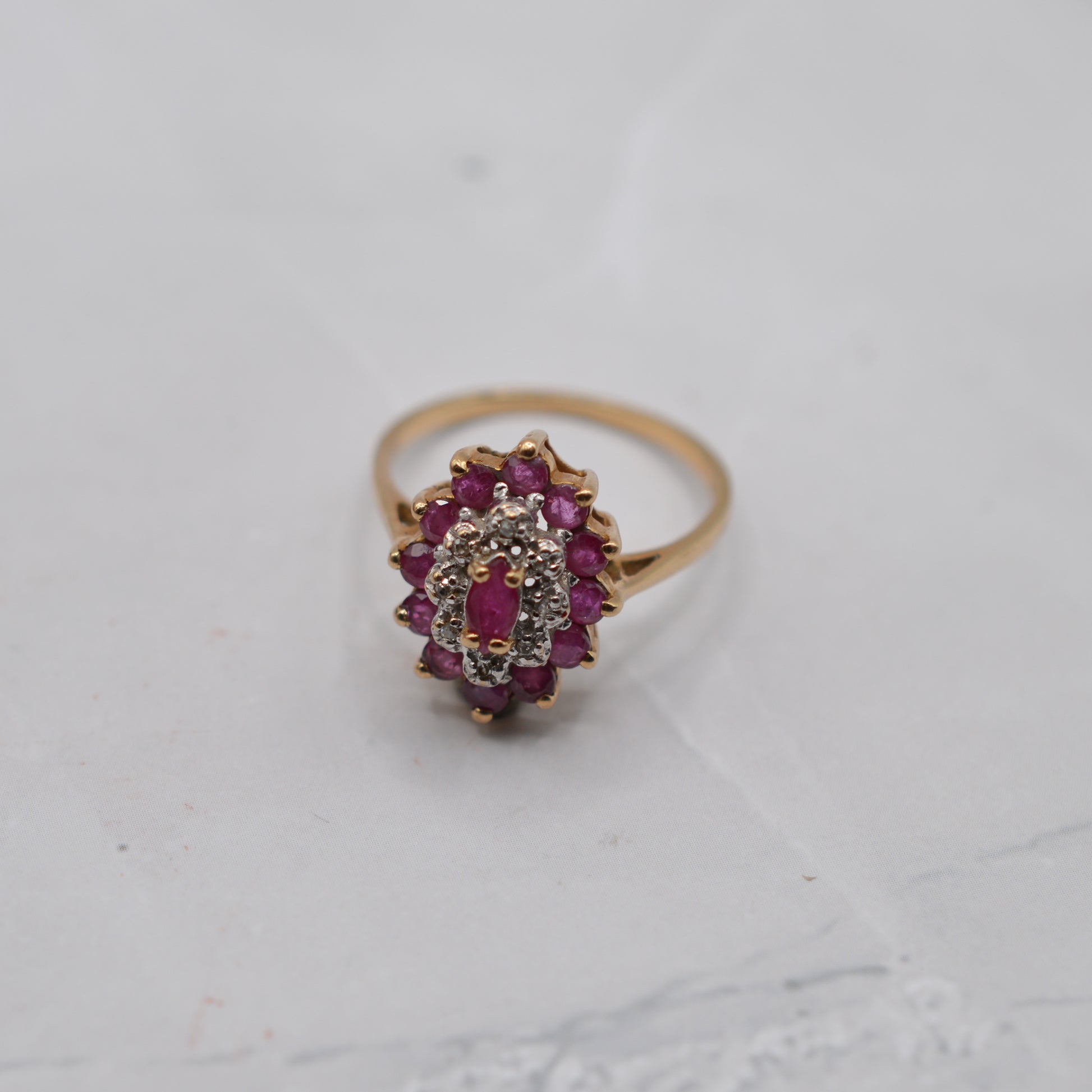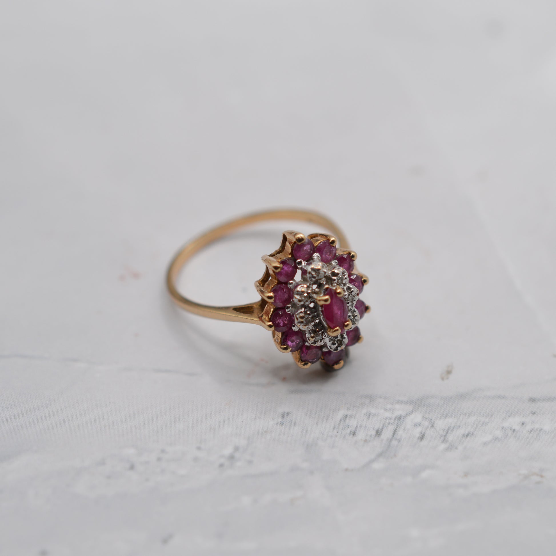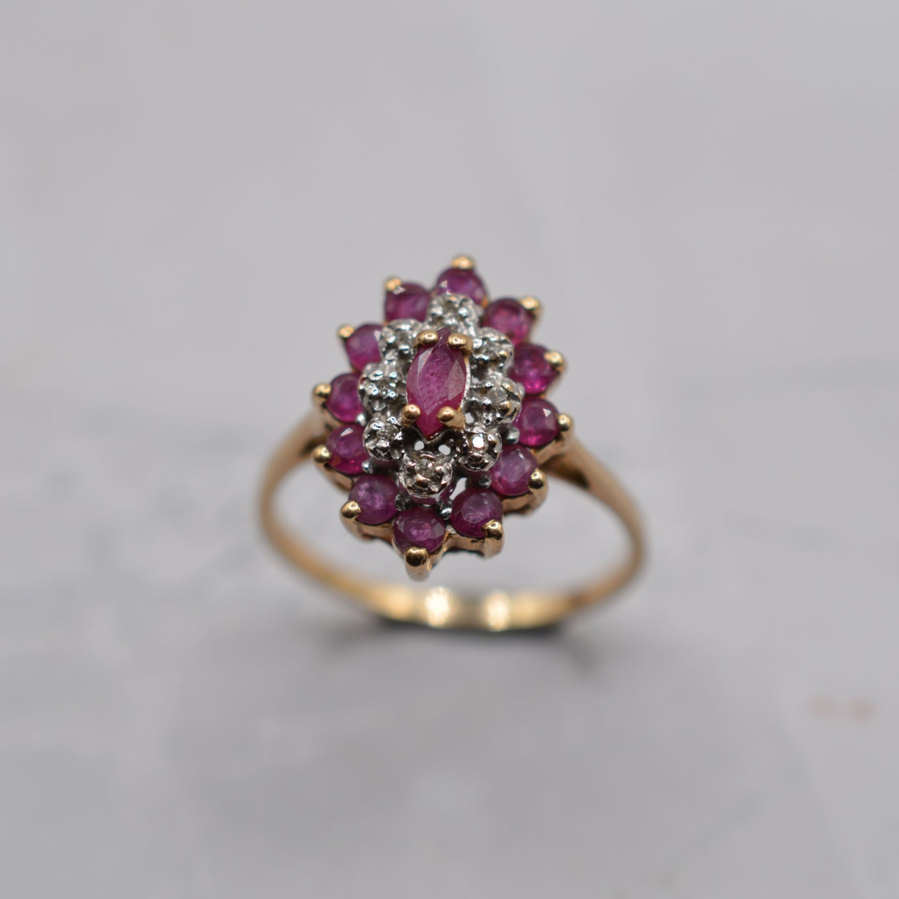 1980s 9ct Gold Ruby & Diamond Marquise Cluster Ring