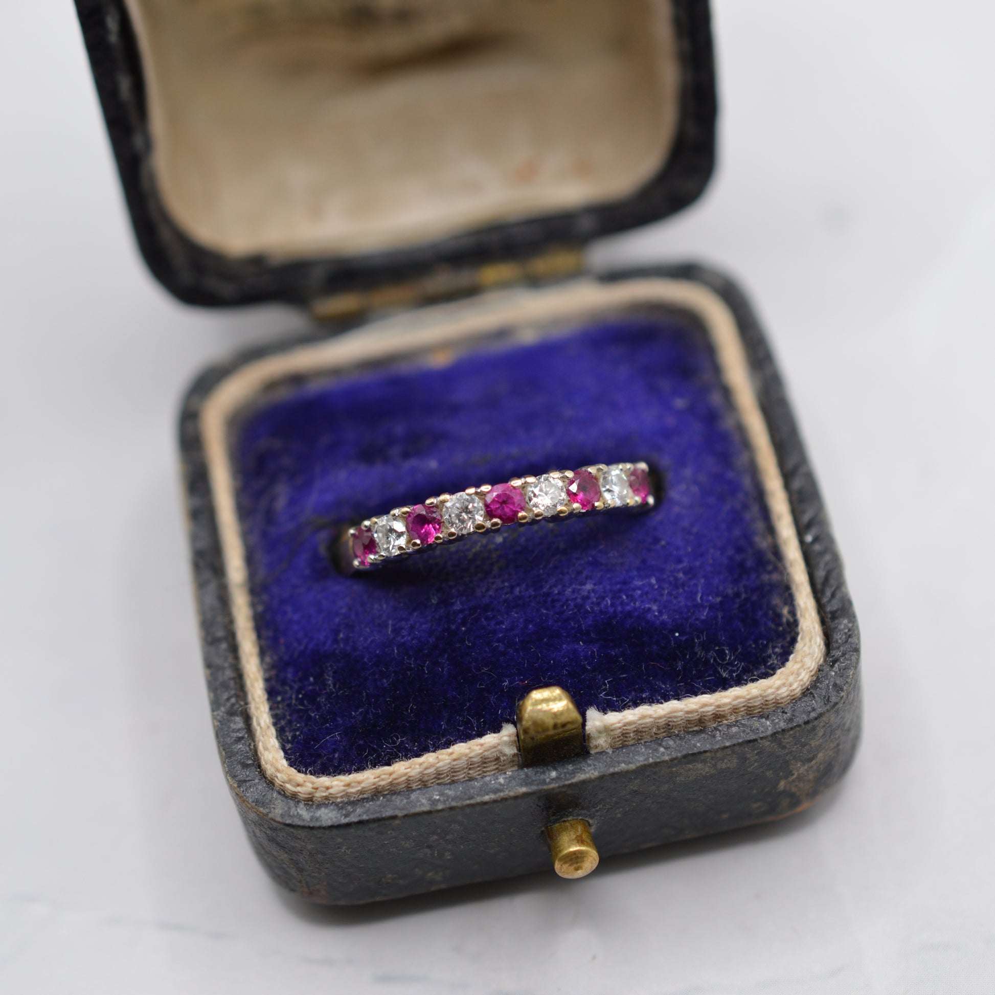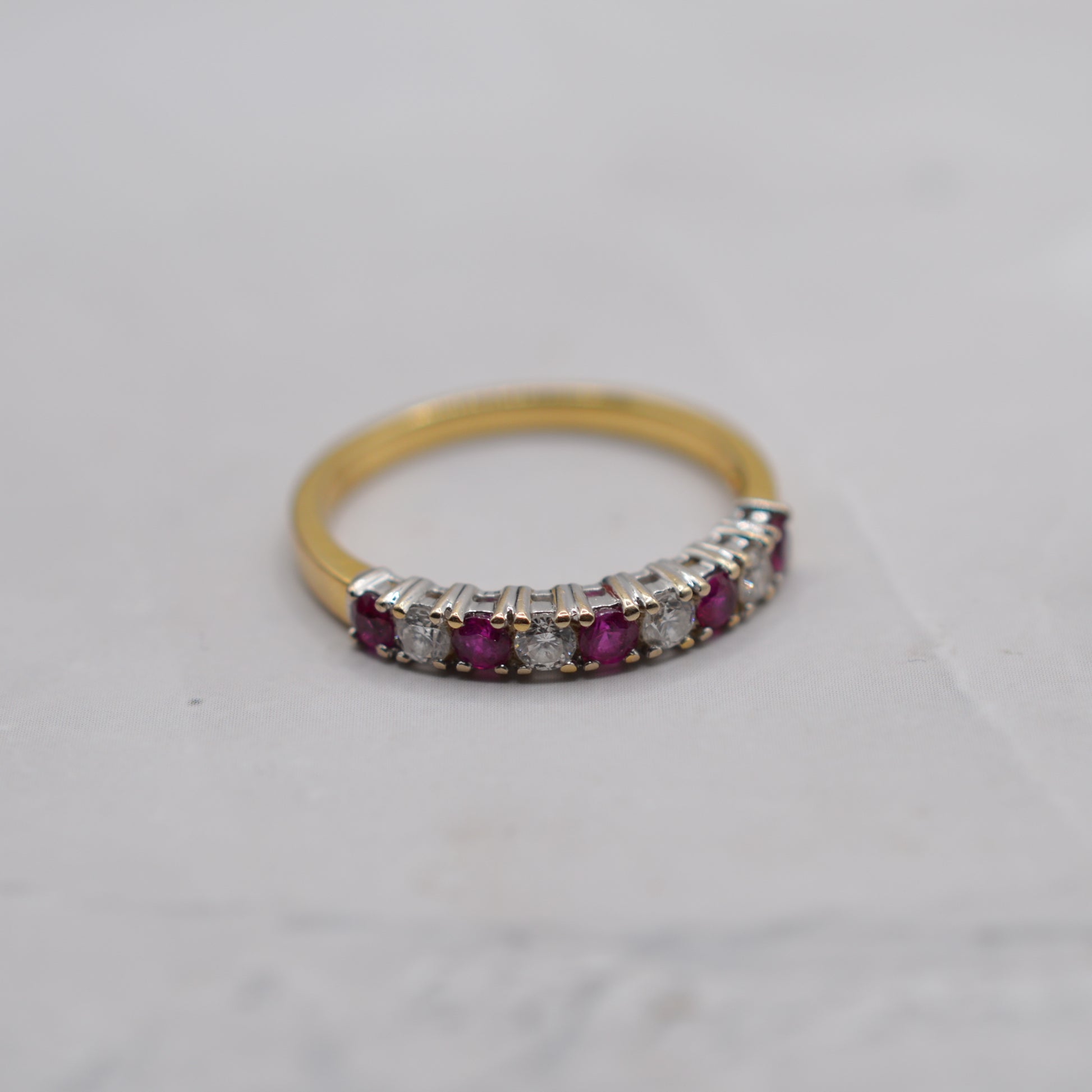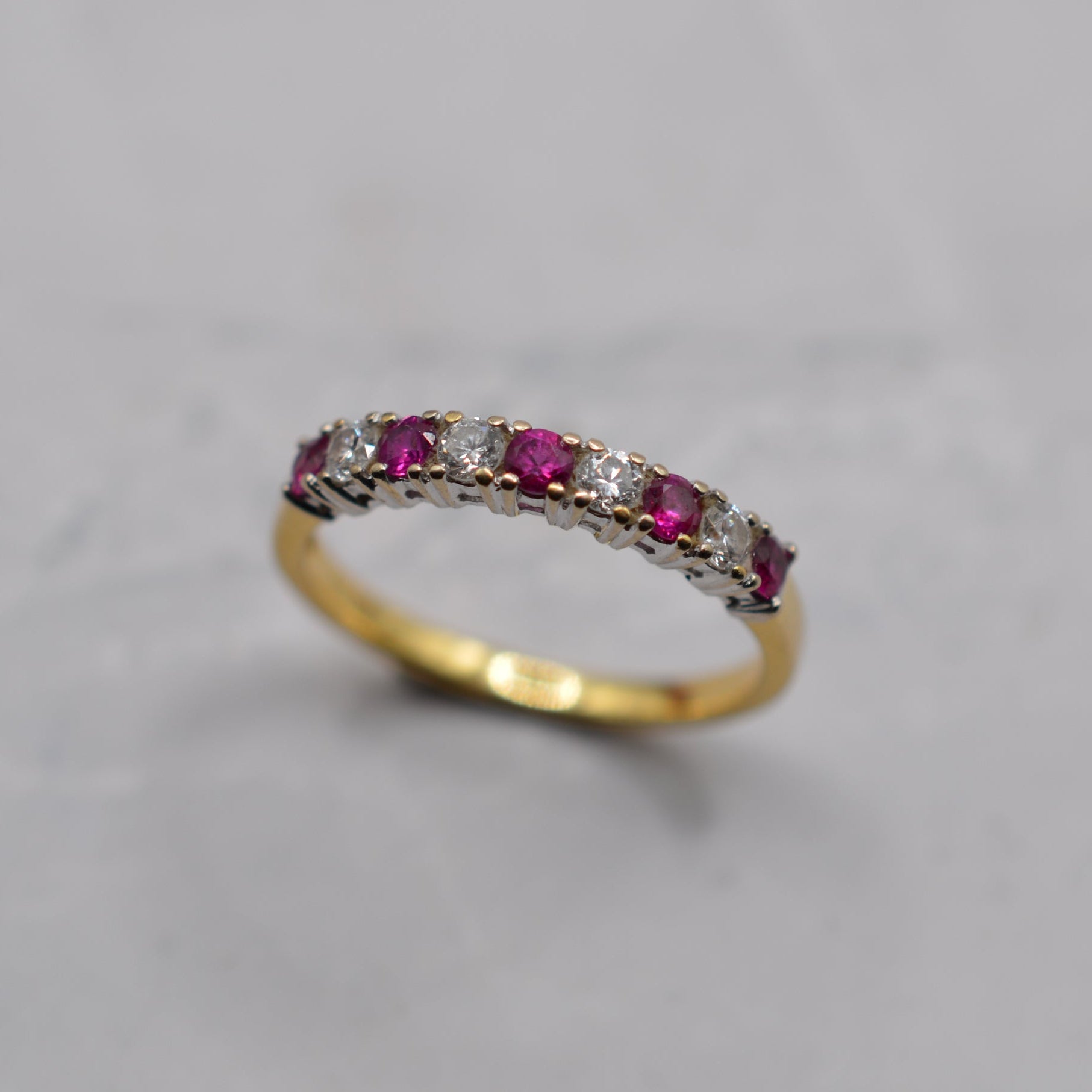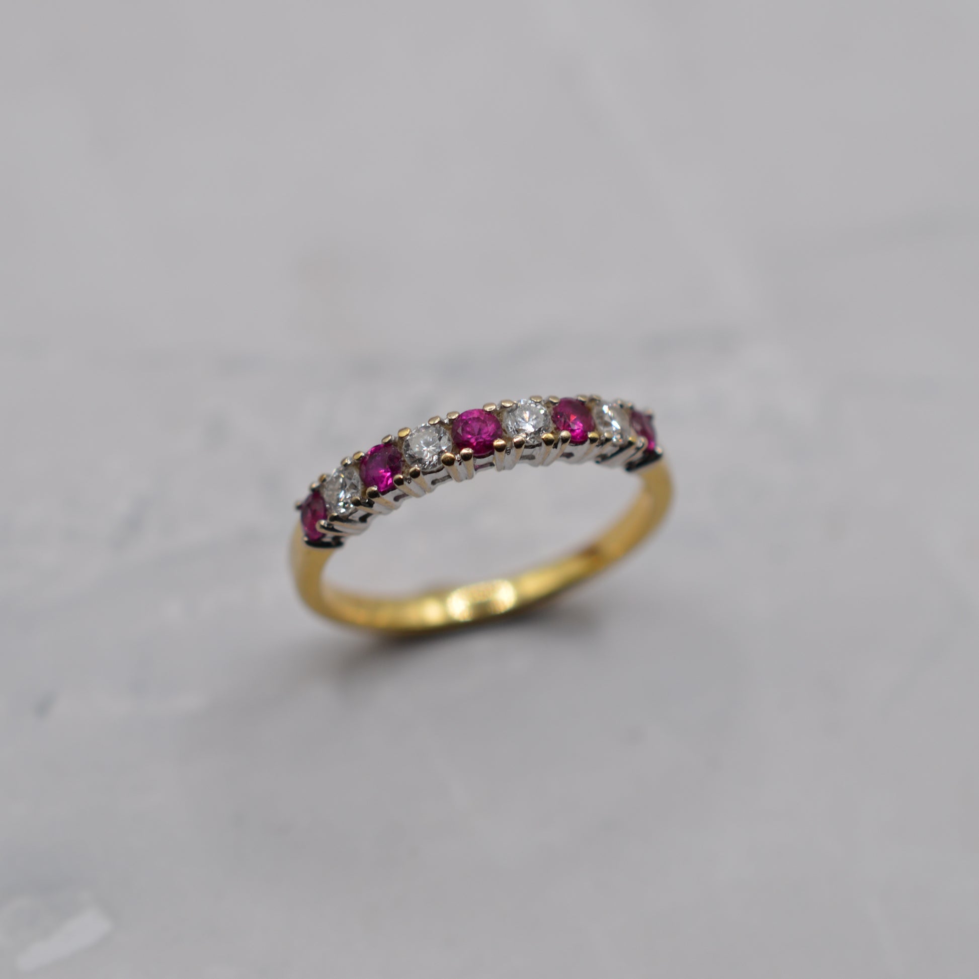 An utterly stunning 18ct gold ruby and diamond half-eternity ring. This elegant, luxurious piece features nine sparkling gemstones -- five rich pink rubies and four bright diamonds -- set in an alternating row for a dazzling display. The stones are set in white gold claws to enhance their sparkle, while the band is crafted in a rich, buttery yellow gold that adds warm. Such a luxurious, high quality ring that looks gorgeous worn alone or stacked with others.