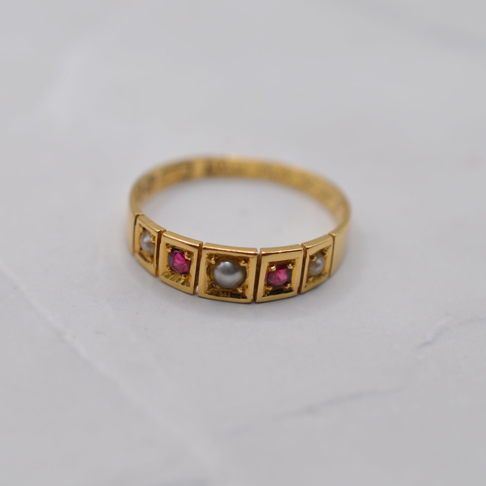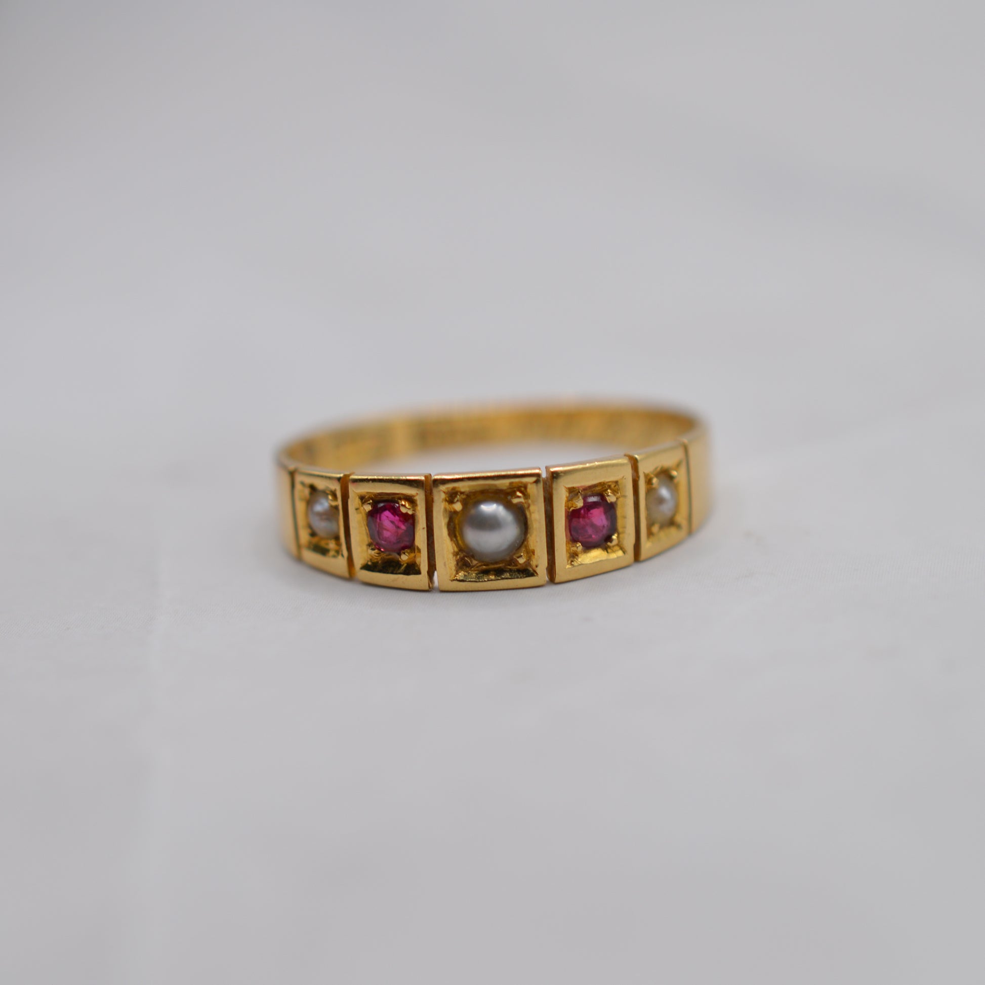 Antique 1897 18ct Gold Ruby & Pearl Five-Stone Ring
