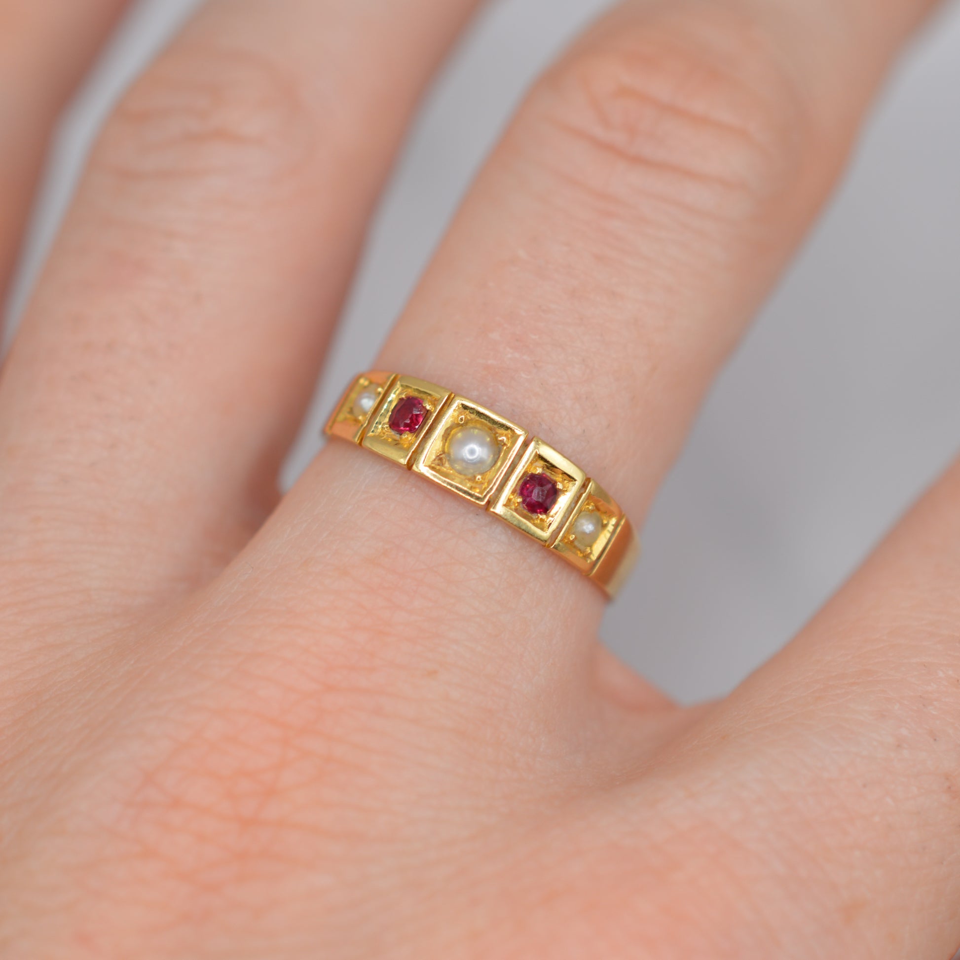 A truly beautiful late Victorian 18ct gold five-stone ring. Dated to 1897, this delightful treasure features an alternating row of rich pink rubies and white seed pearls, each framed in neat rectangular settings made of buttery yellow gold.