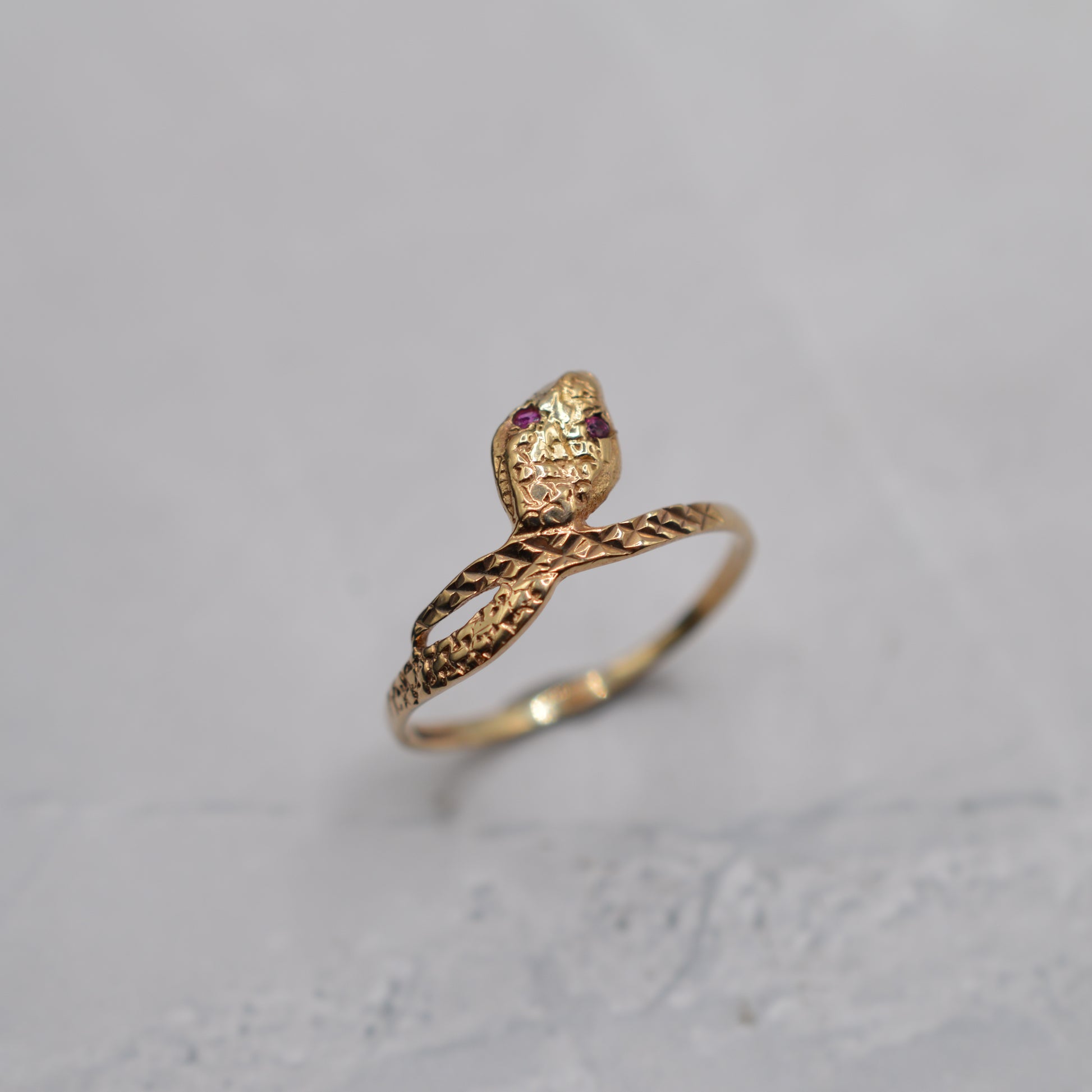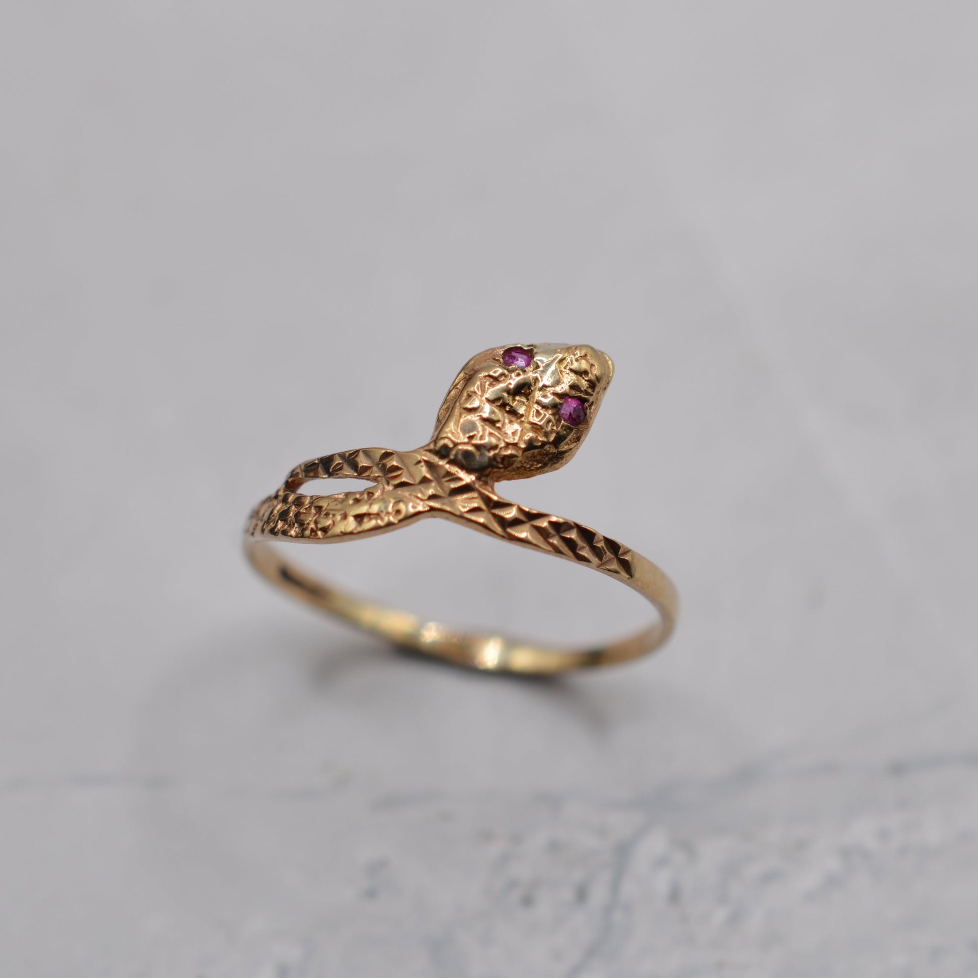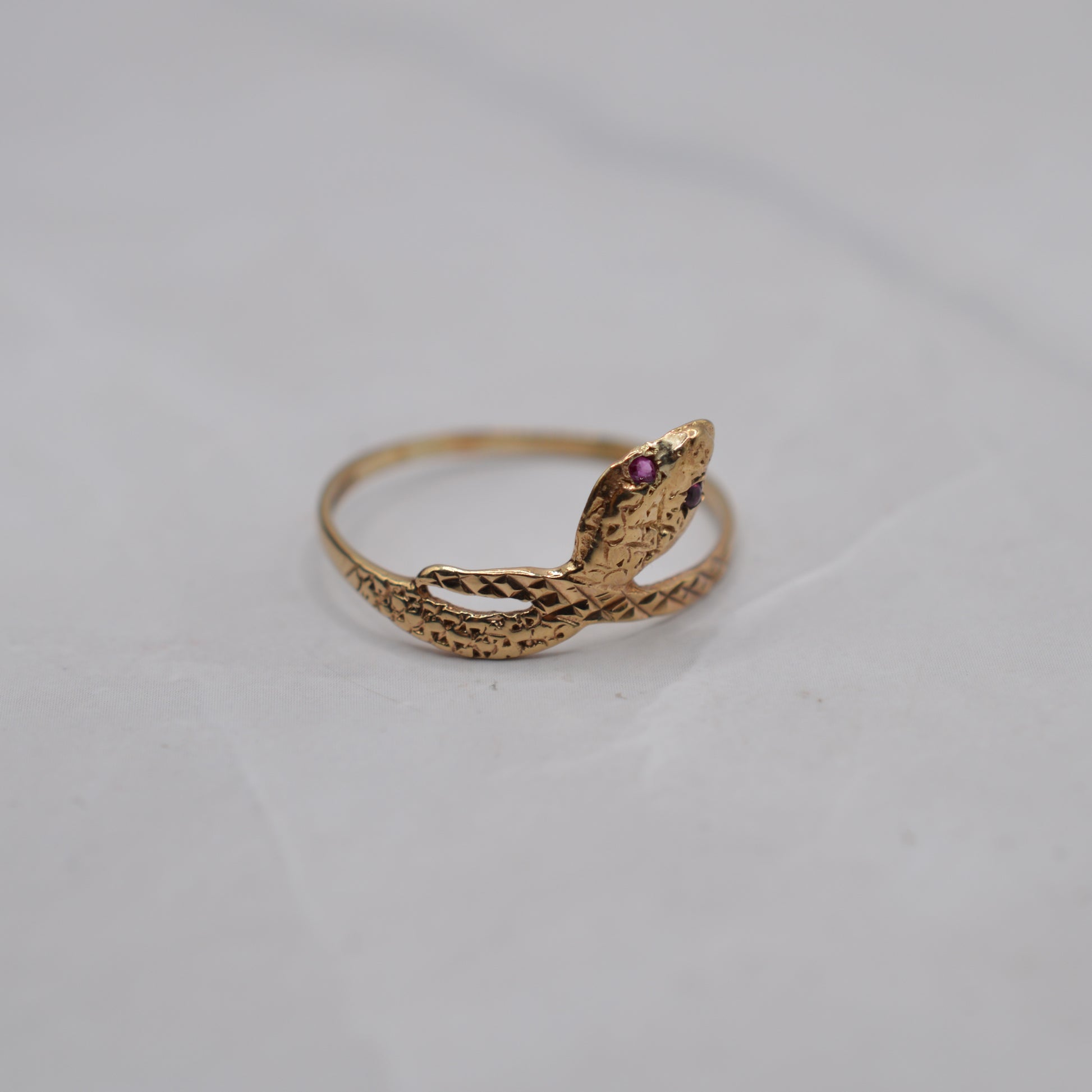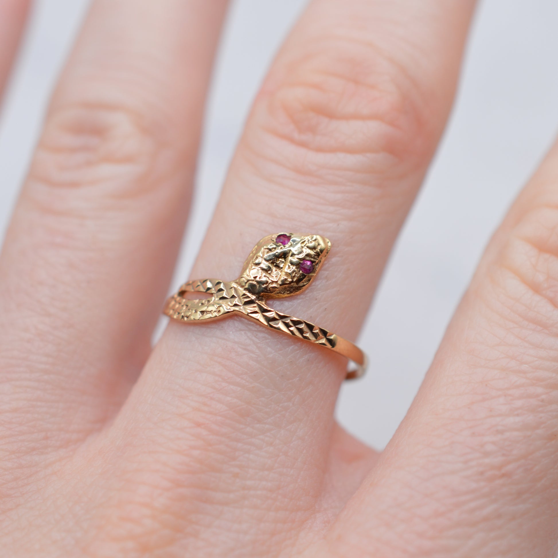 A sweet 9ct gold ruby snake ring! This charming little piece features a snake formation, with the head set with tiny little pink ruby eyes and the body and offering engraved scale detailing, the tail then wrapping over the body in a classic crossover design. Snake rings are always a wonderfully symbolic, Victorian-inspired and popular motif - don't miss it!