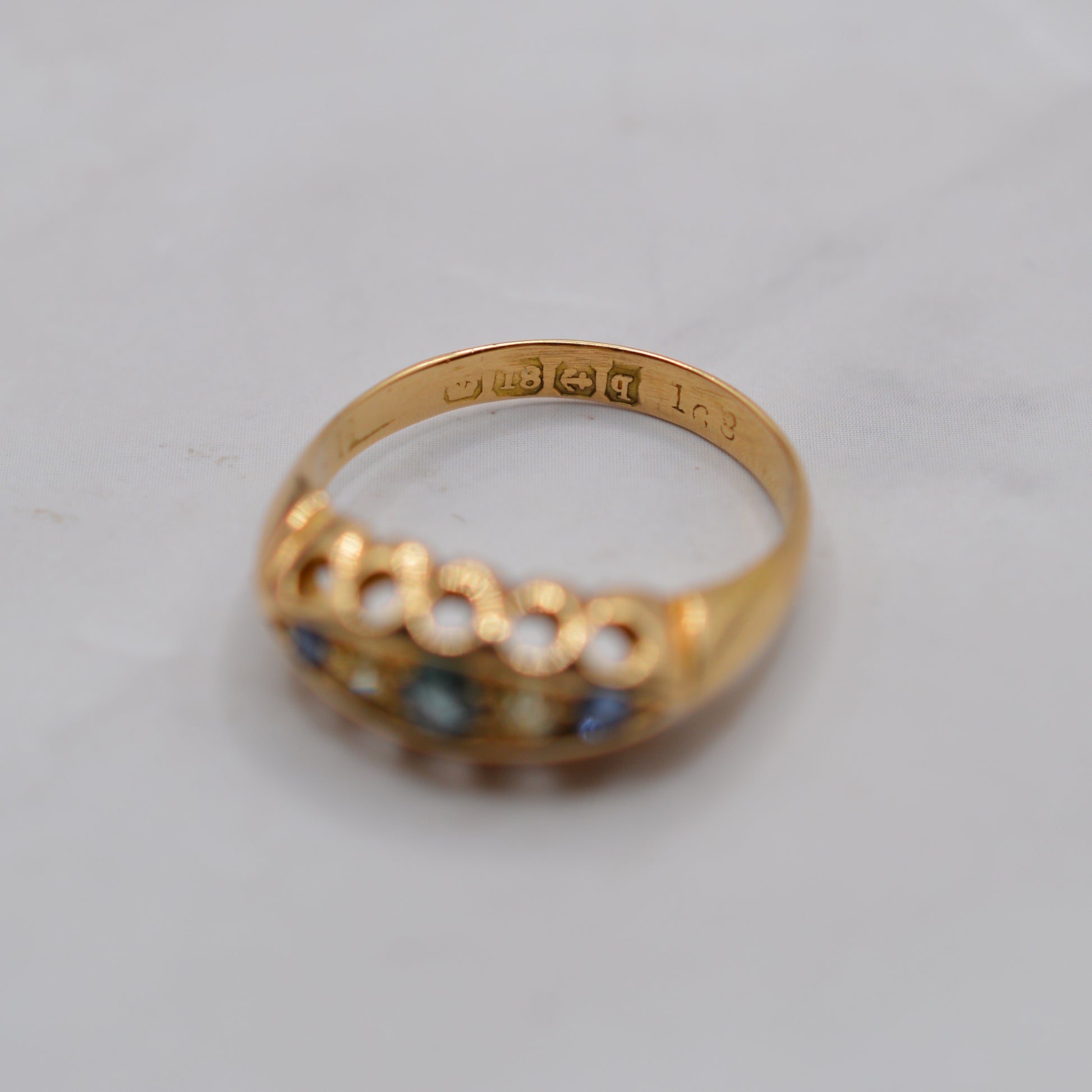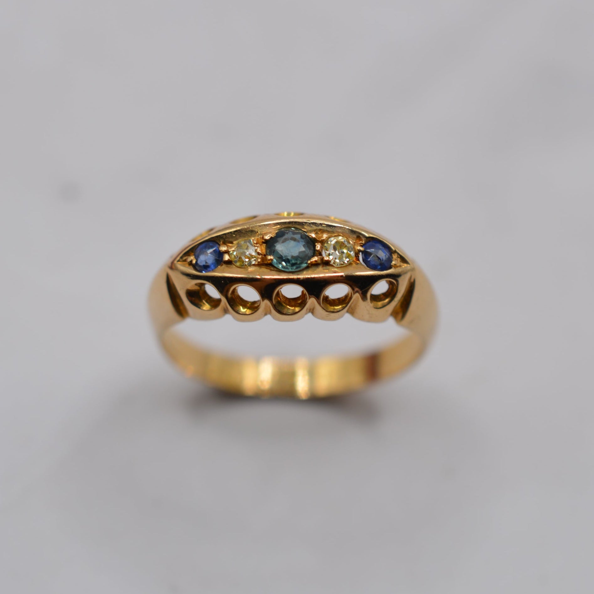 A rather lovely antique 18ct gold sapphire & diamond gypsy ring! Dating to 1915, at the crossover between Edwardian and George V eras, this gorgeous piece features a row of five alternating round sapphires and diamonds; the central sapphire has a slightly lighter tone that the outer sapphires, giving a multi-hue effect. The ring has a beautiful pierced gallery, a hallmark of Edwardian design, and weighs a substantial 3.4 grams of buttery yellow gold. A stunning and timeless antique treasure.